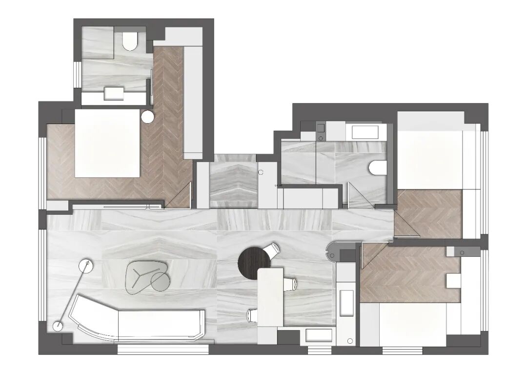 设计选材:突破材质应用的固有边界,通过“冷暖、软硬、虚实”的跨界材质组合,在简约空间中形成细腻的视觉与触觉对比,既保留简约的克制,又避免空间沉闷;“以材质对比营造层次”,无需复杂造型,仅通过材质本身的属性差异,就可让简约空间更具视觉张力。