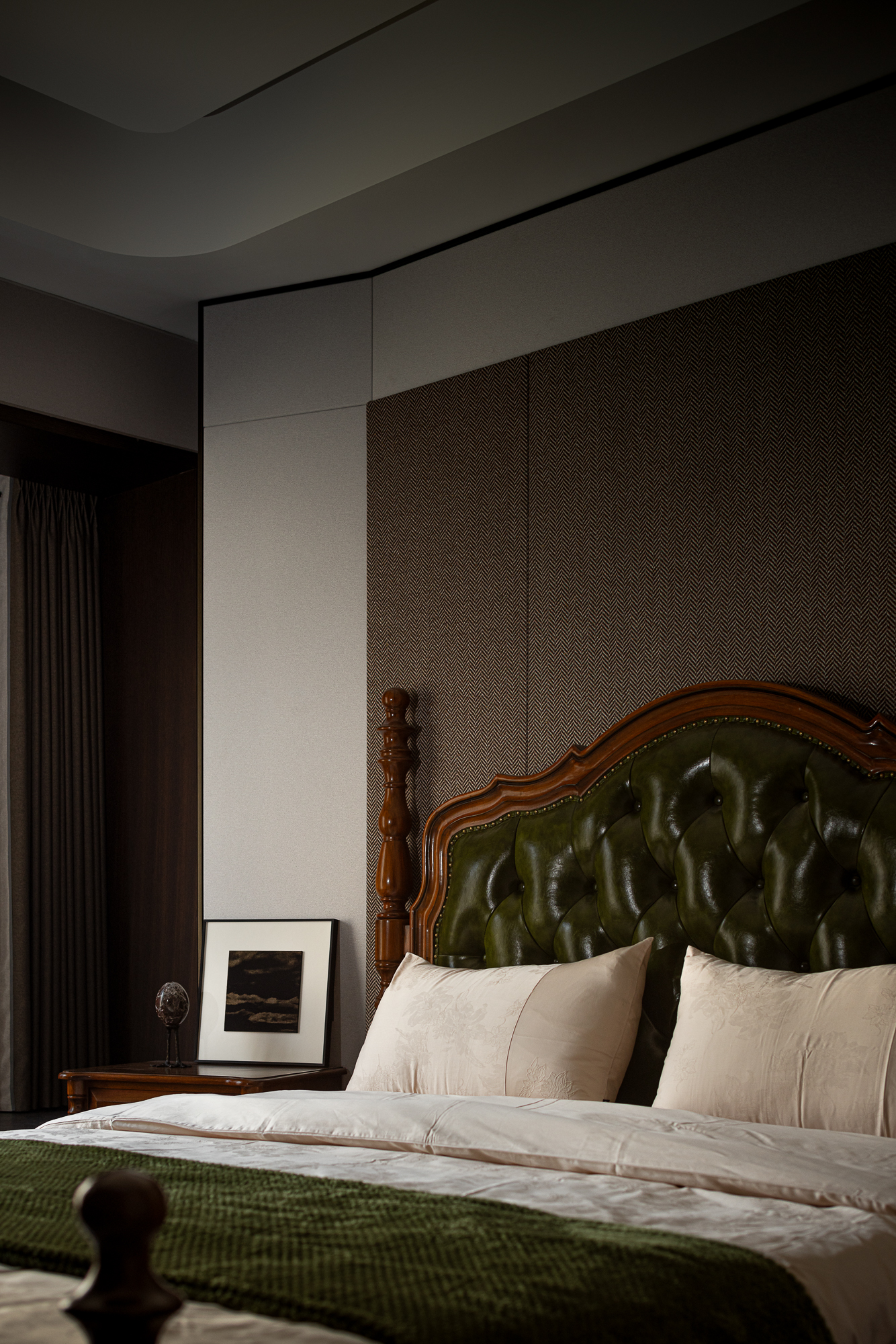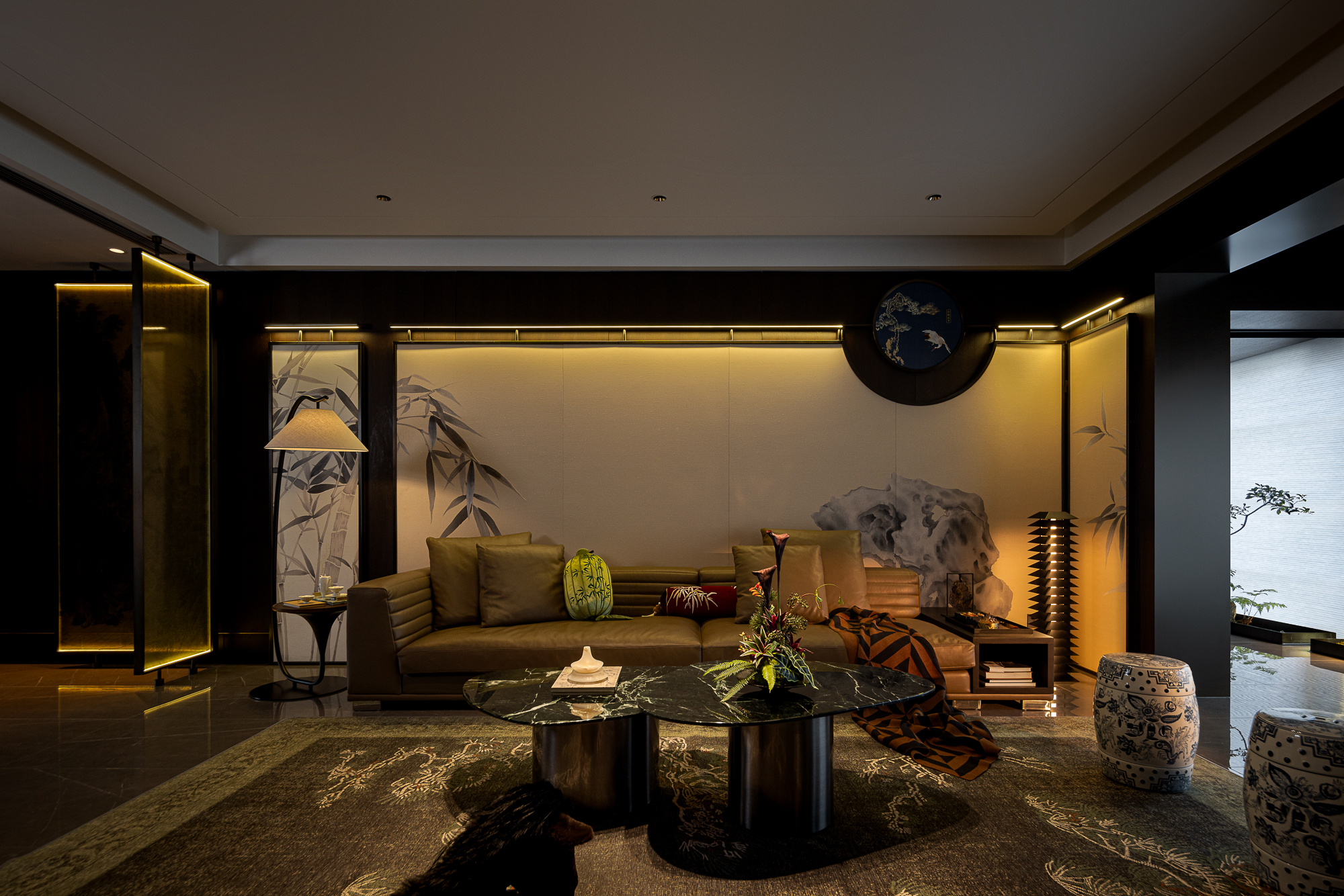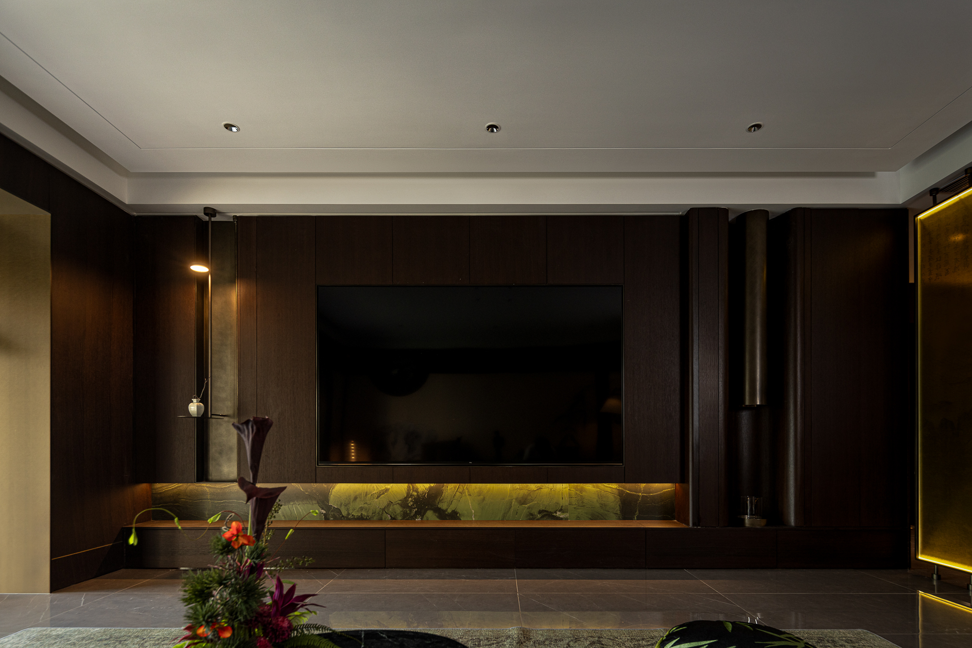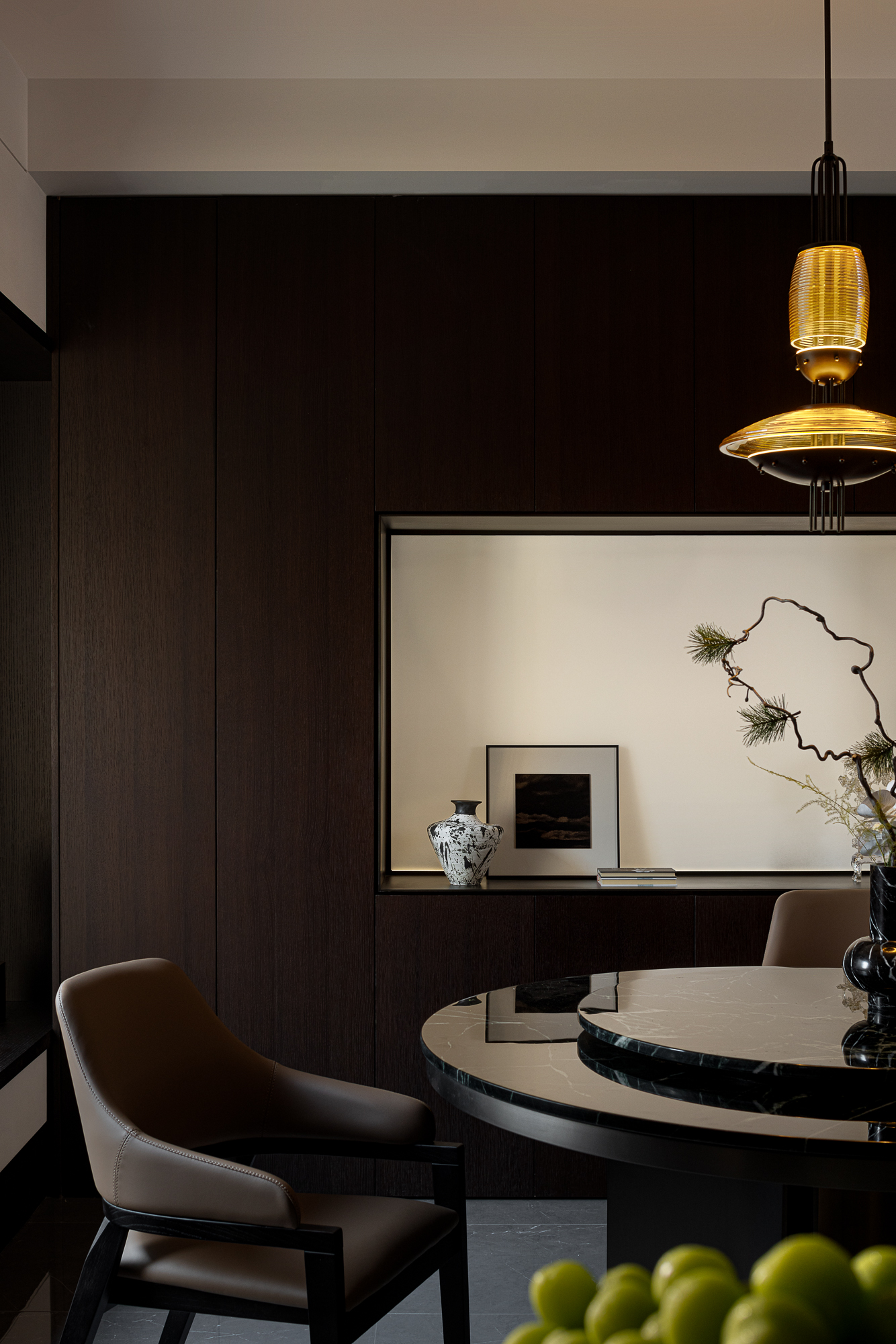 用户体验:以深沉、稳重的色调,展现出空间的沉静和雅致,青蓝色的艺术画与绿植为点缀,为空间增添艺术氛围。