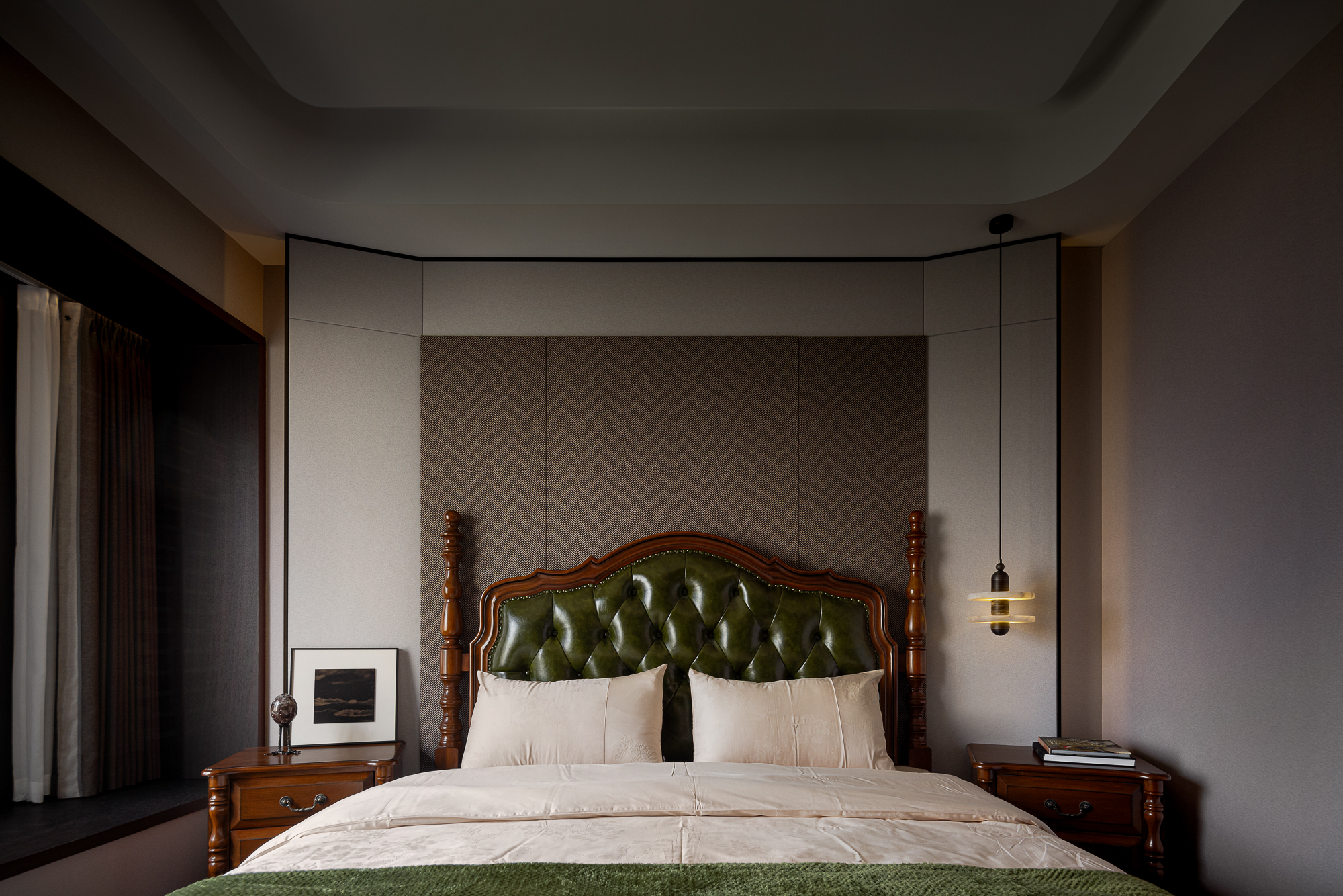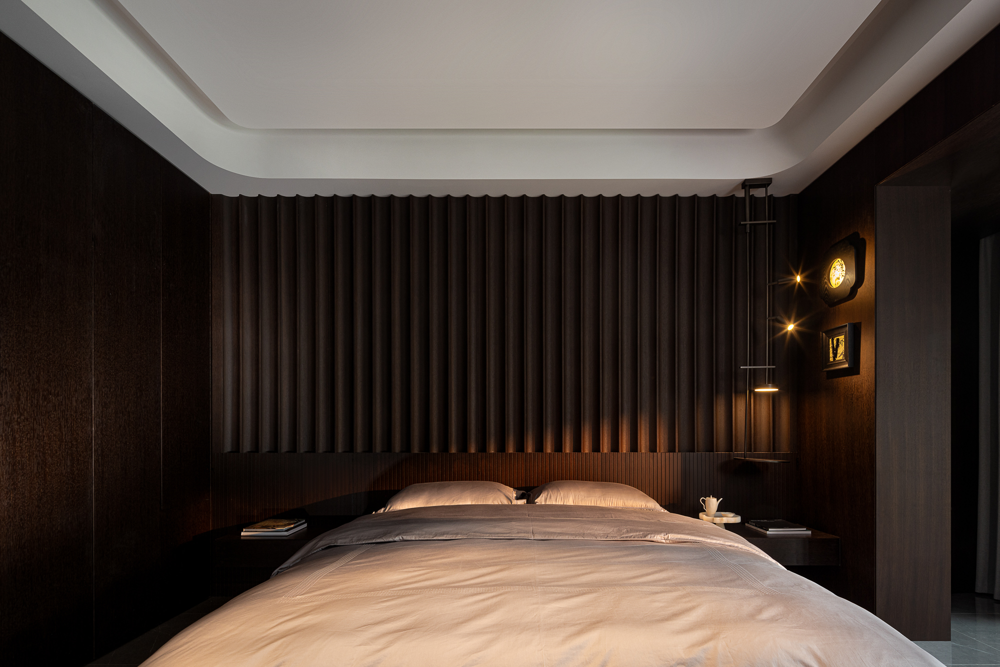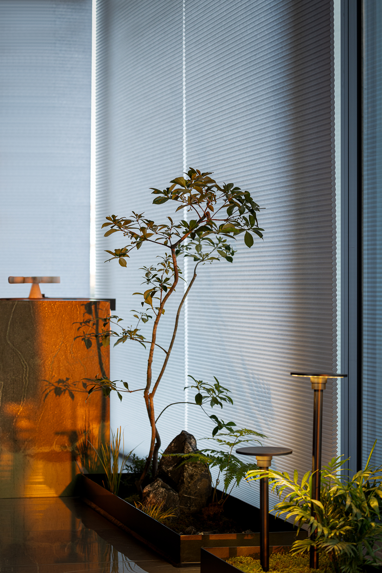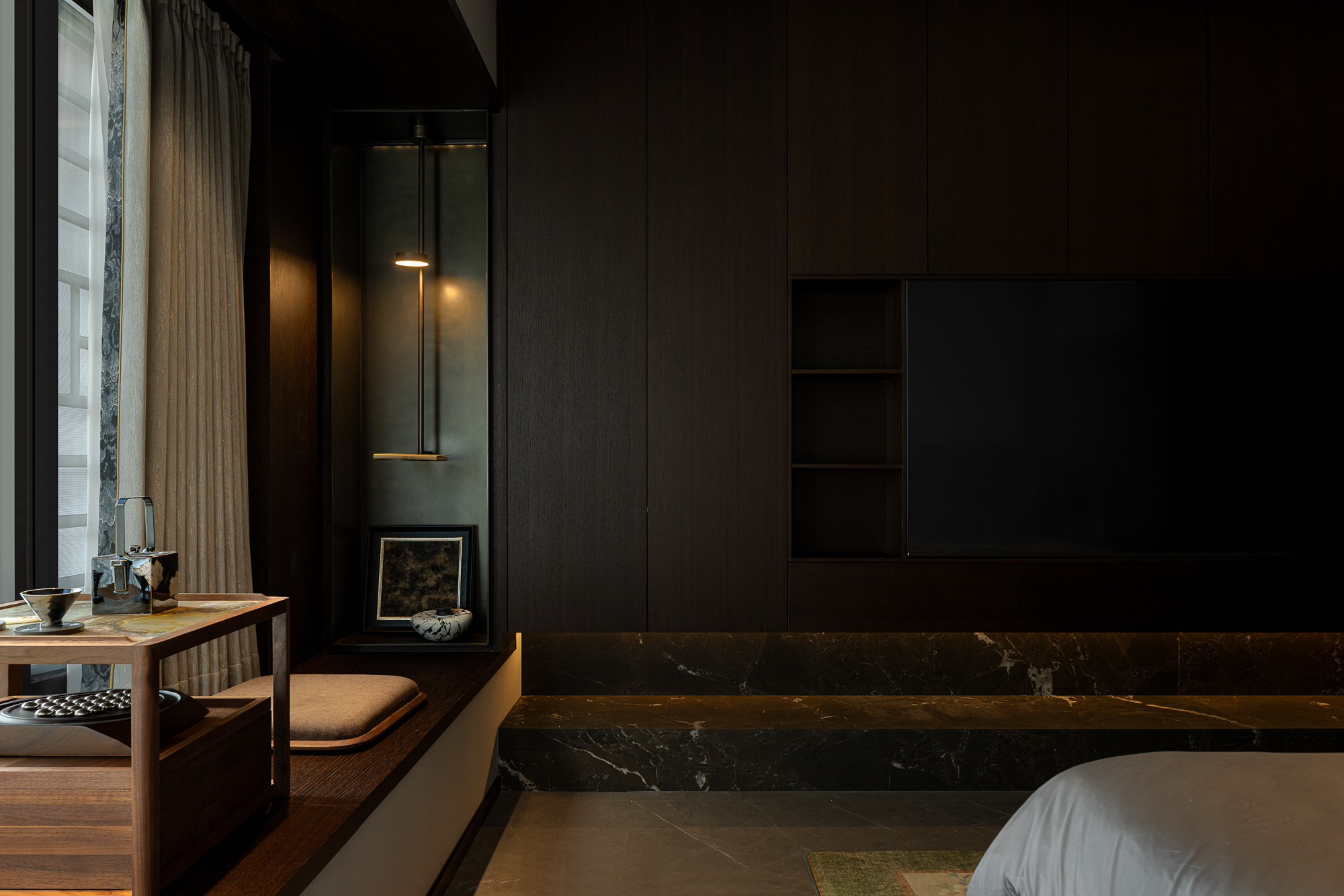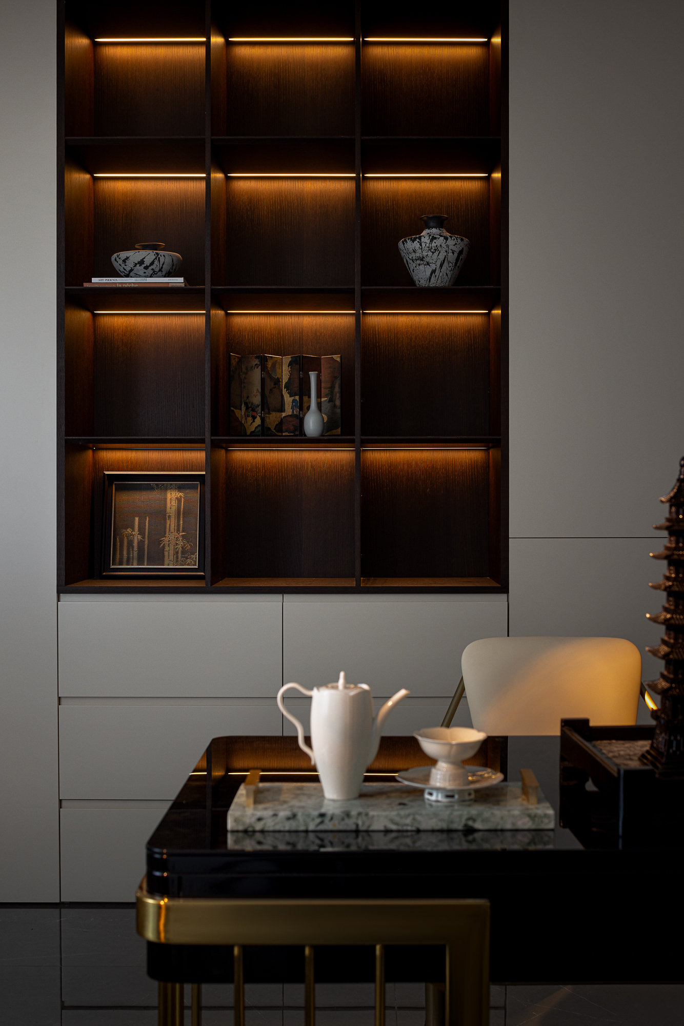 用户体验:以深沉、稳重的色调,展现出空间的沉静和雅致,青蓝色的艺术画与绿植为点缀,为空间增添艺术氛围。