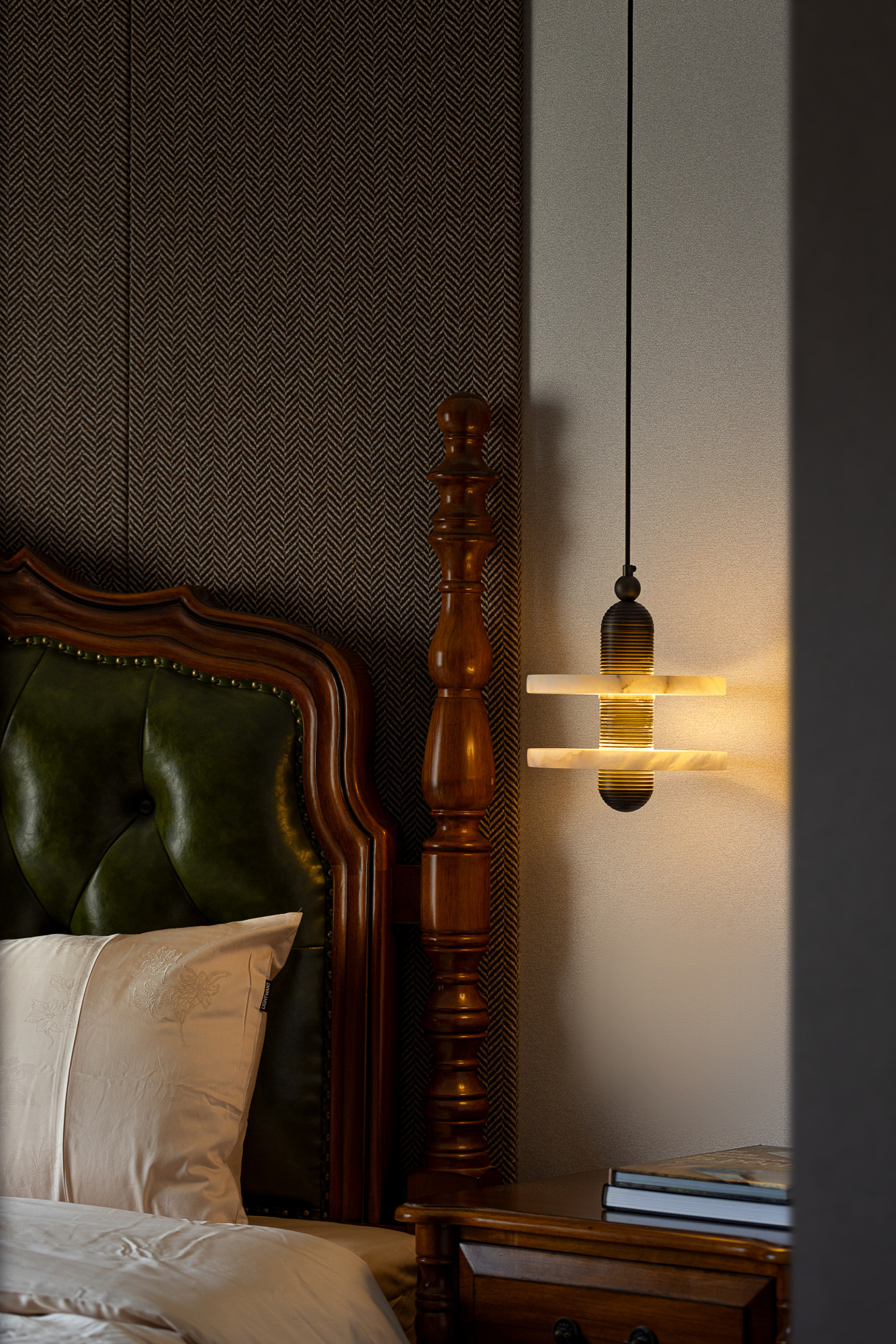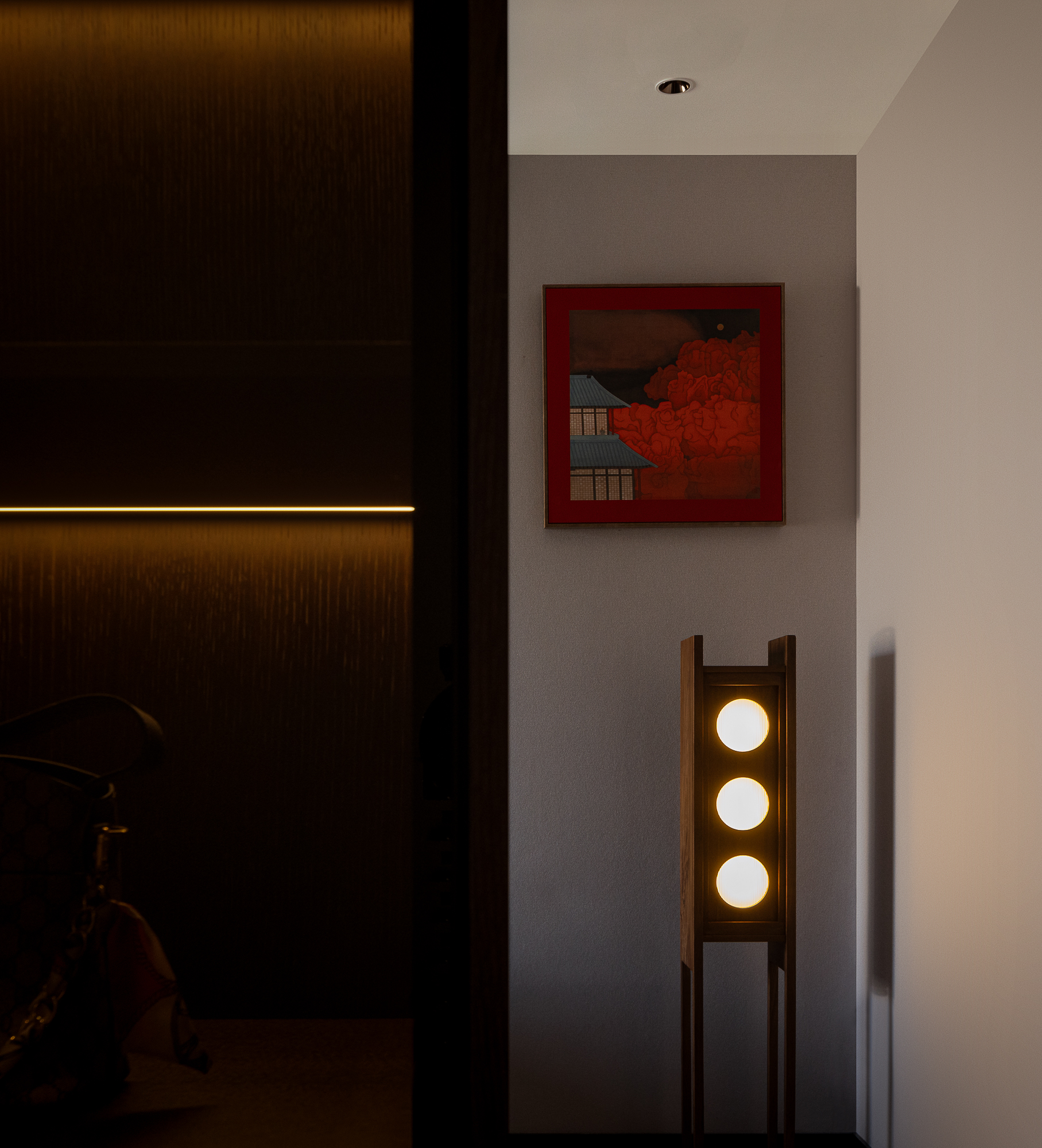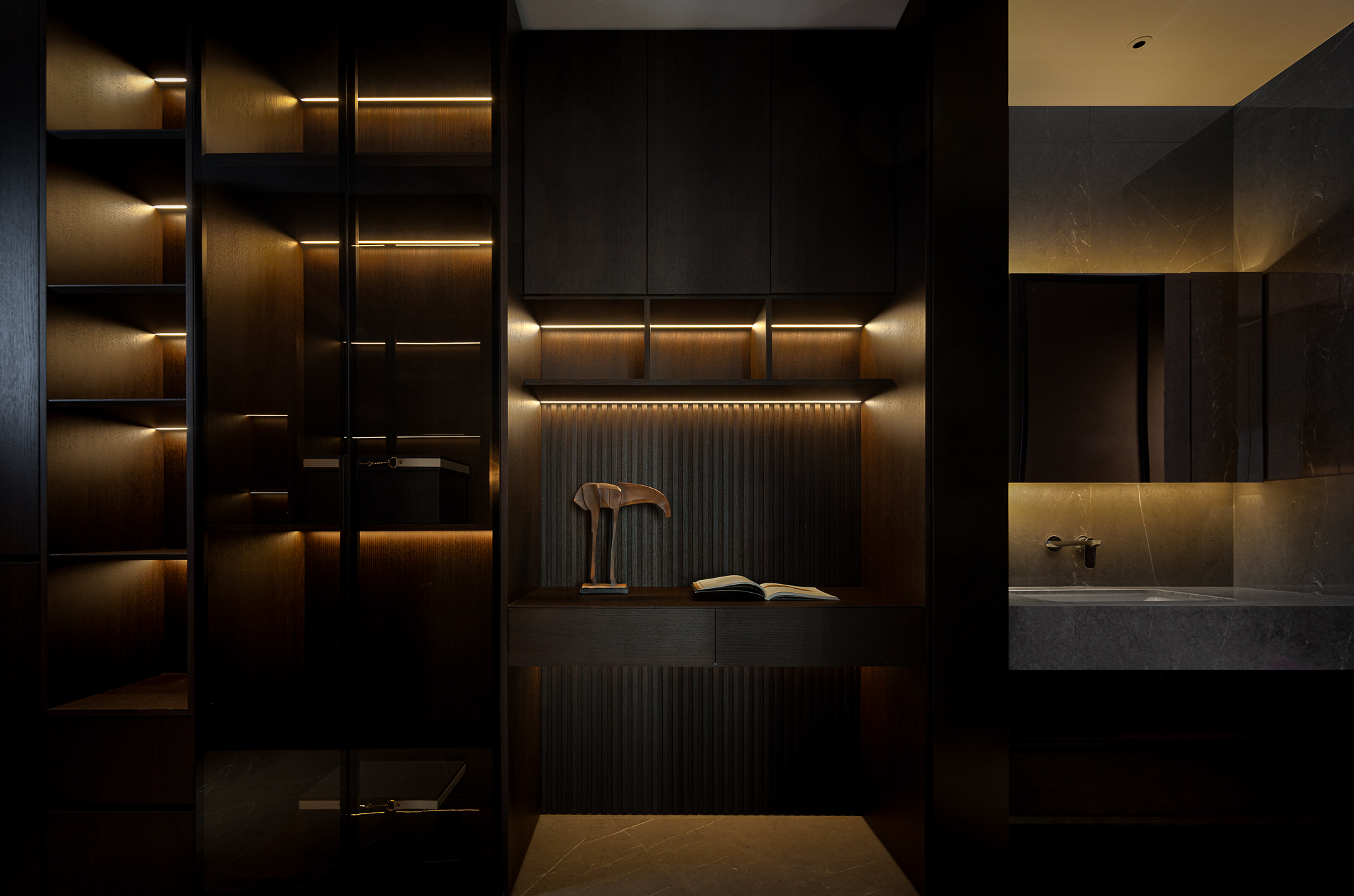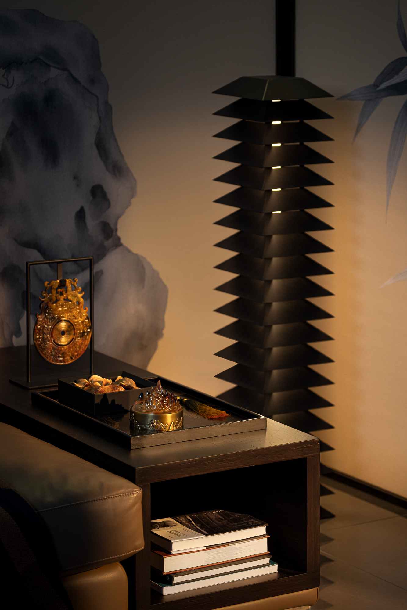 用户体验:以深沉、稳重的色调,展现出空间的沉静和雅致,青蓝色的艺术画与绿植为点缀,为空间增添艺术氛围。