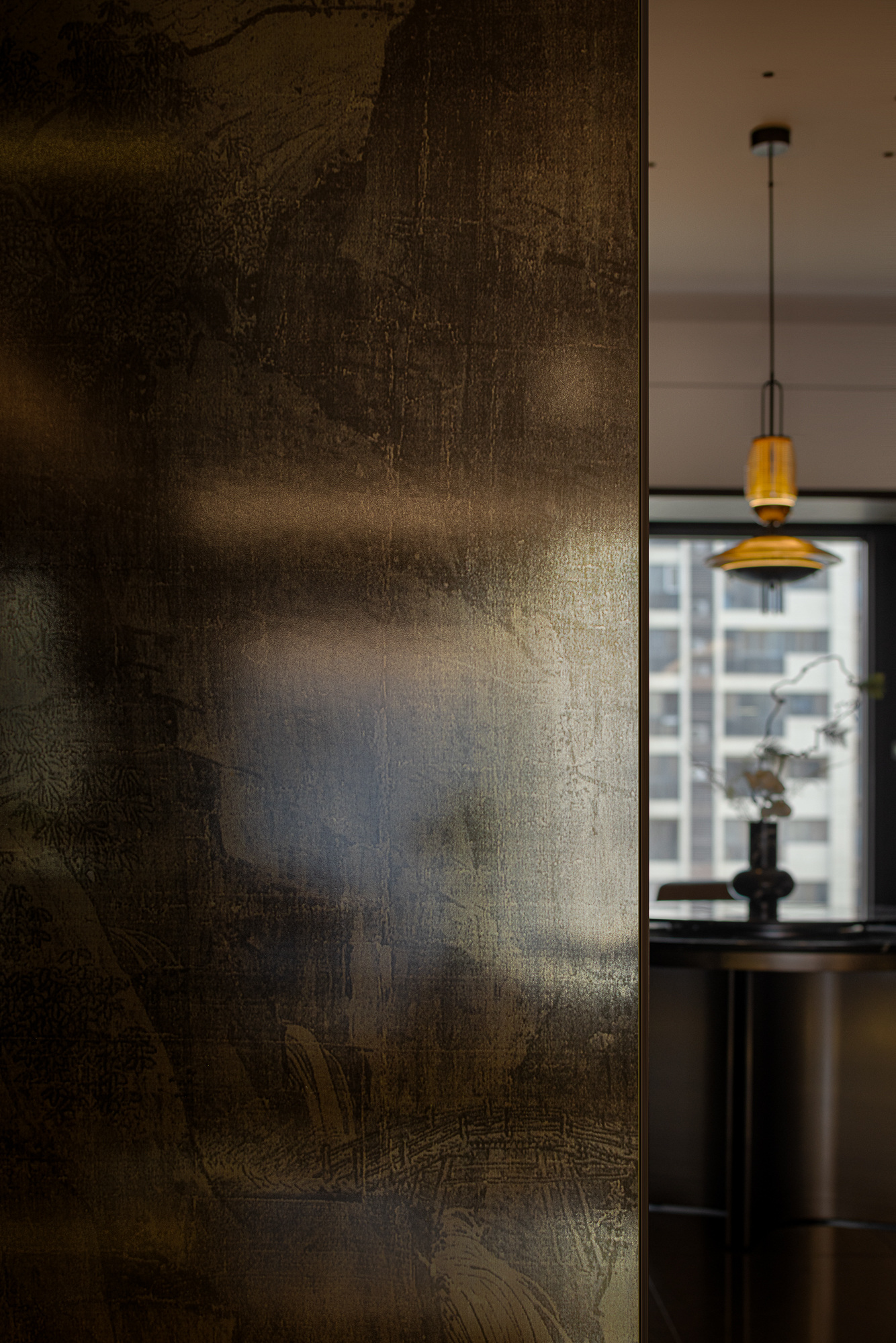 空间意境:玄关入户屏风隔断为空间造景分区,用光影塑造出空间的独特氛围和意境。入眼借用山水画夹丝玻璃来演绎窗景,具有独特的艺术美感,虚实结合,充满诗情画意。围合式的屏风造型,灵动有质感。中式的古典画布,做了大面积留白,营造高雅意境。端庄的“方”与“圆”相结合,刚柔并济,舒适和谐。