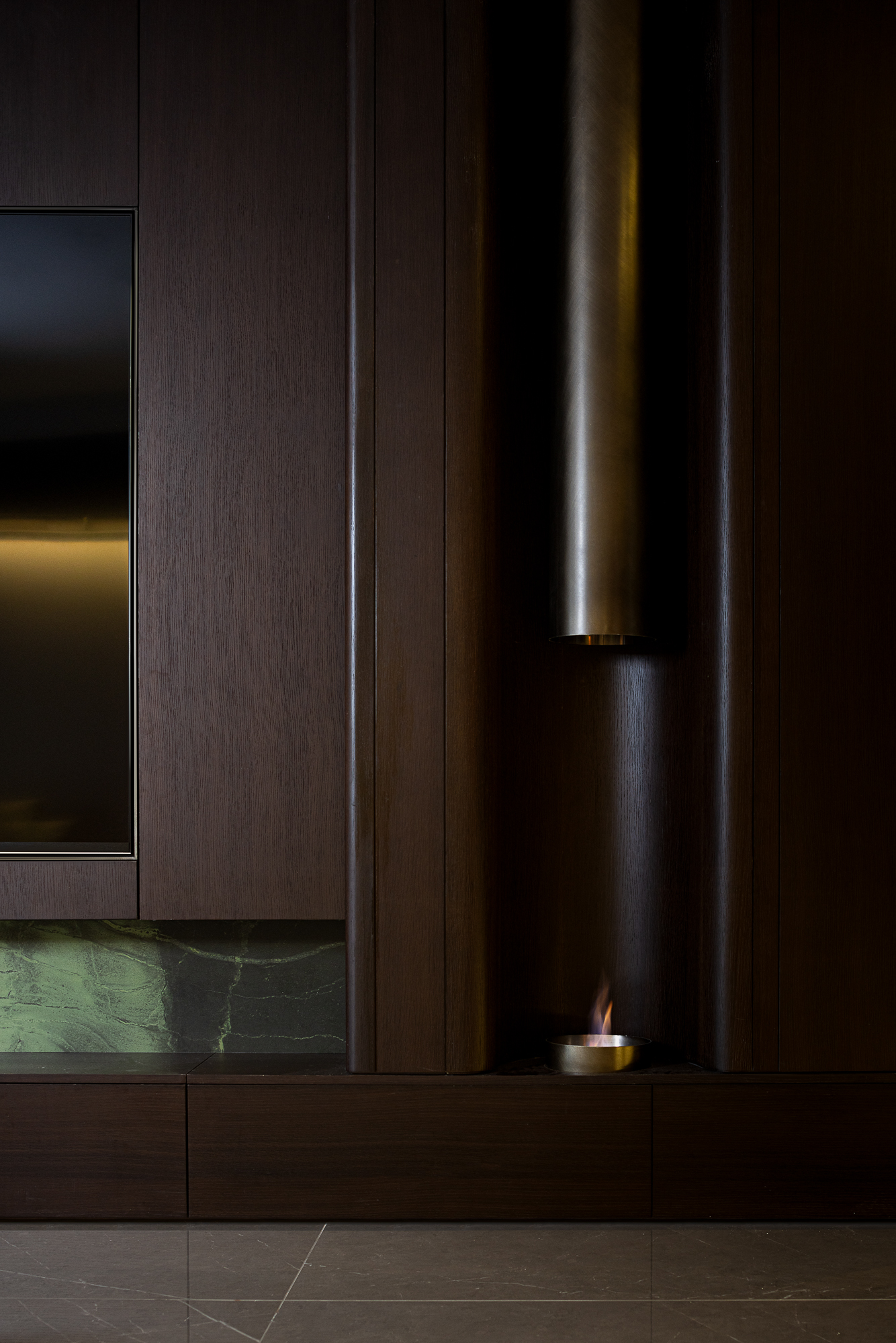 空间布局:客厅电视背景墙用到烟熏橡木与青绿色奢石,取天青之色,勾绘东方韵味,流露出含蓄端庄的清雅。雾化壁炉的点缀为空间增加了温暖的氛围。阳台乳白色的屏风帘给人一种“只缘身在此山中”的意境,过滤着自然光线,创造一种朦胧而神秘的氛围。阳台造景巧用苔藓、仿真蕨类、鹅卵石,简单的植物搭配灯光,营造“松弛感”,温馨惬意。