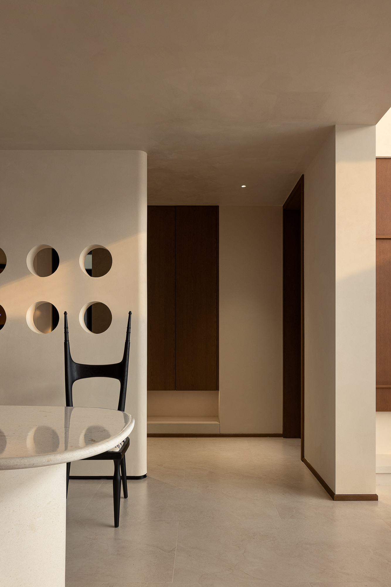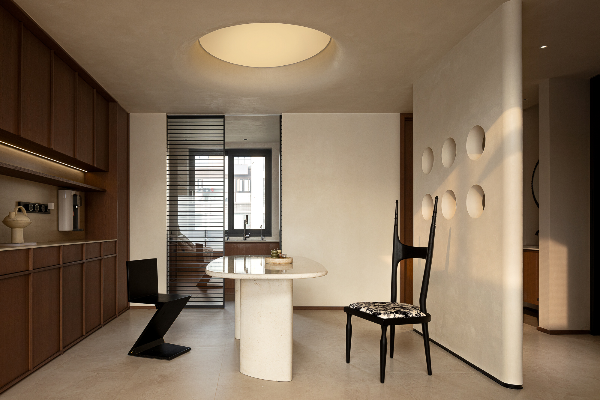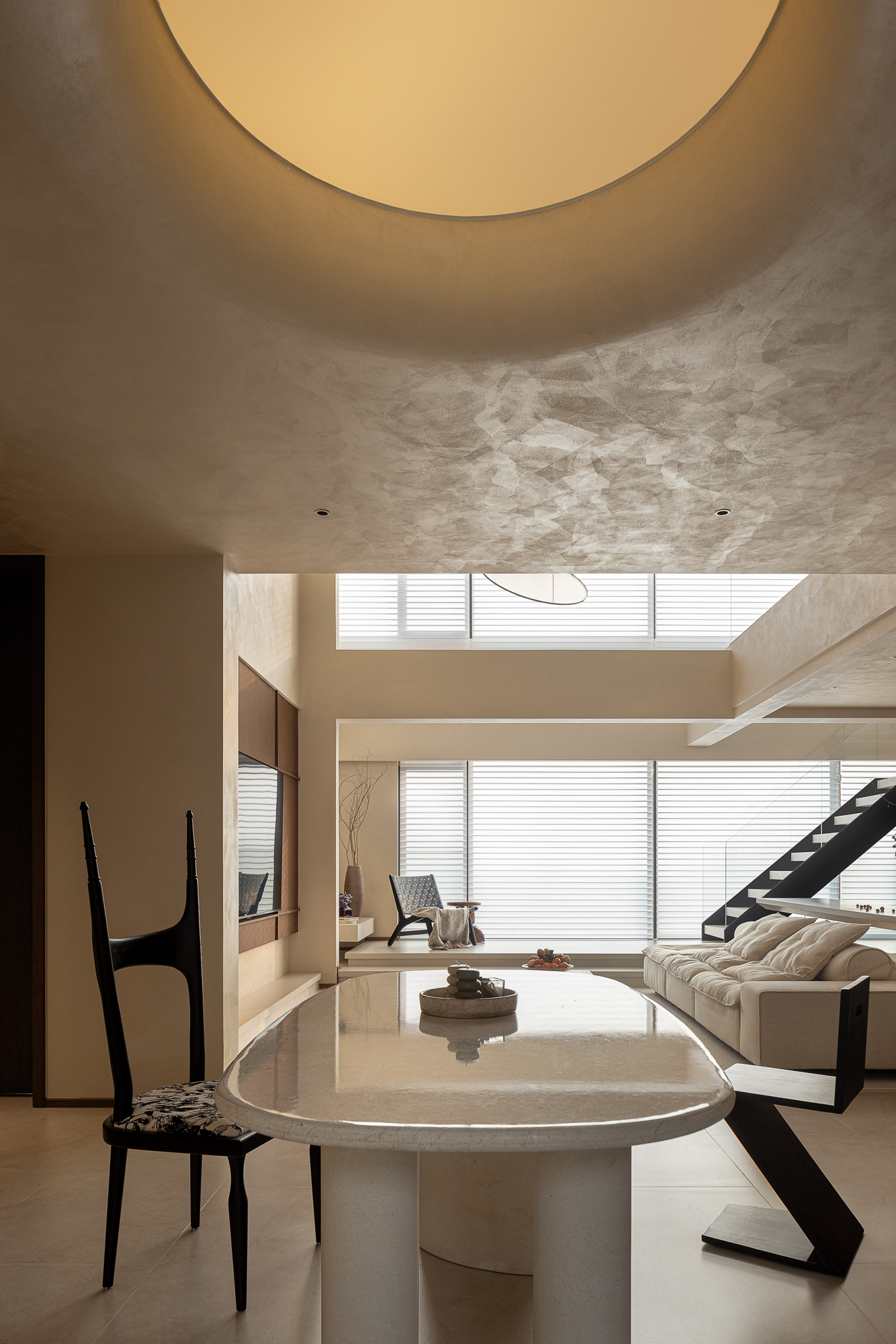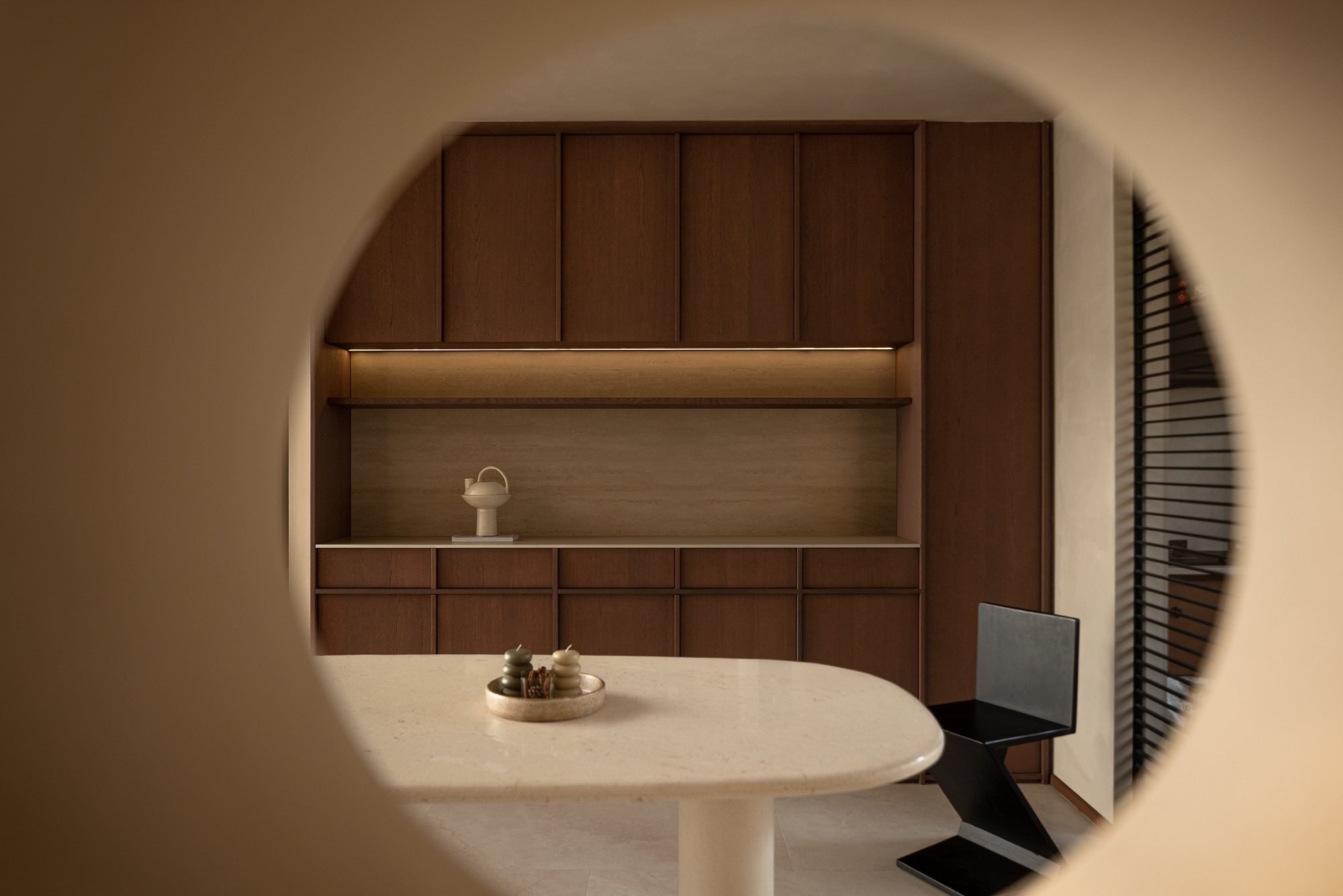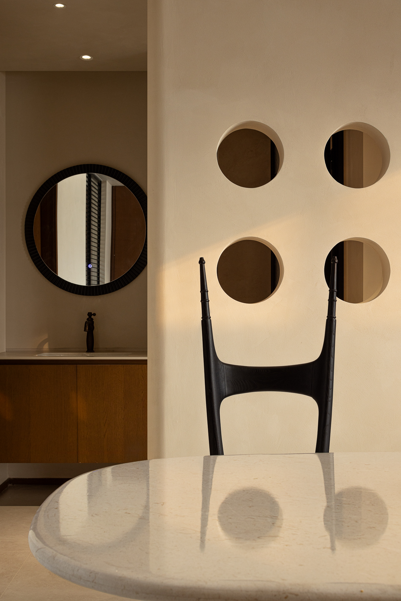 椭圆形餐桌烘托优雅和乐的用餐氛围,球形天花灯与圆形镂空墙面造型设计,成就环环相扣的设计视效。居其间,亦可品生活百味;帷幄智慧人生;洞察一方见地