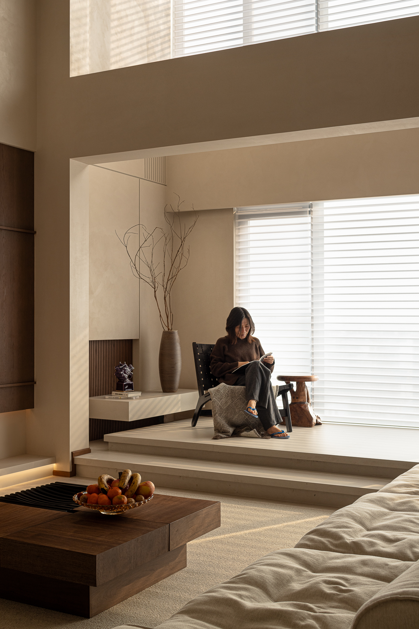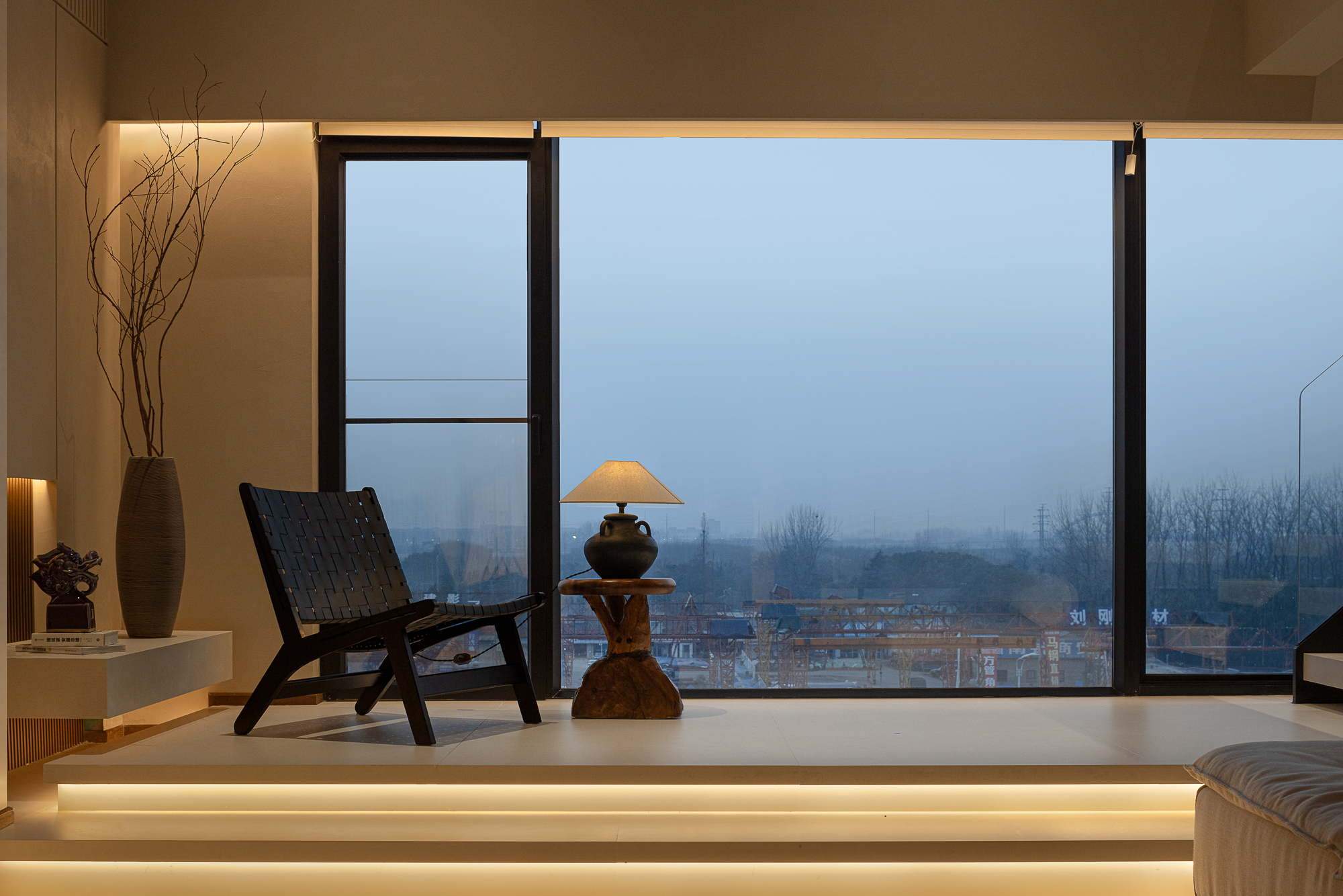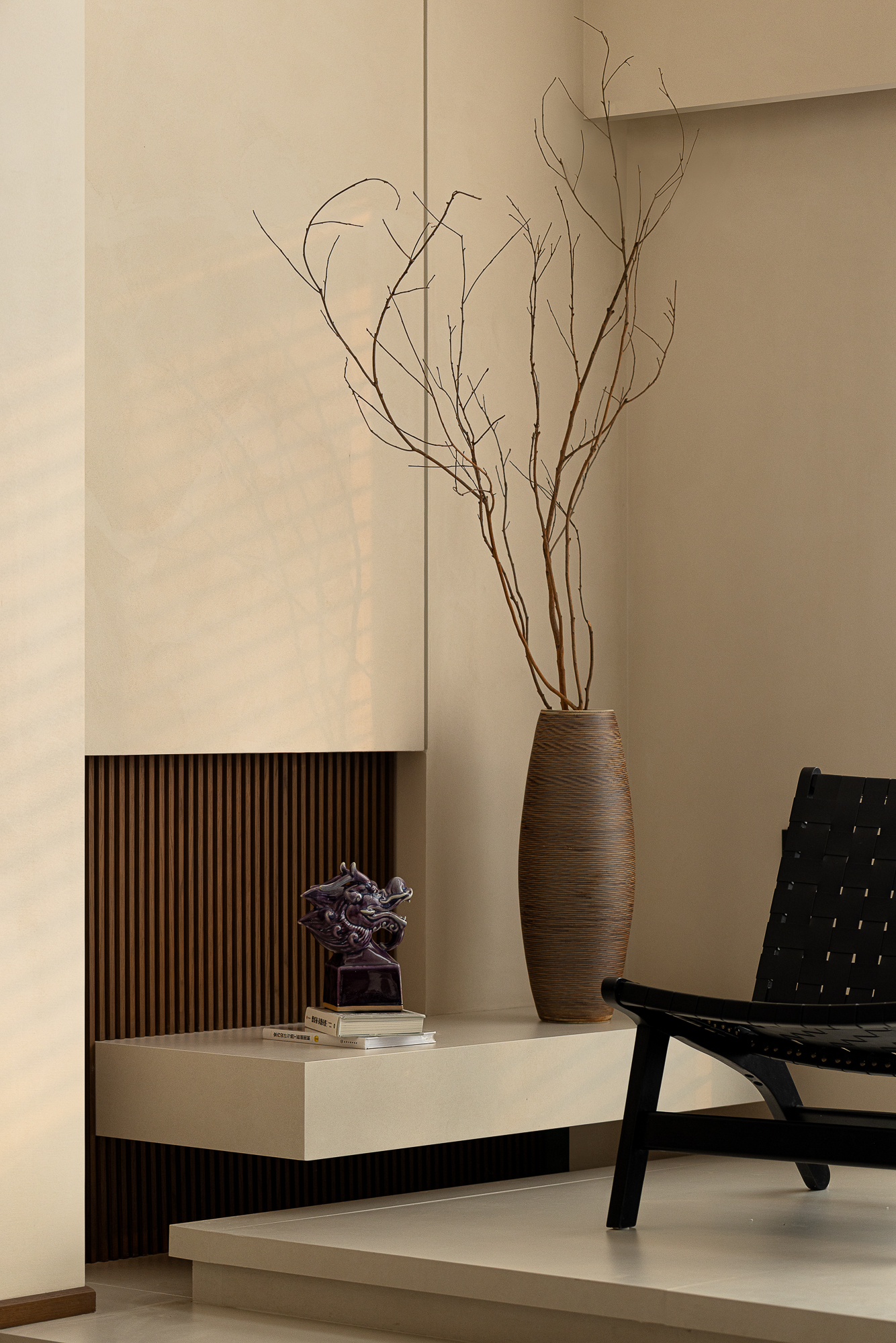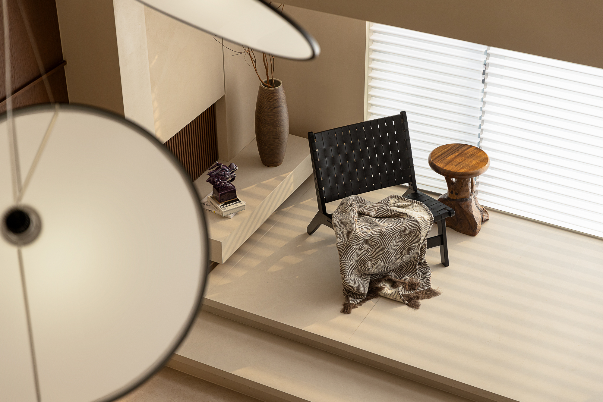 阳台处的抬高阶梯设计,塑造了一处松弛优雅的闲暇之境,一梯一阶,一书一盏,皆是心灵的慰籍。正如作者黎戈所言:“我们都困在巨大又琐屑的生活里,我们都爱惜具体而微小的幸福。”这便是家给予个体的满足感。