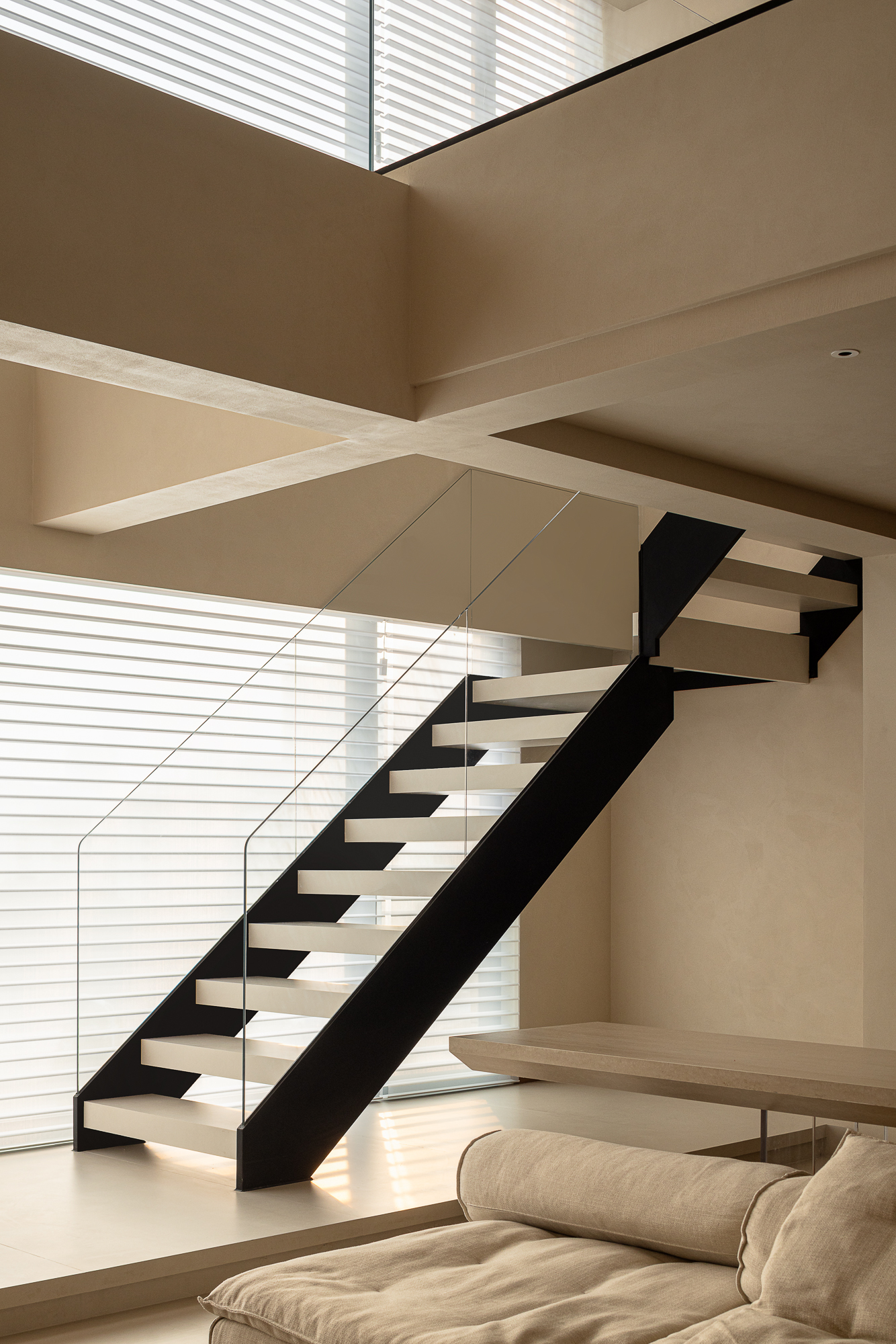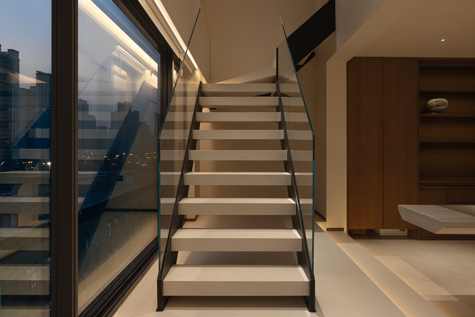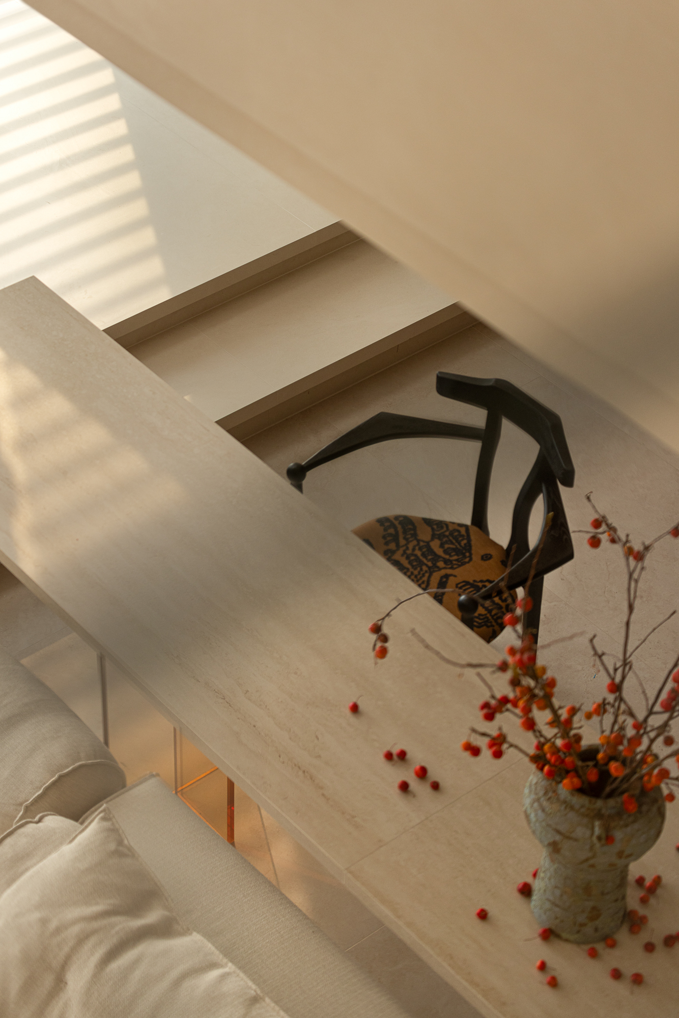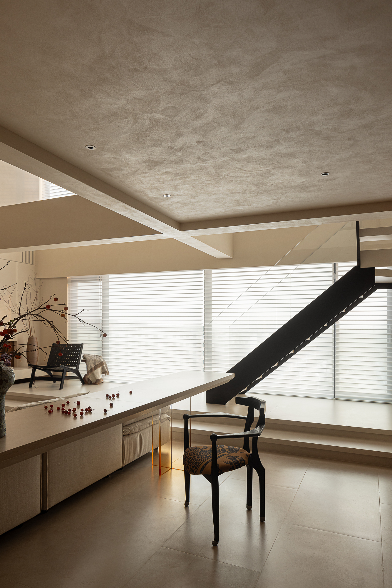 阳台处的抬高阶梯设计,塑造了一处松弛优雅的闲暇之境,一梯一阶,一书一盏,皆是心灵的慰籍。正如作者黎戈所言:“我们都困在巨大又琐屑的生活里,我们都爱惜具体而微小的幸福。”这便是家给予个体的满足感。