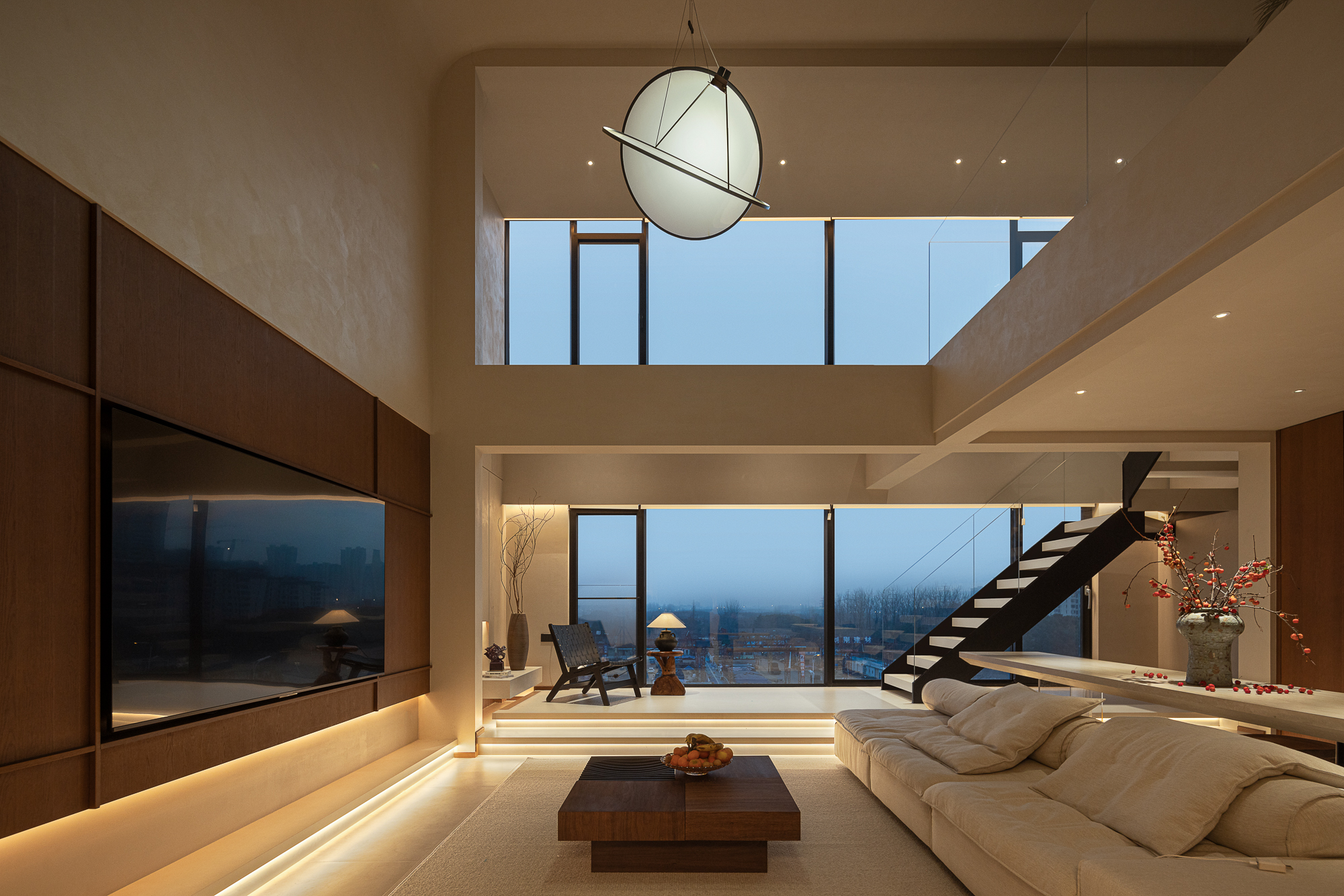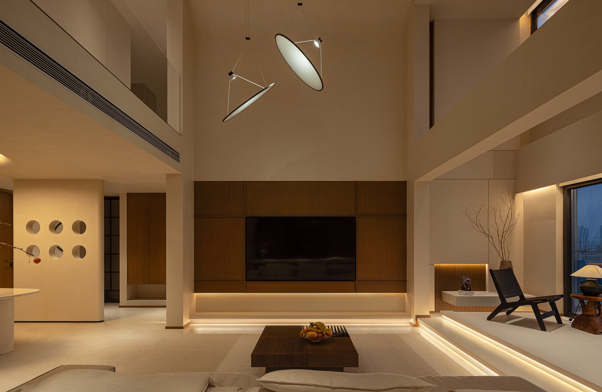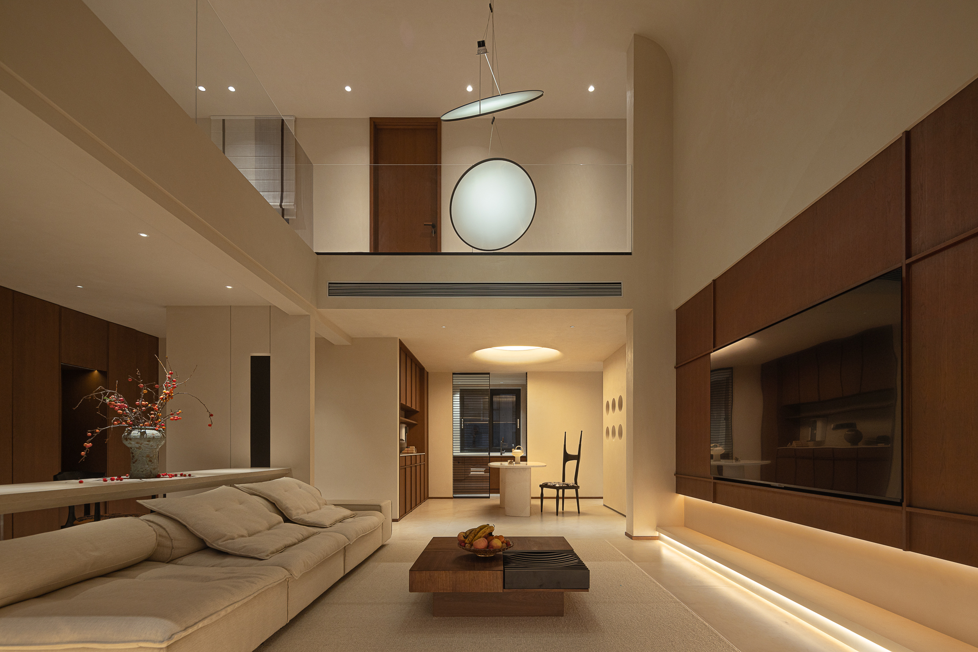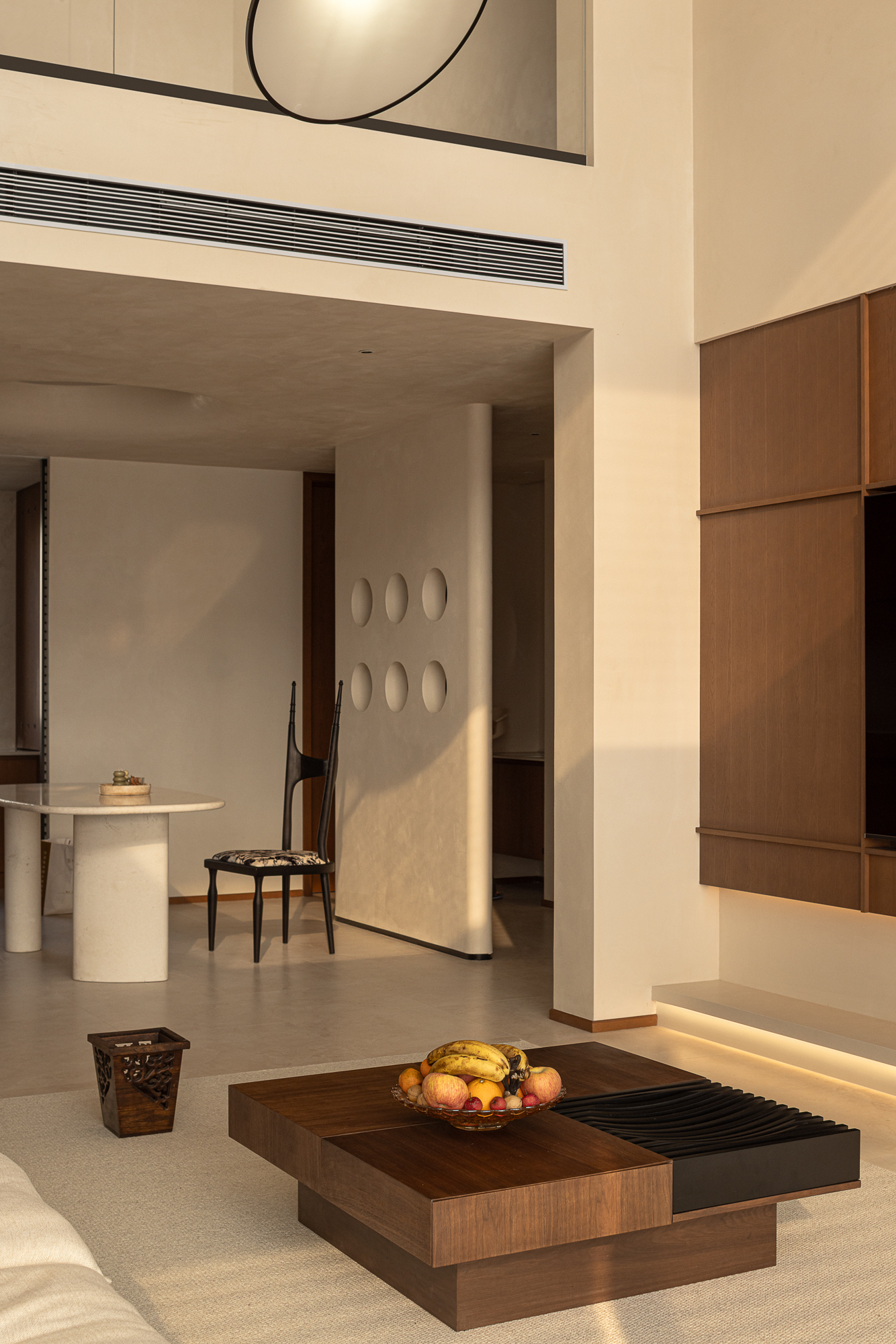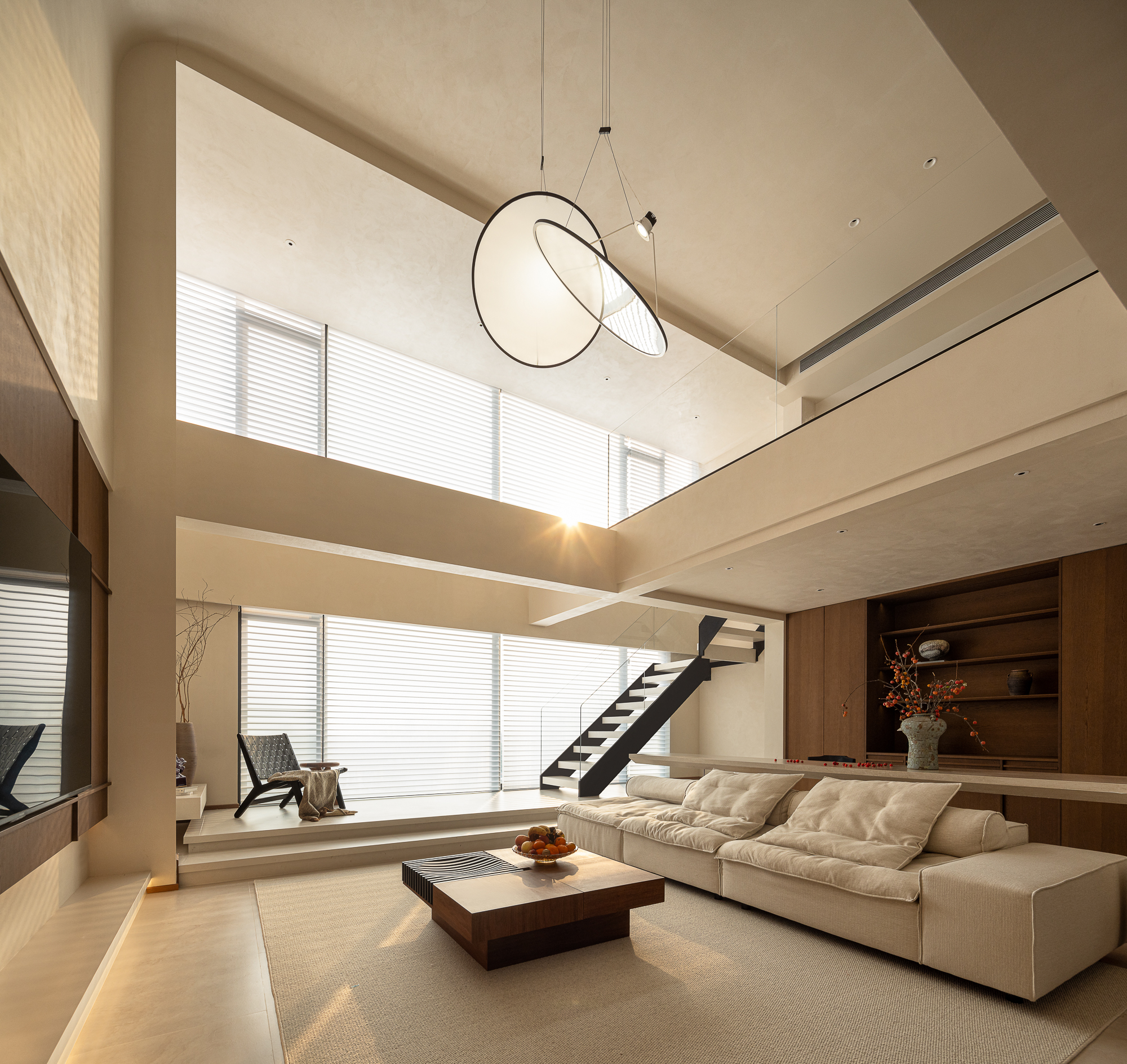 空间意境:简洁的线条勾勒出空间的轮廓,木质家具散发着自然的温暖,仿佛在低声诉说着岁月的故事。阳光透过大面积的落地窗洒进来,与米白色的微水泥墙面交织,营造出一种时光与生活同行的质感。