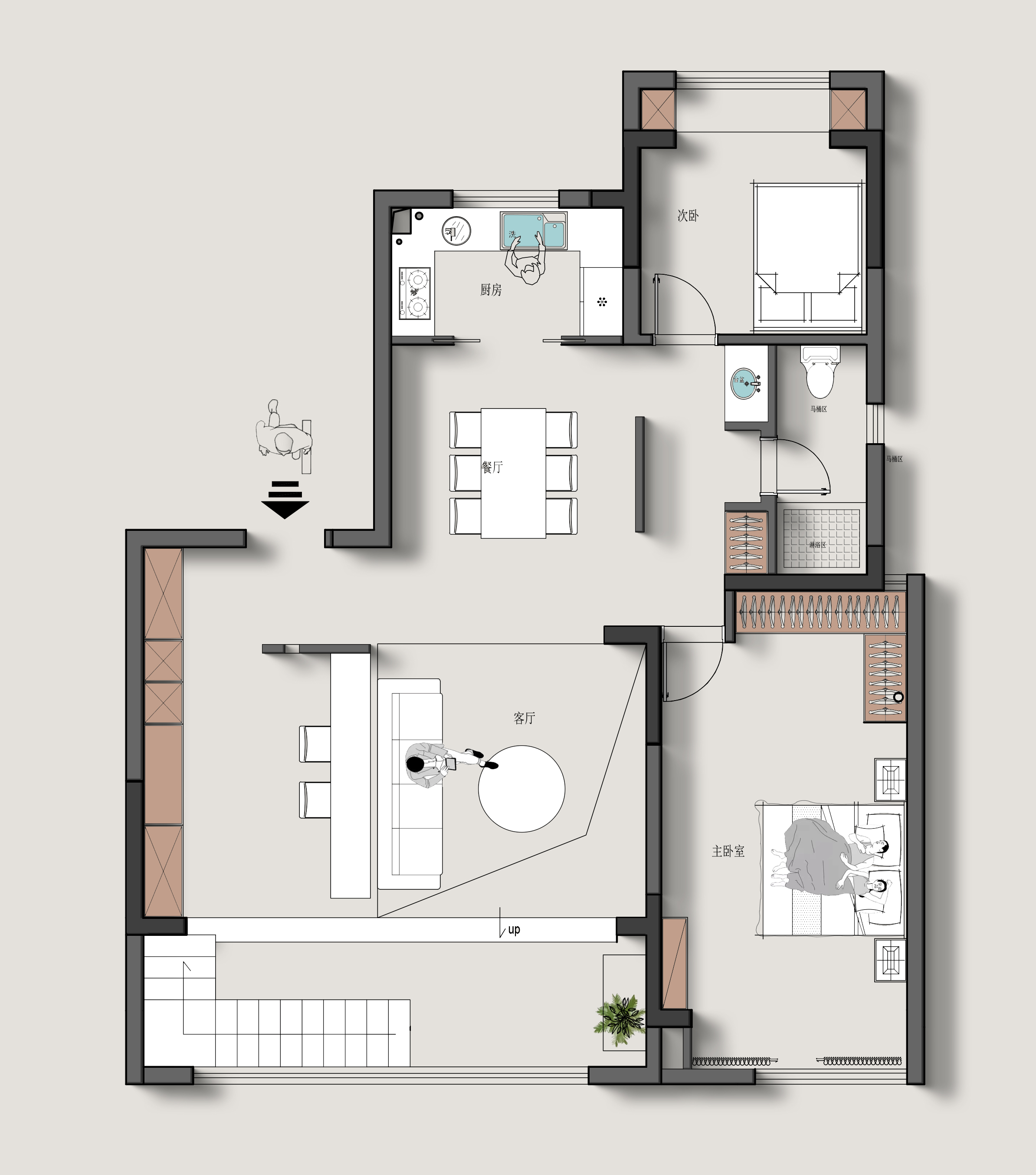 设计选材:墙面微水泥、地面瓷砖、木纹砖、