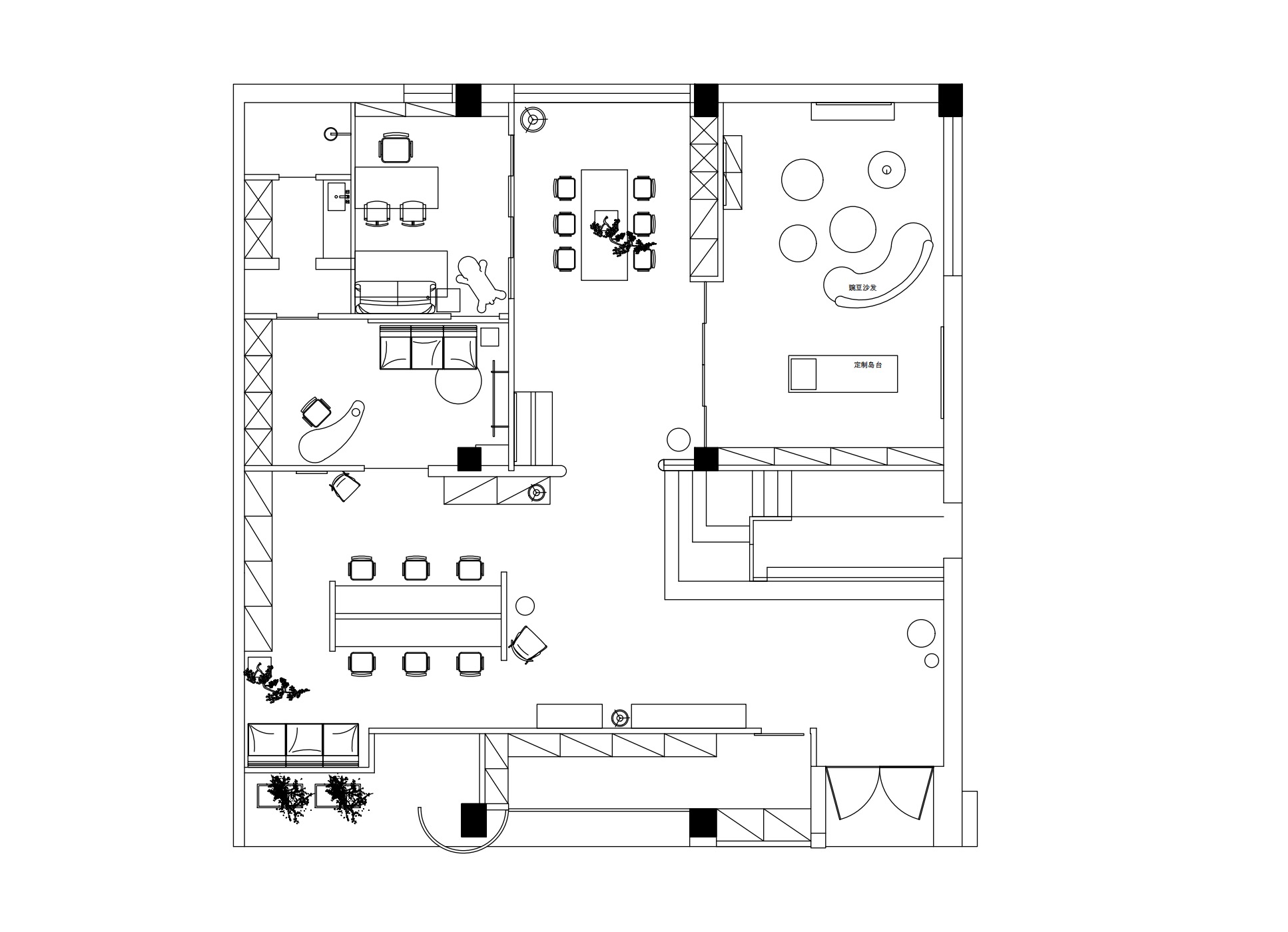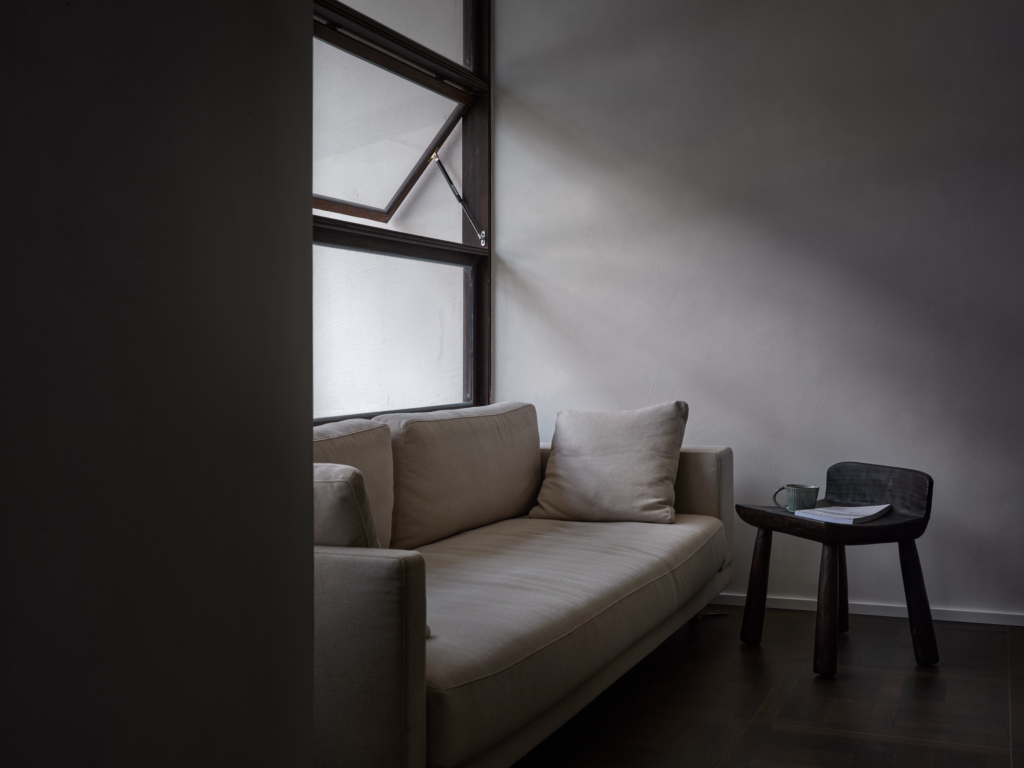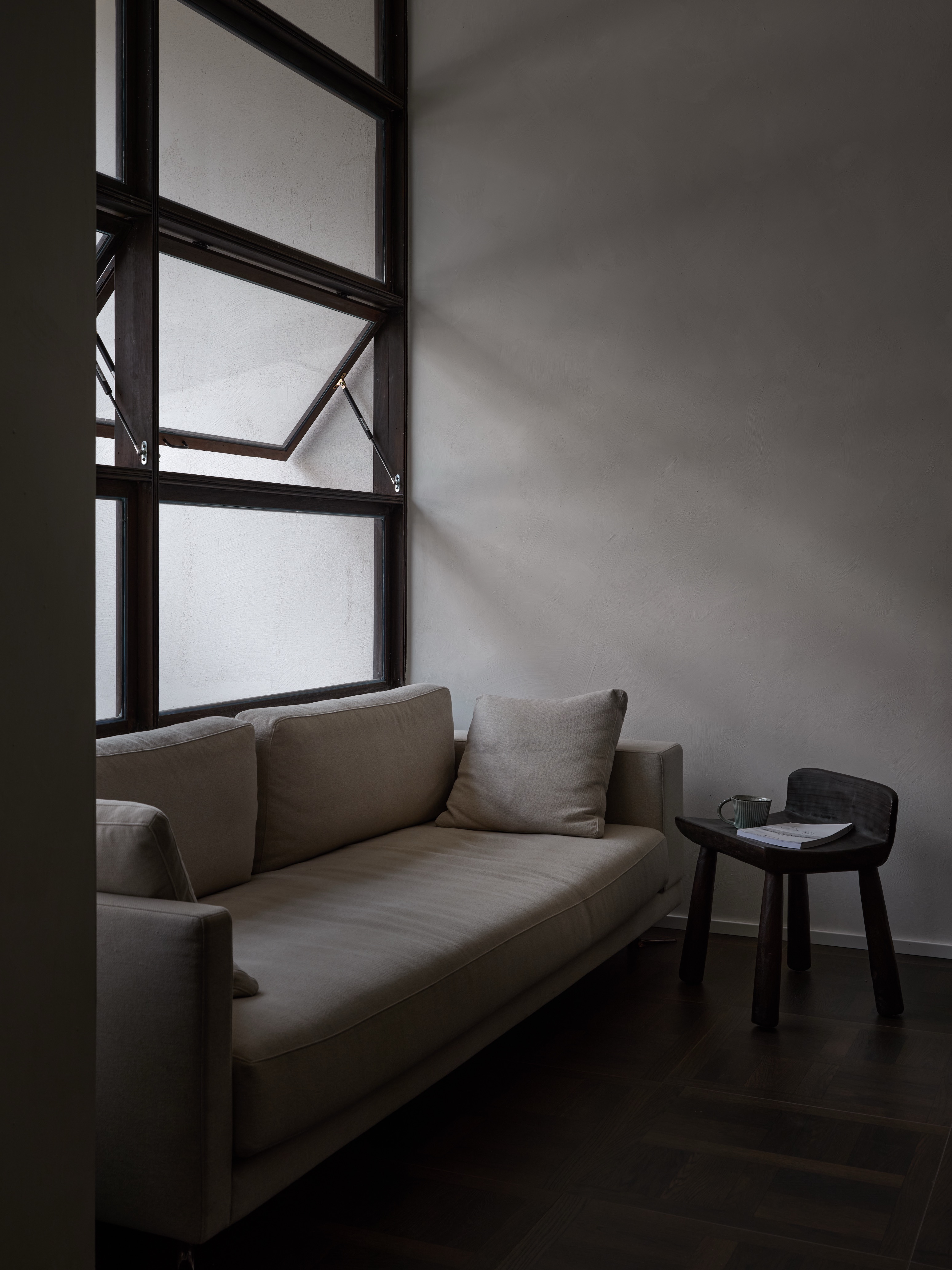 空间布局:开放、居家生活氛围式的办公环境,隔断的形式达到心理私密性,水吧台餐厨一应俱全,设计了几个临窗位置,让采光、通风、对流更舒服,餐厨区域的老钢窗,借了隔壁园林店的绿景,就算吃外卖也更有氛围感