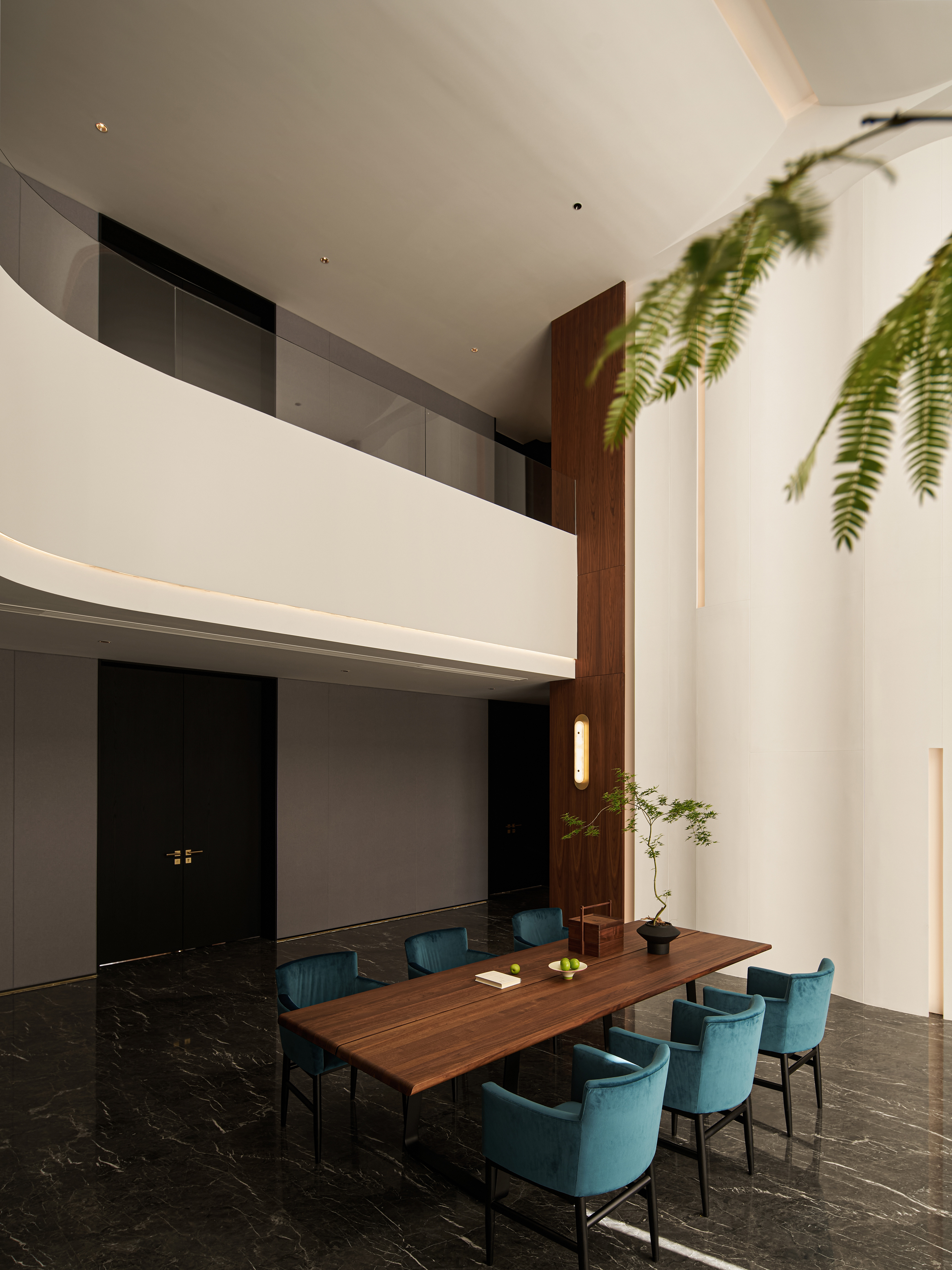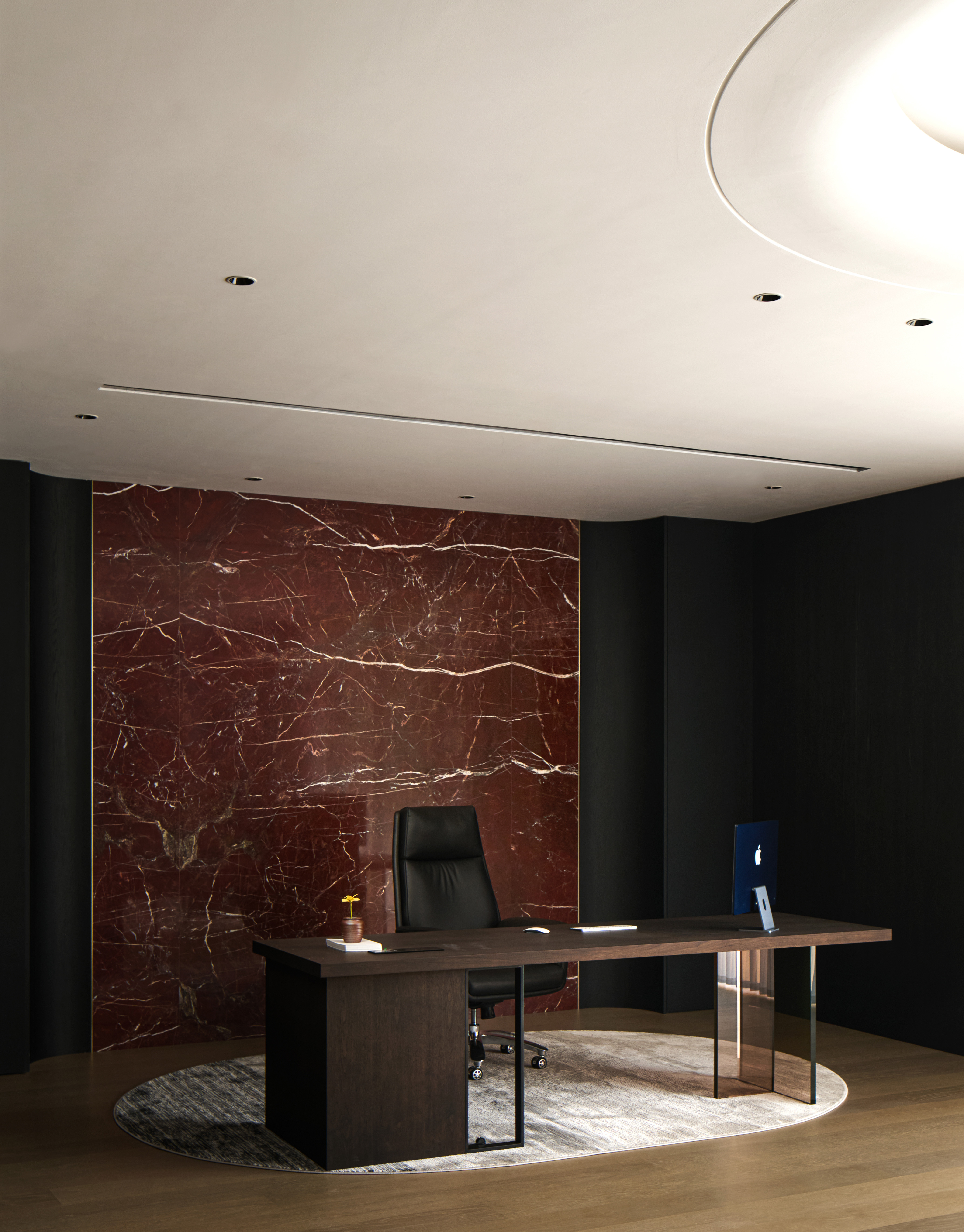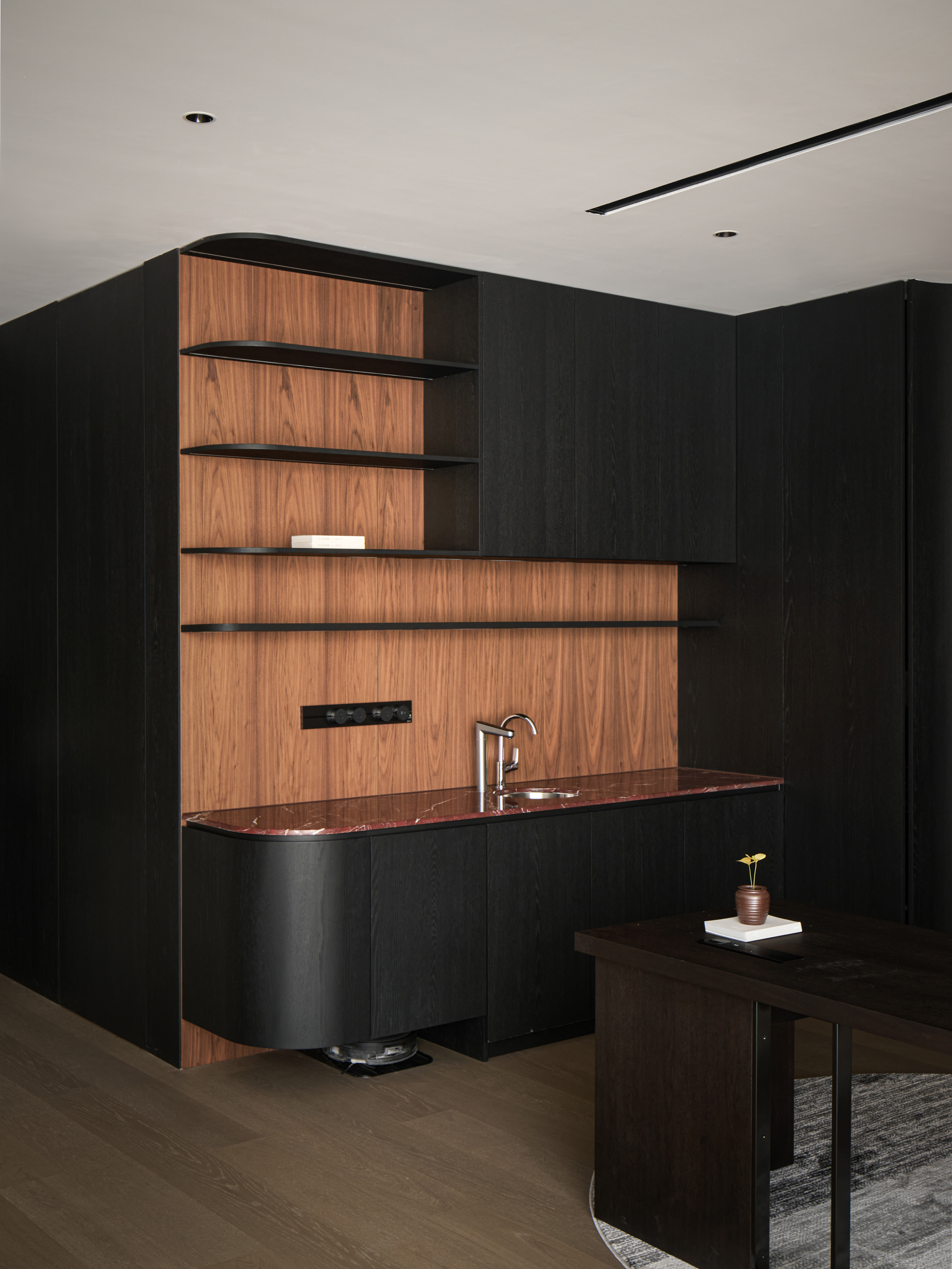 整体空间采用黑与红为主调,辅以胡桃木与红色奢石点缀,奢中见稳,典雅中蕴藏力量。红色象征鸿运与繁荣,为商务场域注入积极寓意。 金属、艺术玻璃、不对称开放柜的应用使材质层次更为丰富,色彩与质感形成多重对比,构建高贵而现代的氛围。