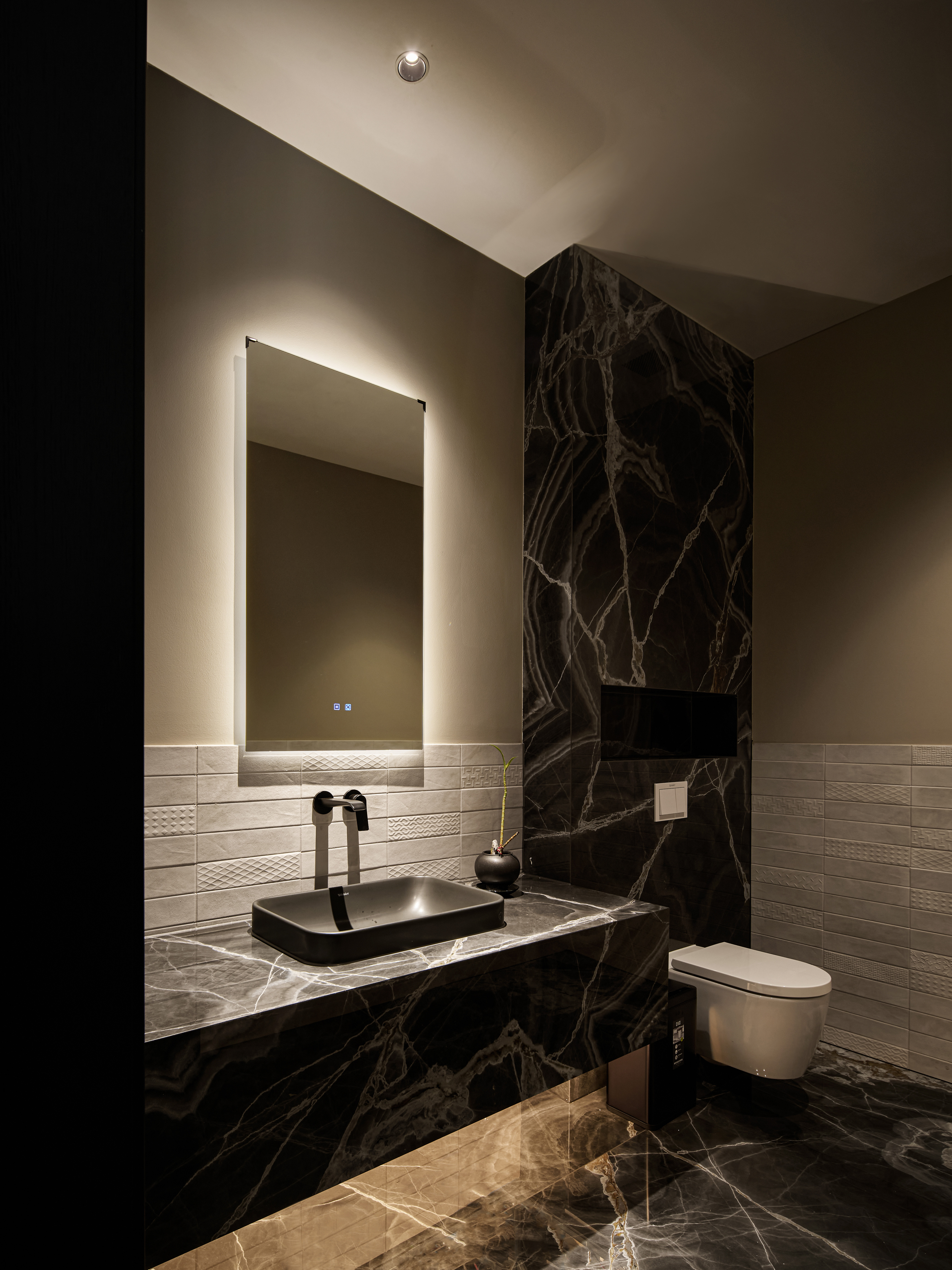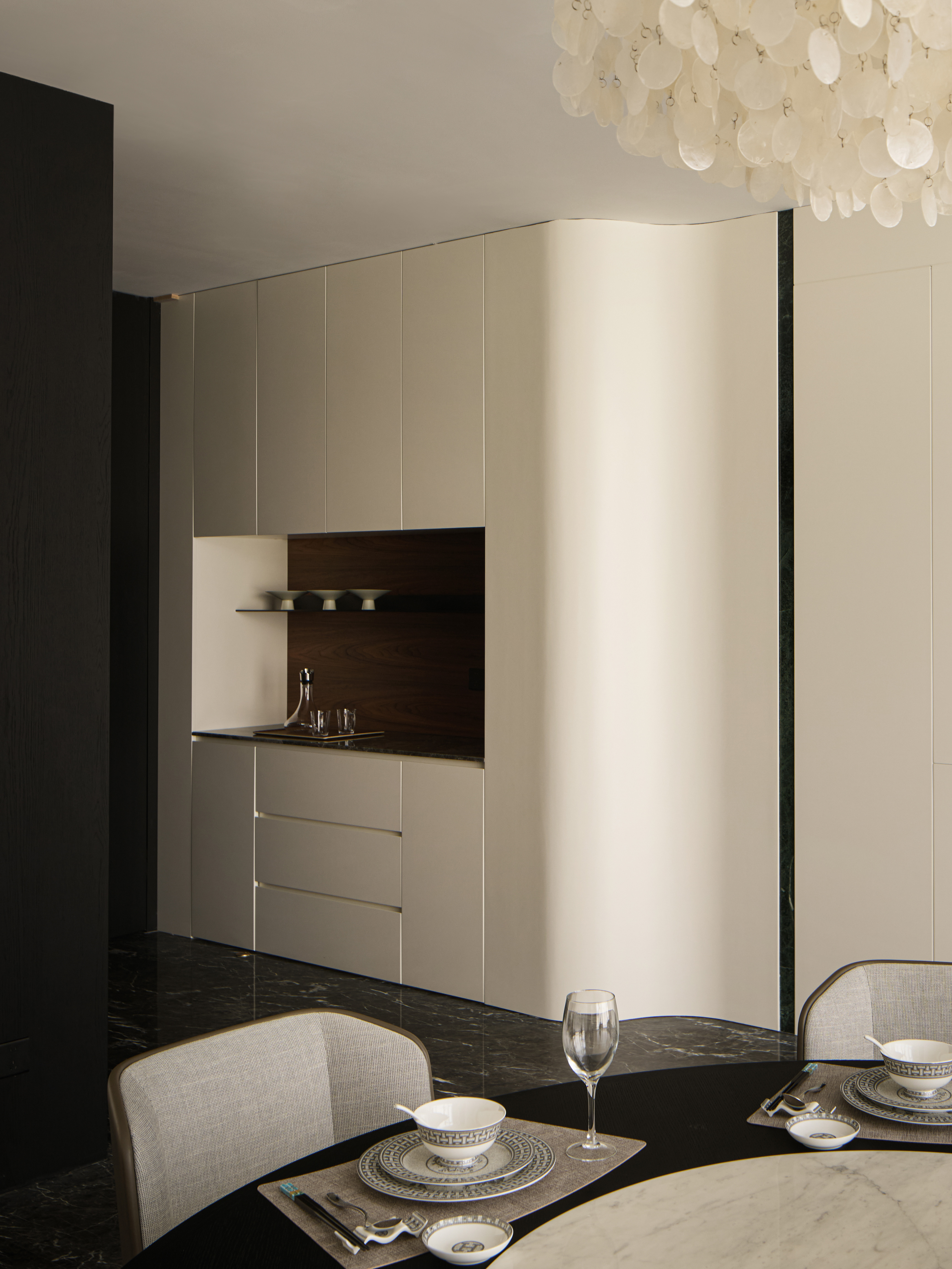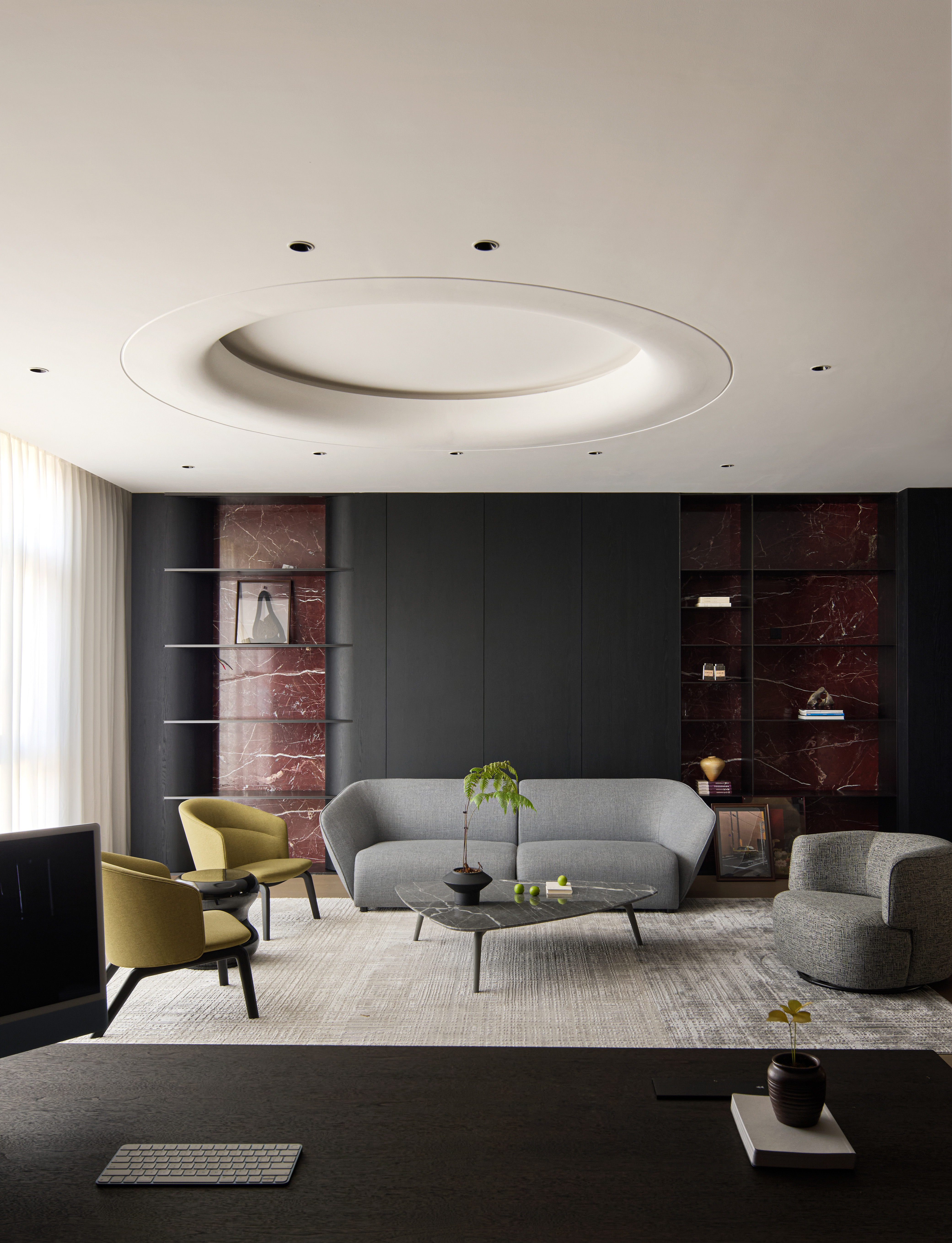 整体空间采用黑与红为主调,辅以胡桃木与红色奢石点缀,奢中见稳,典雅中蕴藏力量。红色象征鸿运与繁荣,为商务场域注入积极寓意。 金属、艺术玻璃、不对称开放柜的应用使材质层次更为丰富,色彩与质感形成多重对比,构建高贵而现代的氛围。