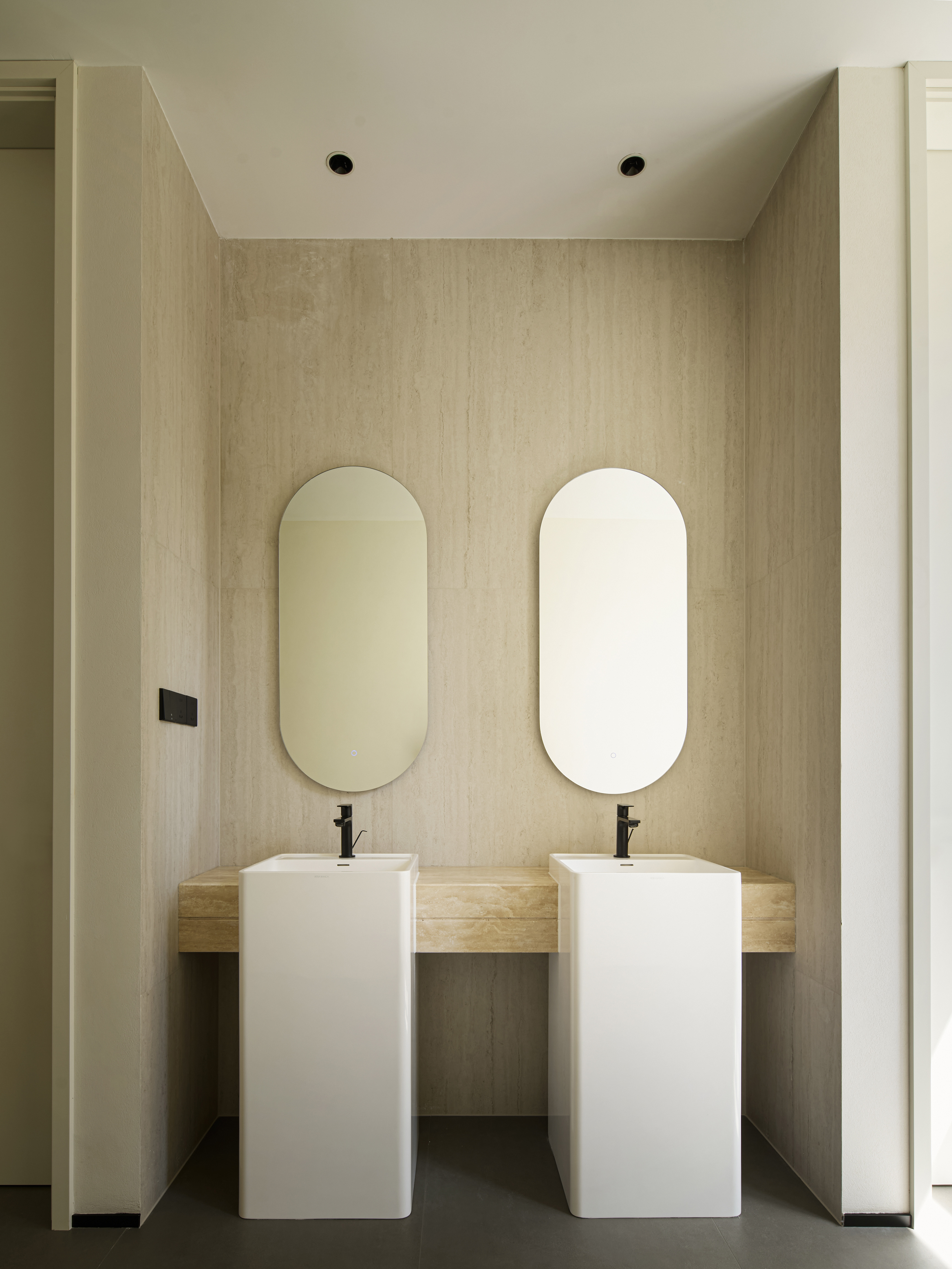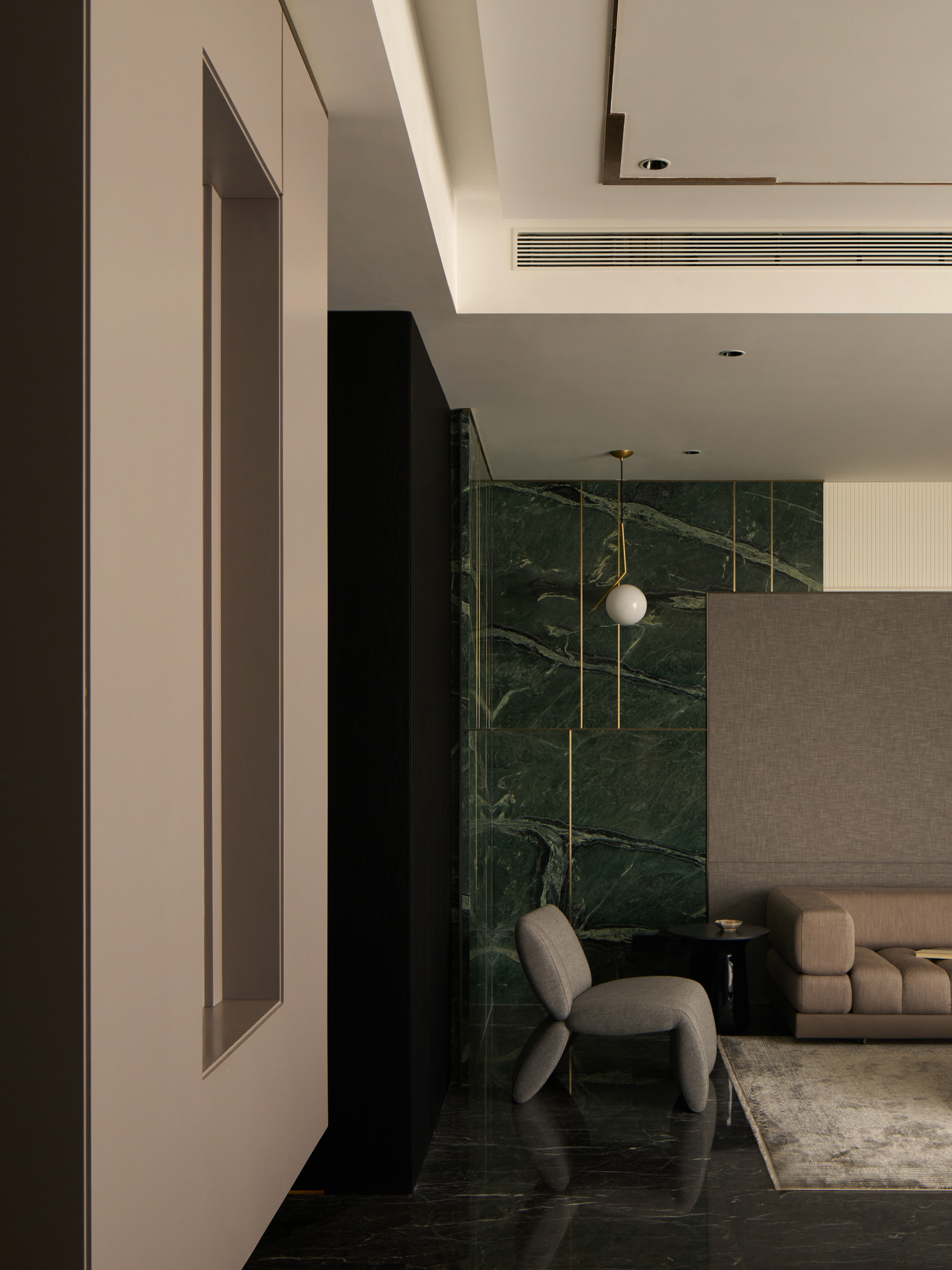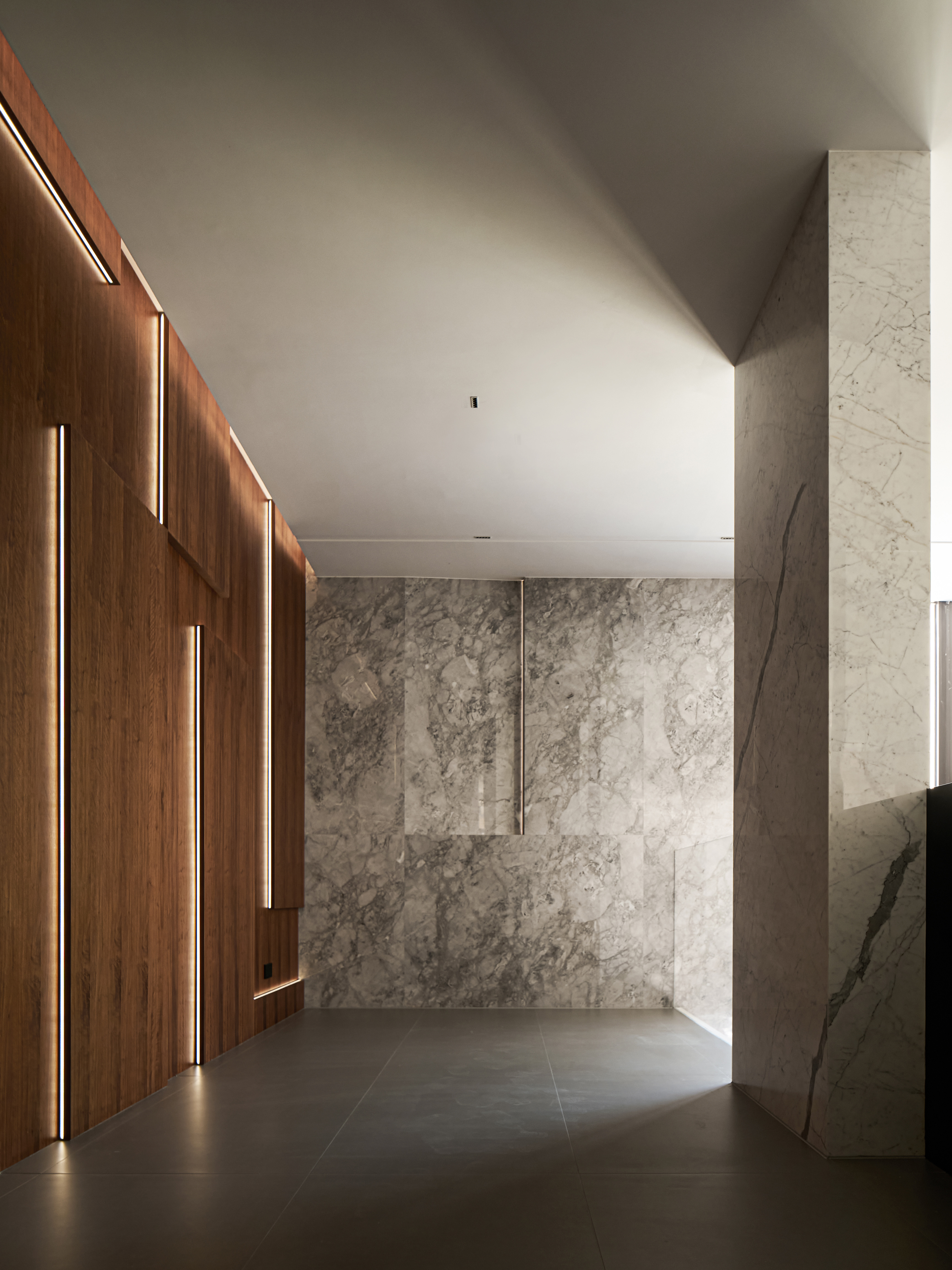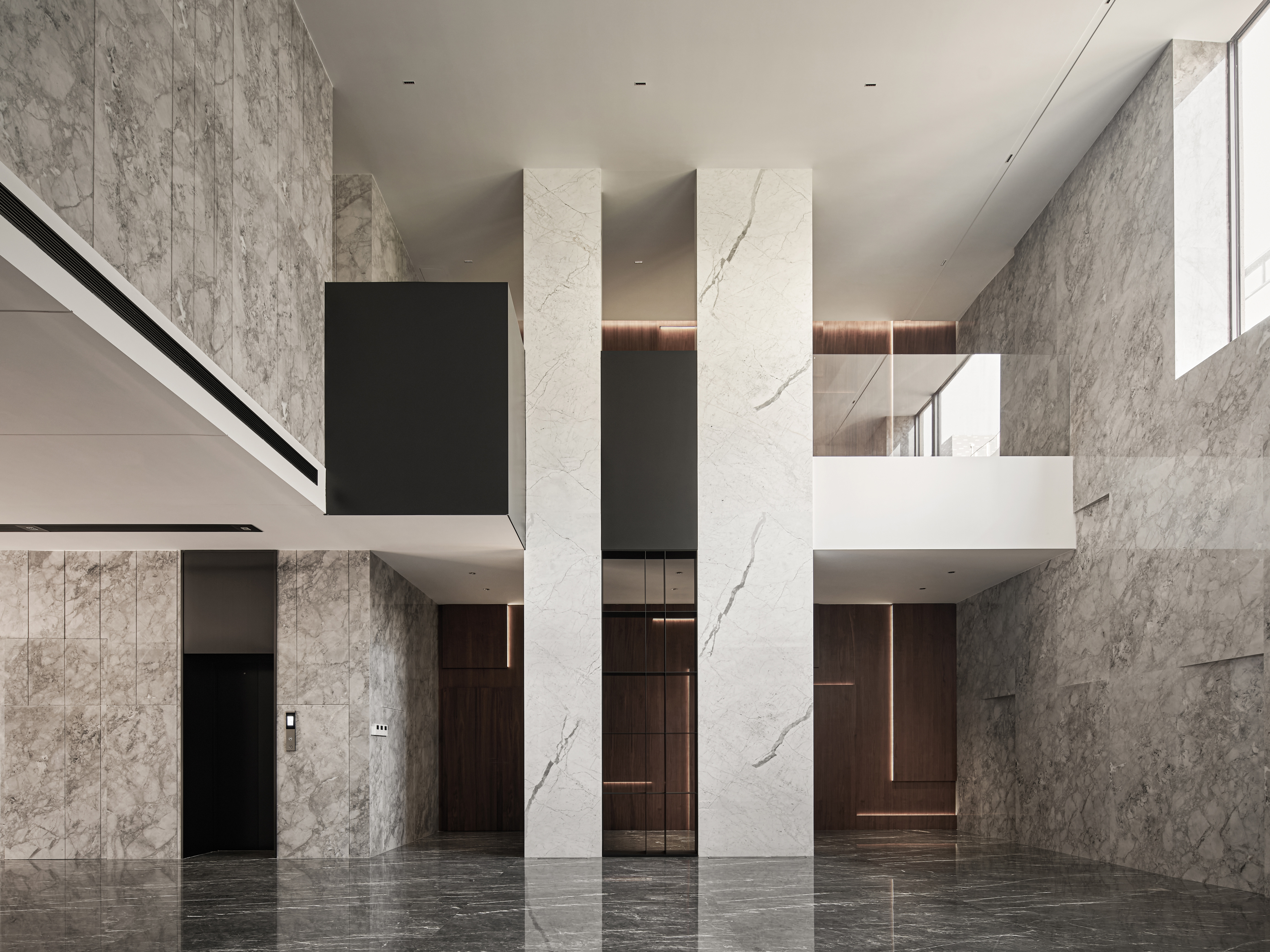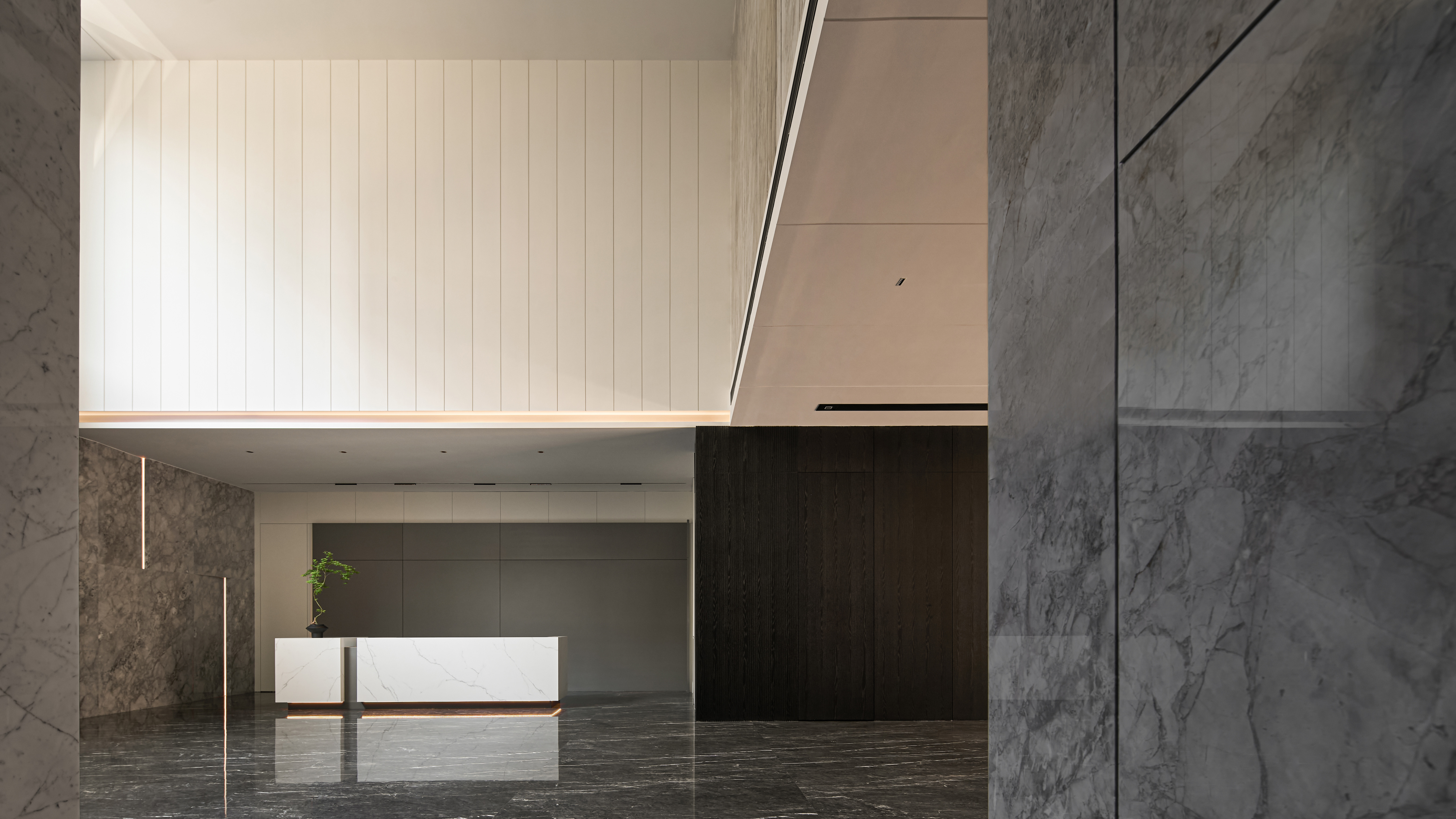 “繁简共生”,是一种蕴含深意且具生命力的设计哲学。在极简的表象之下,隐藏着丰沛精巧的细节与思考。它推动设计者以更全面、更敏锐的视角构建空间,赋予场域生命与灵魂。本案一、二层作为办公空间,首层印象尤为关键。大厅采用挑空设计,形体与材质形成统一对话。大面积使用鱼肚灰石材,与背景鱼肚白形成色彩与质感的对比,奢与简相融,营造内敛而不失气度的视觉体验。