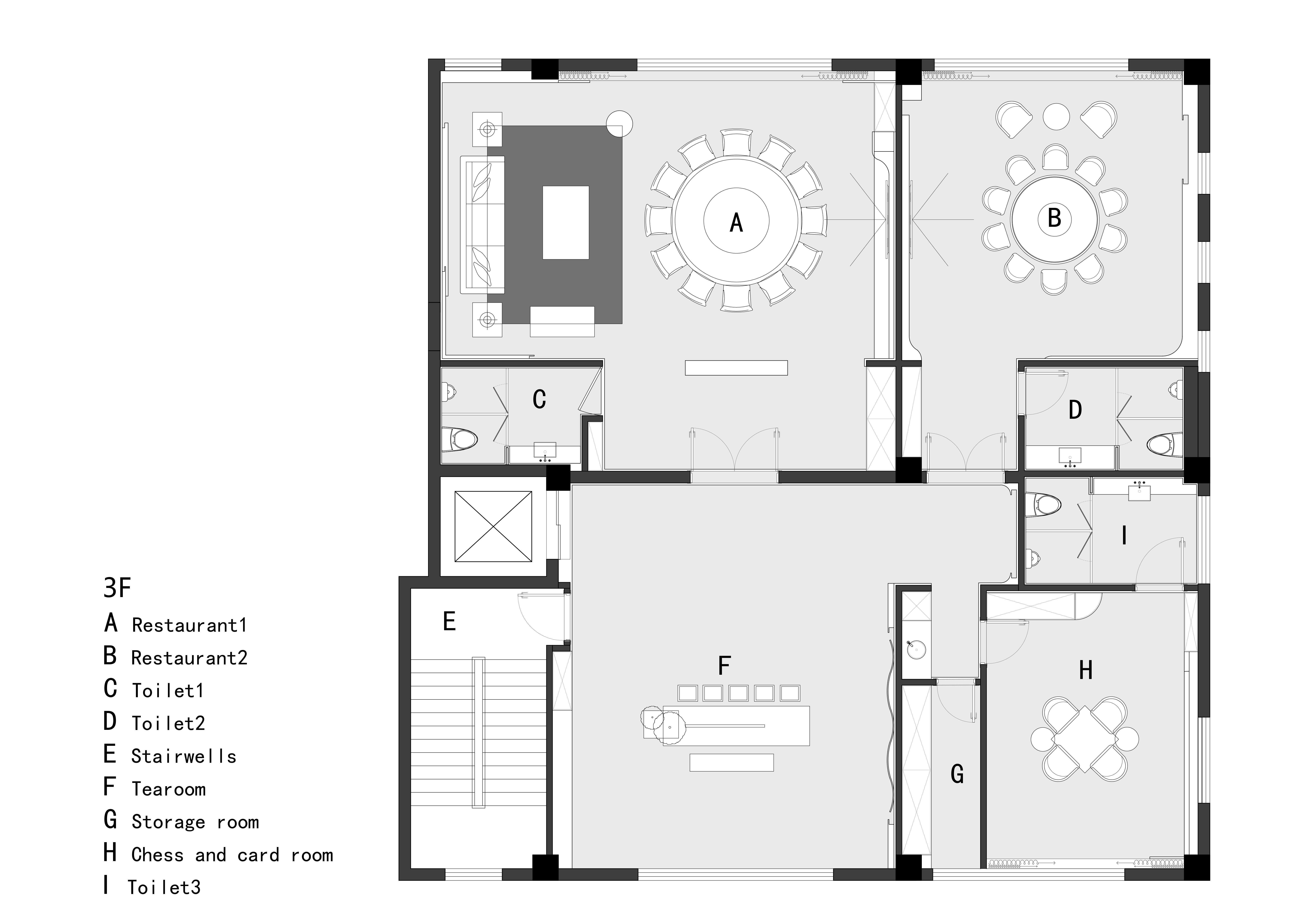 三层功能转为私享与社交,规划有大小宴会包厢、棋牌室、茶室等空间。电梯出口设为通透式茶室,营造轻松雅致的氛围。设计中强调“双挑空”概念,与一、二层形成垂直联动,丰富空间层次,增强视觉穿透与精神共鸣。