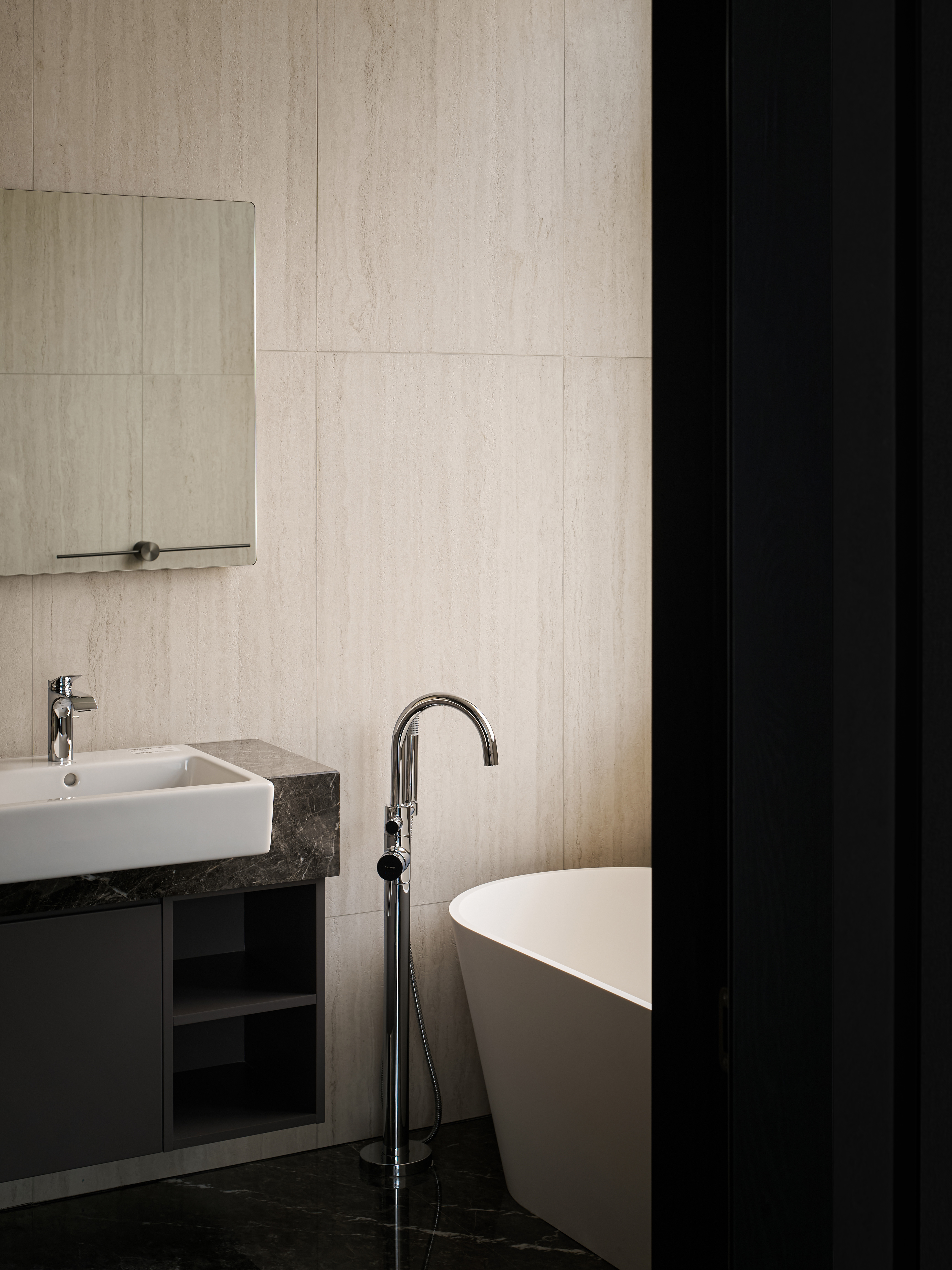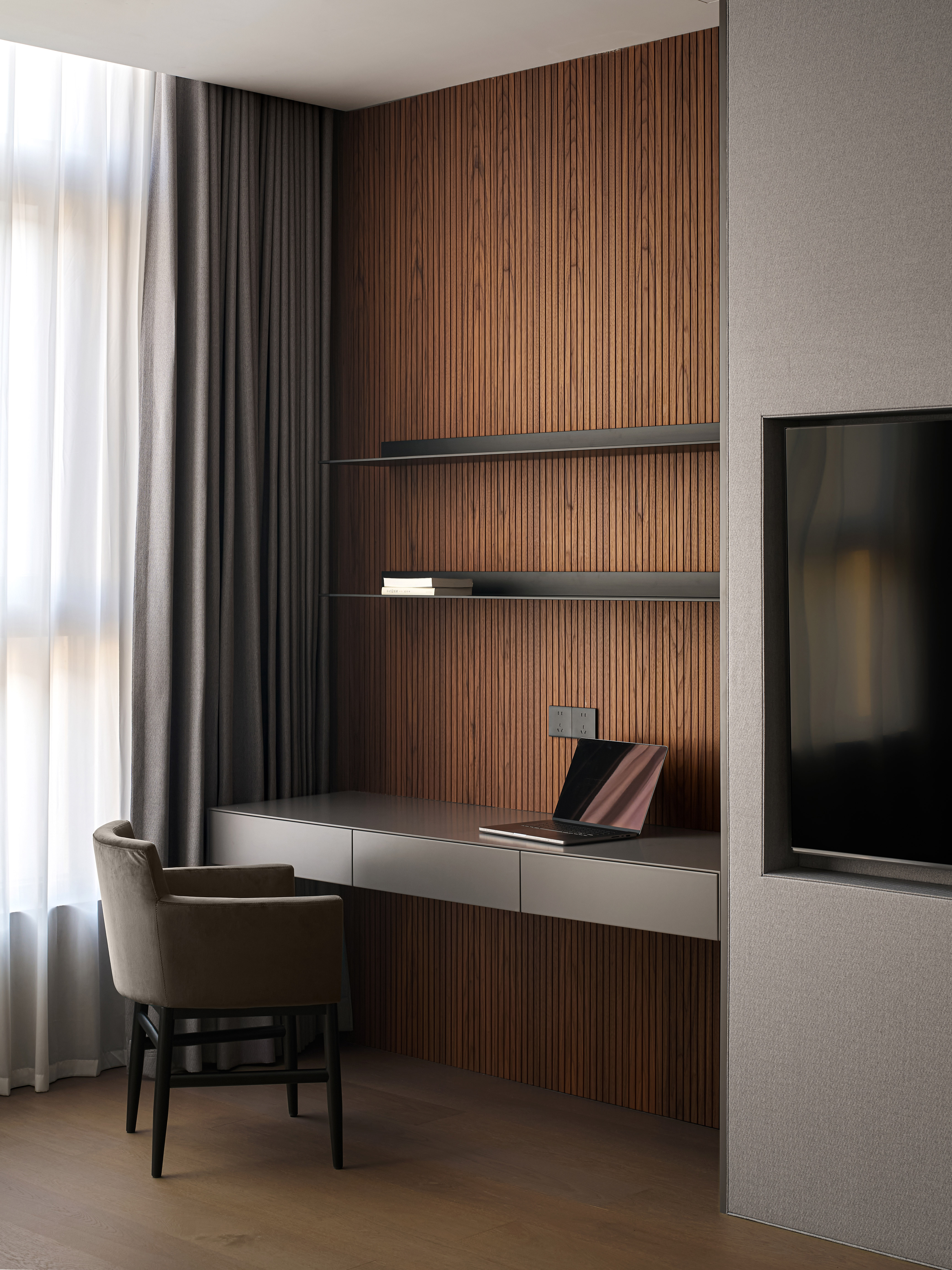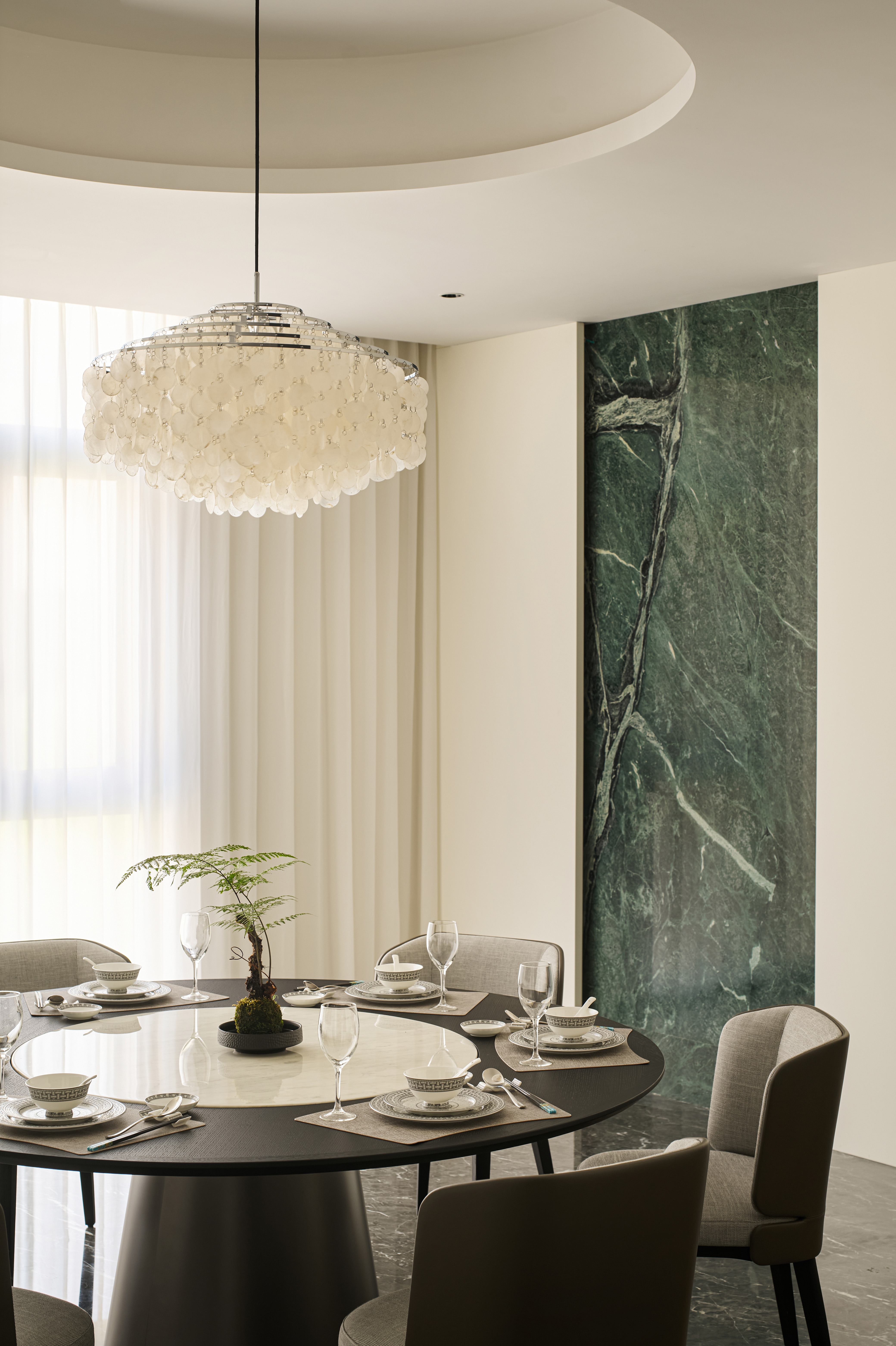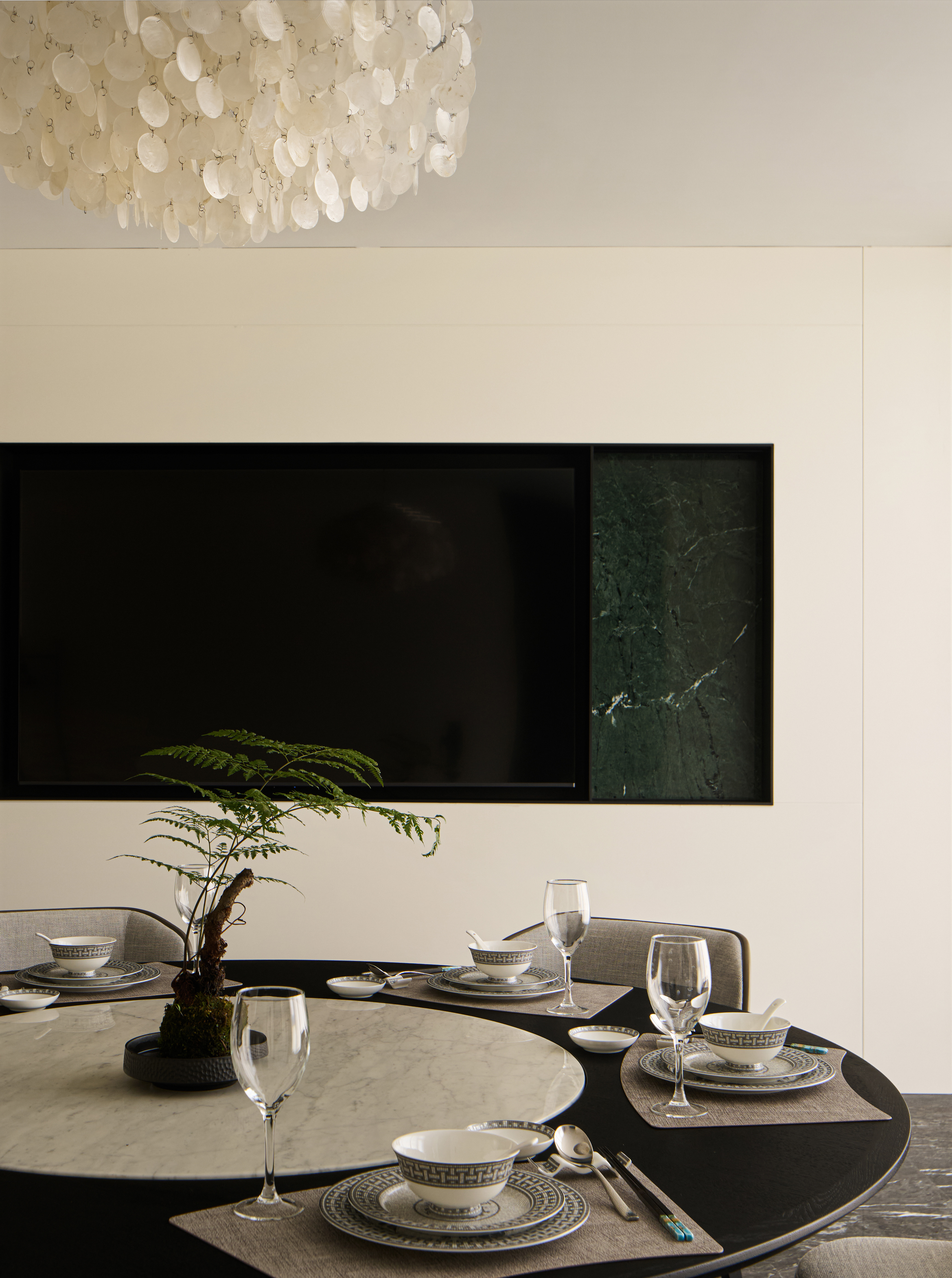 处理手法工整简约,整个空间以灰色调为主,同色系的手法,局部点缀色,使整个空间优雅,静怡,达到了业主想要打造的繁简共生,东方造境的愿景。