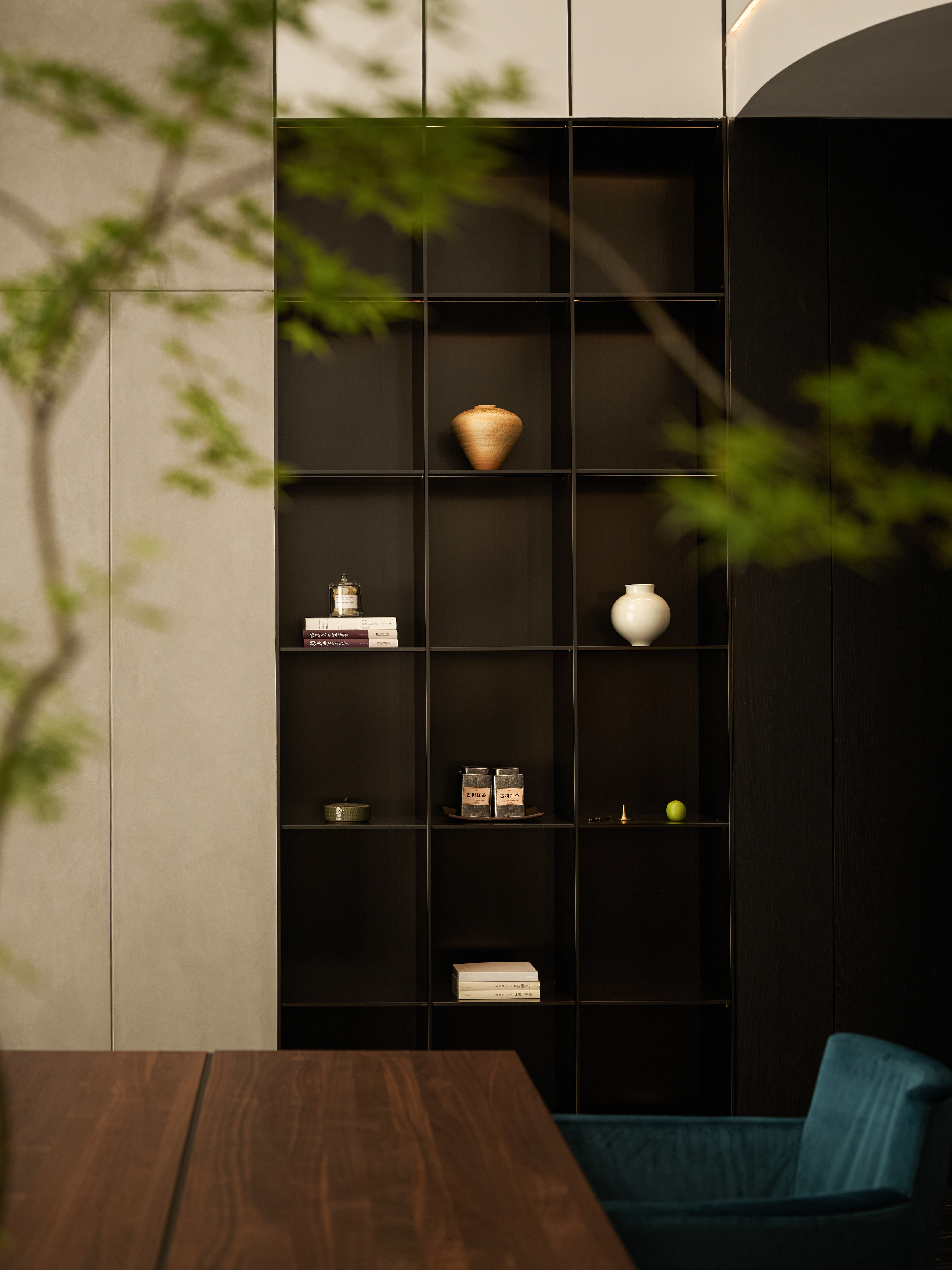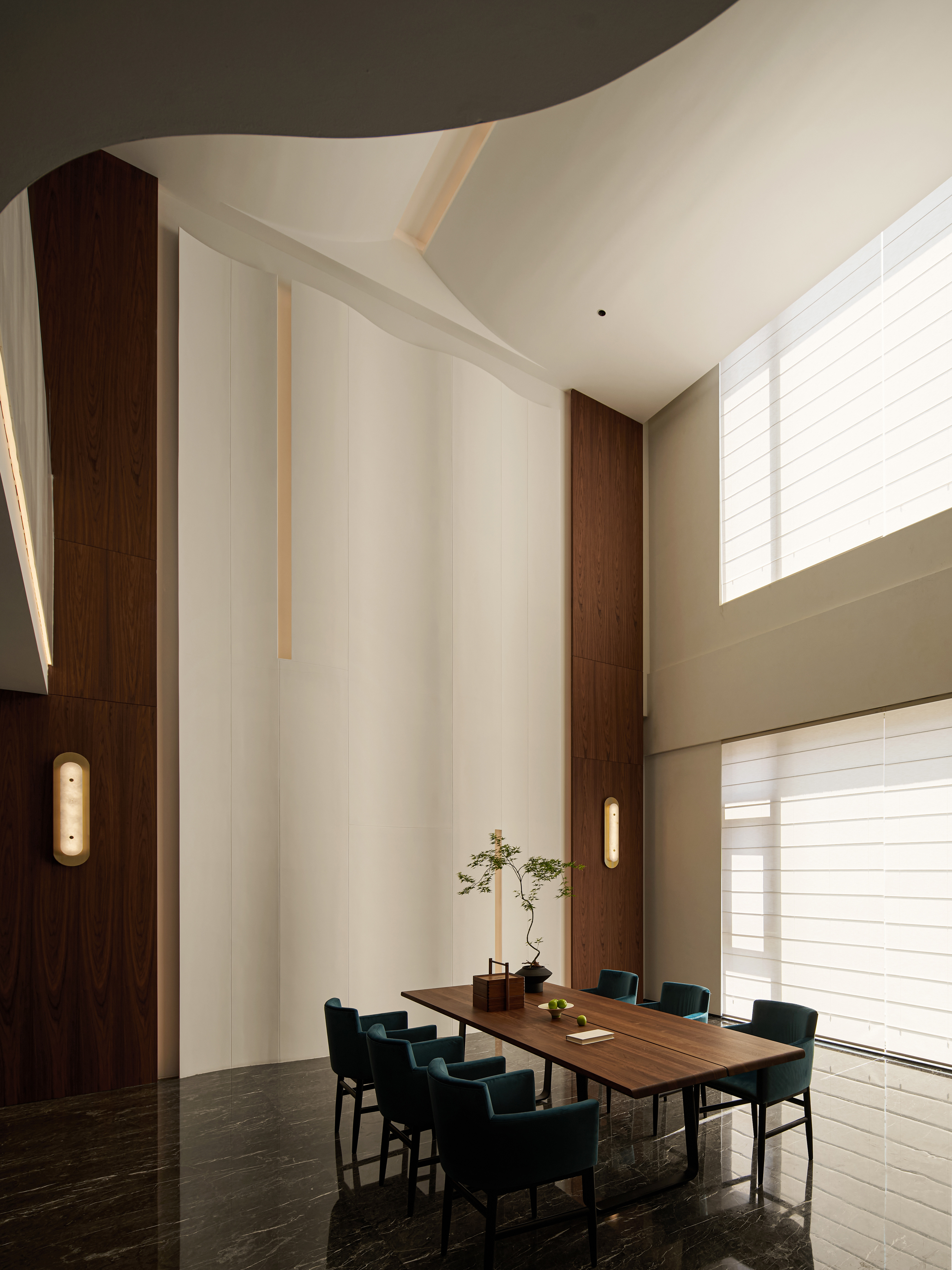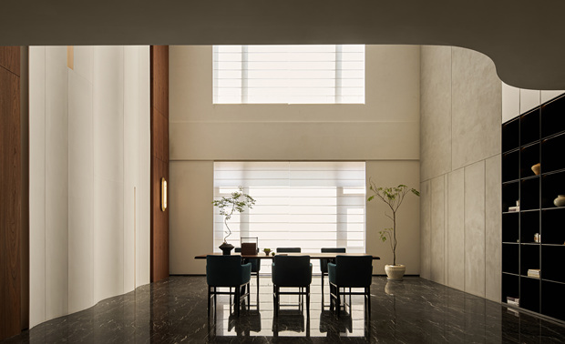 挑空茶室作为第三层精神场域的核心,不仅连接功能空间,更承载文化意象。东方哲思在光影中回旋,空间肌理柔和、材质内敛,构建一处可供沉思与交流的精神场所。