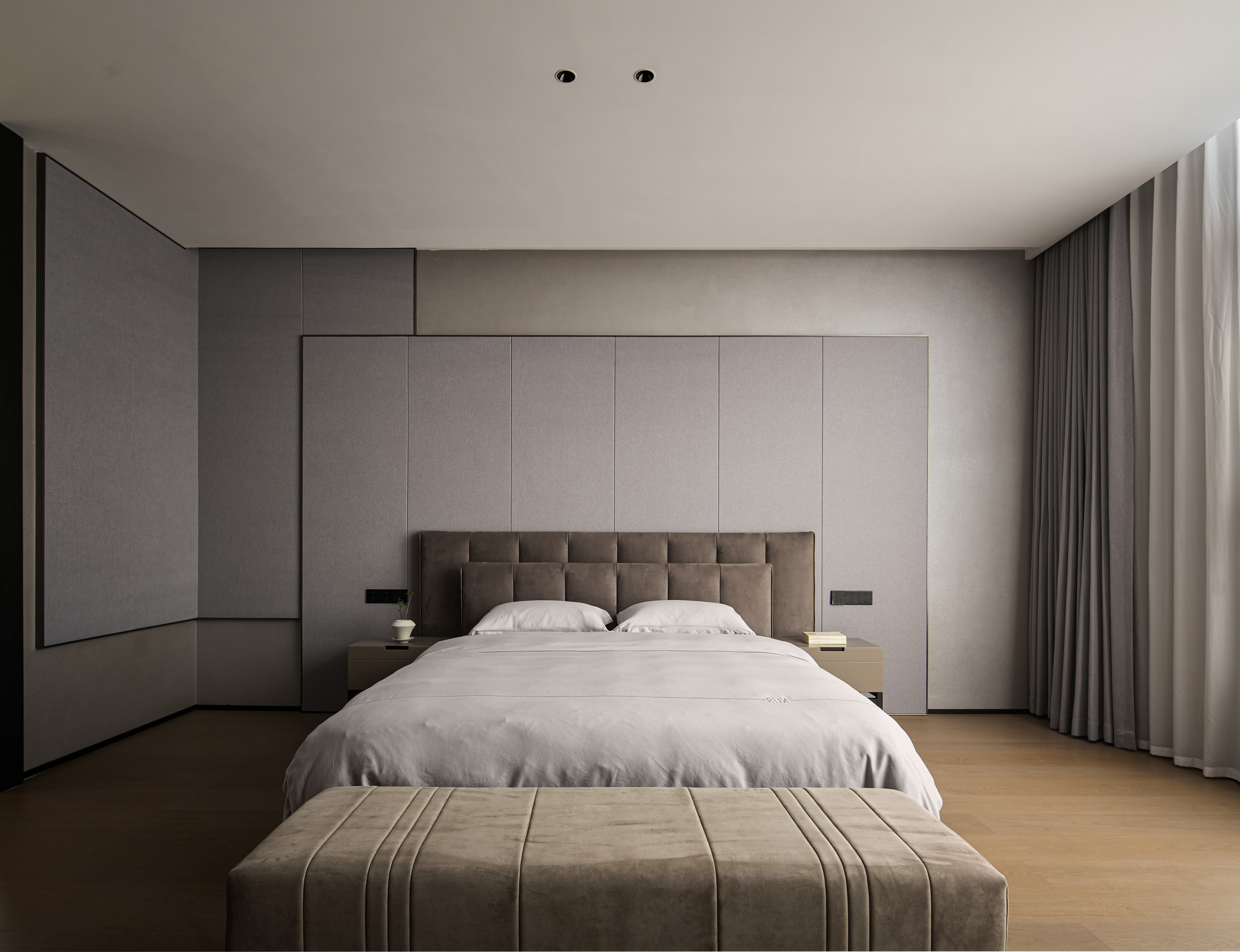 卧室设计秉持“舒适至上”的原则,整体配色柔和协调,营造静谧安然的私密氛围。 我们特意舍弃传统主灯方案,采用无主灯设计,以隐藏光源营造出更具松弛感与高级感的空间体验。 床头背景结合涂料与硬包材质,形成丰富的层次感,赋予空间柔韧而细腻的质感。