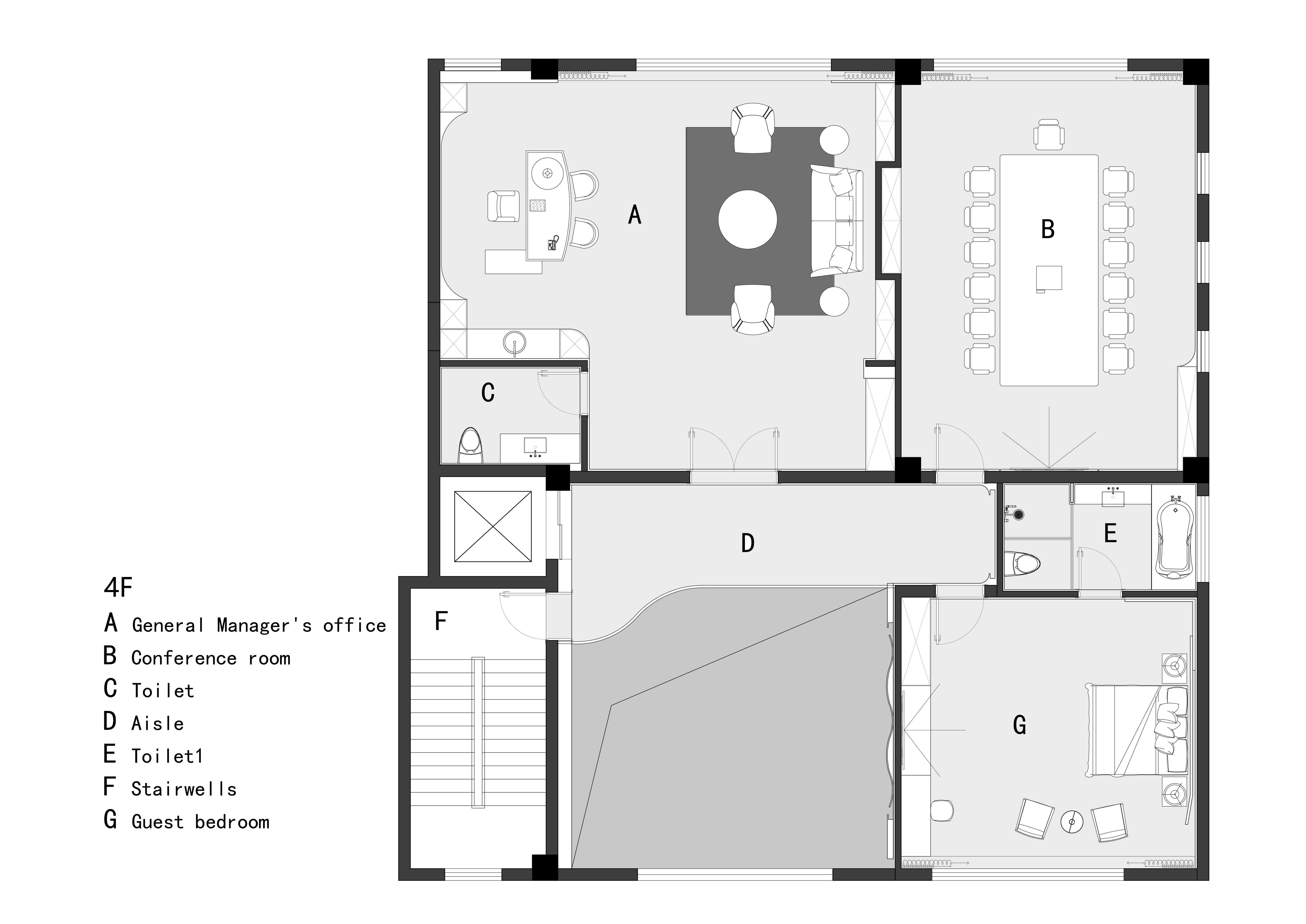 四层为多功能复合空间,设有总经理办公室、会议室与客房。电梯出口为挑空区,迎面为茶室背景墙,形成良好的空间引导与视觉延展。各功能区在私密性与实用性之间取得巧妙平衡,兼顾居住与接待需求。