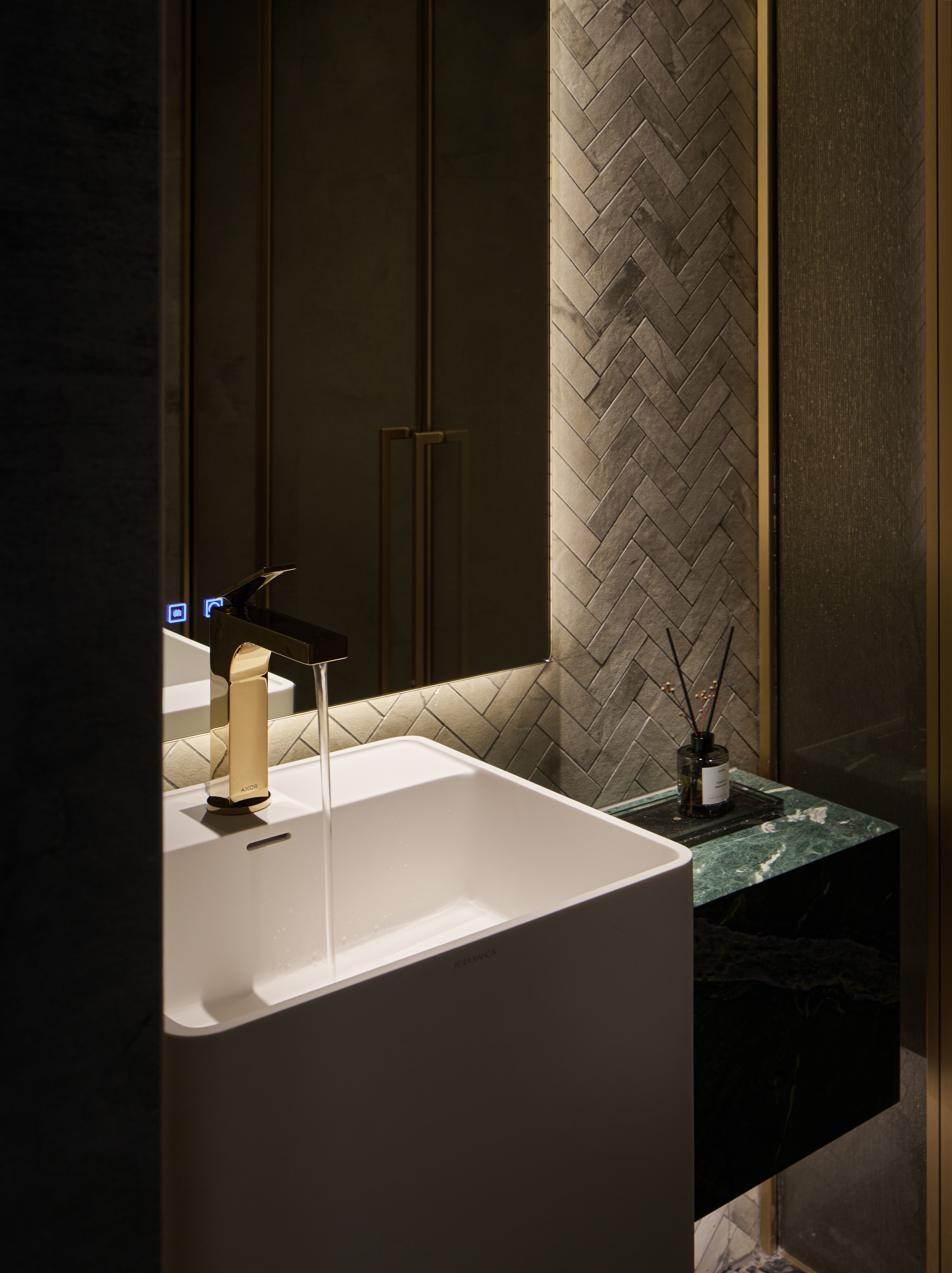 考虑到此商业别墅一二层为办公空间,第一印象非常重要,一层大厅挑空设计,与背景形式上呼应,材质上统一,颜色上对比,整个一层选择鱼肚灰石材,背景鱼肚白,简与奢相互渗透。