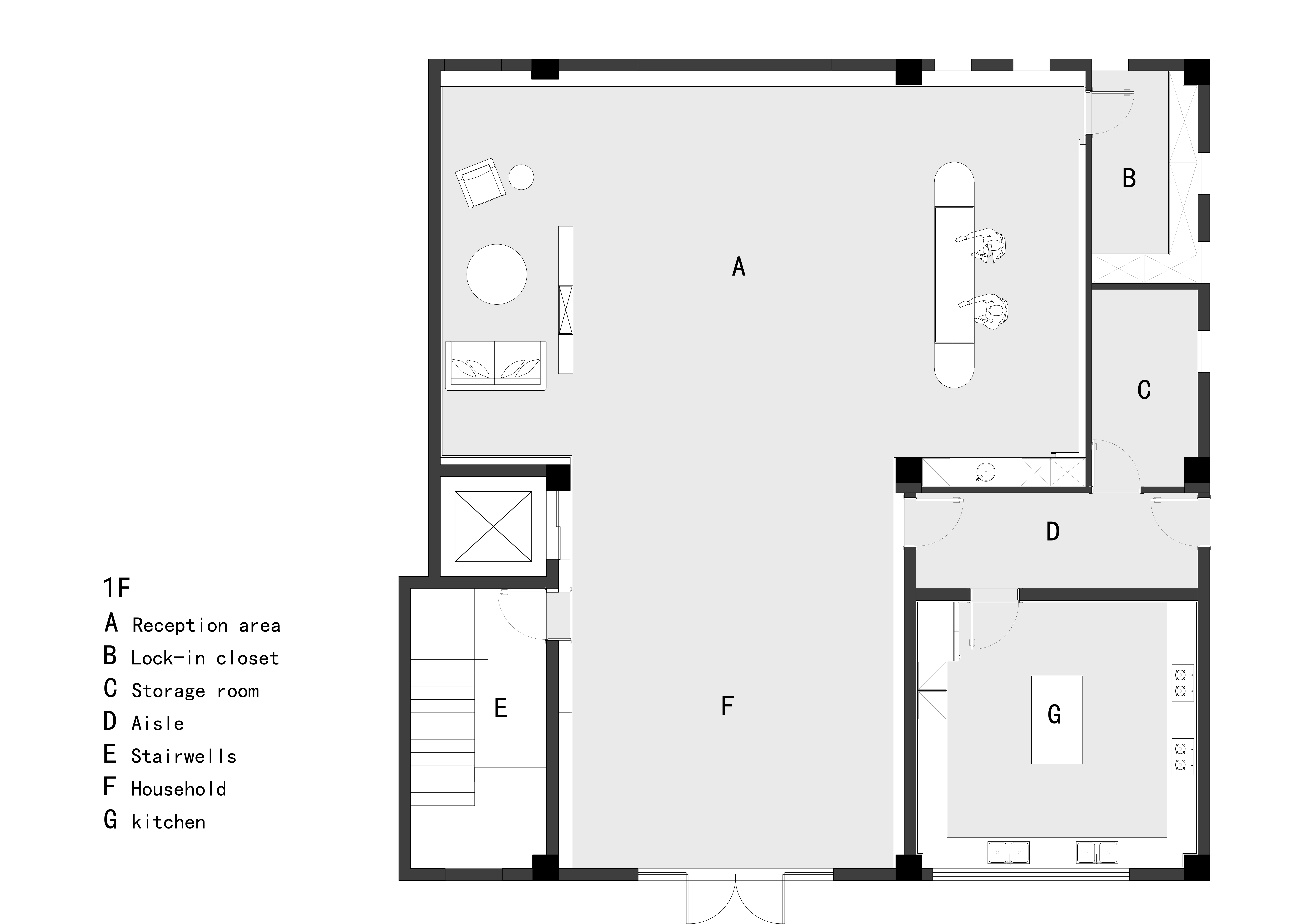 本案位于科技园区之中,属办公型别墅项目,单层建筑面积为240㎡,总建筑面积约1200㎡。 一层主要为公共接待与服务区域,包含门厅、前台、等候区及厨房。设计上采用开放式布局,强调空间流动性与功能整合,通过合理组织动线,提升整体空间的迎宾体验与功能效率。