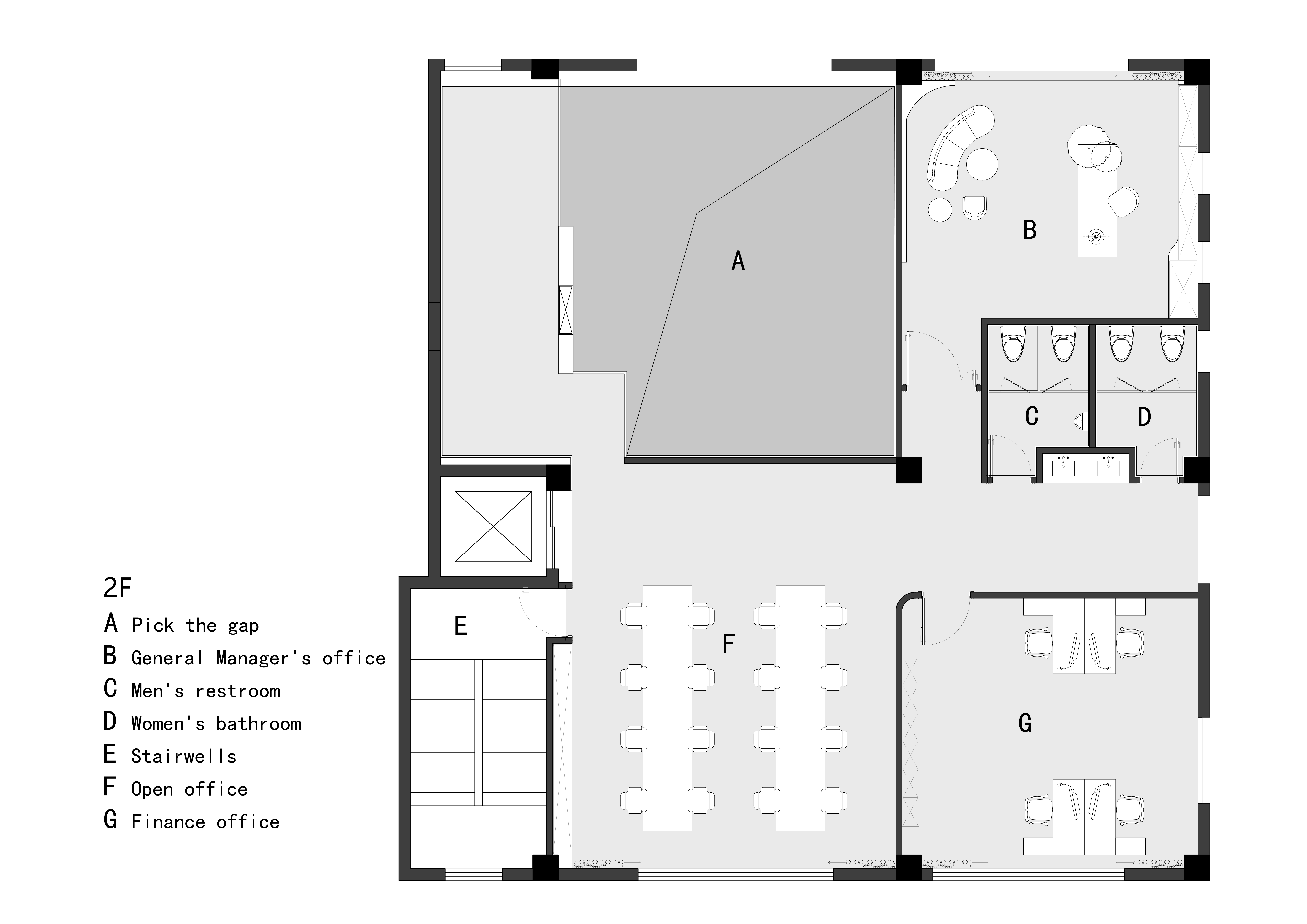 二层为核心办公区域,设有开放式办公区、独立办公室与卫生间,并预留挑空共享区以增加上下楼层之间的视觉渗透与空间互动,打造富有交流氛围的办公平台。