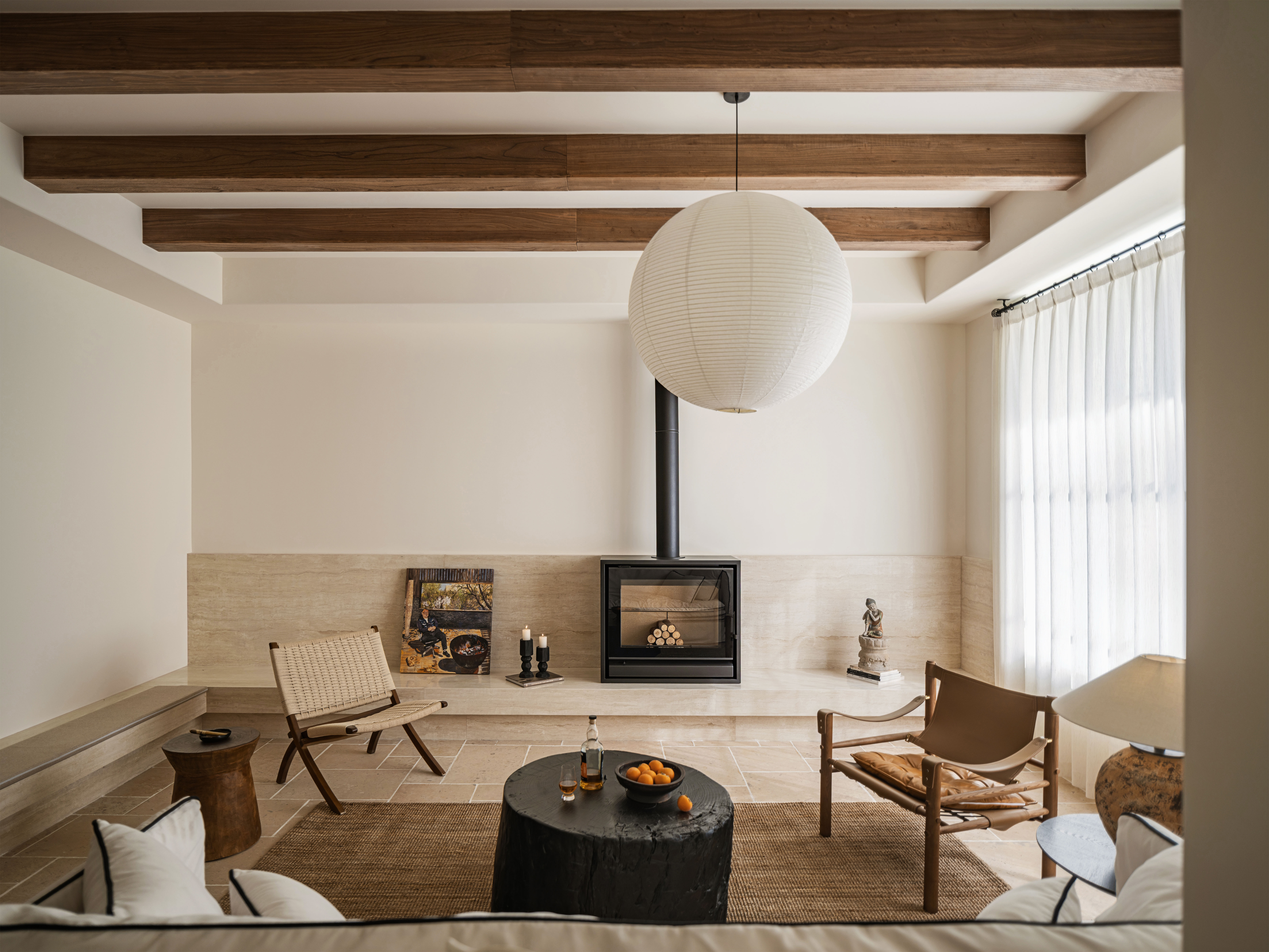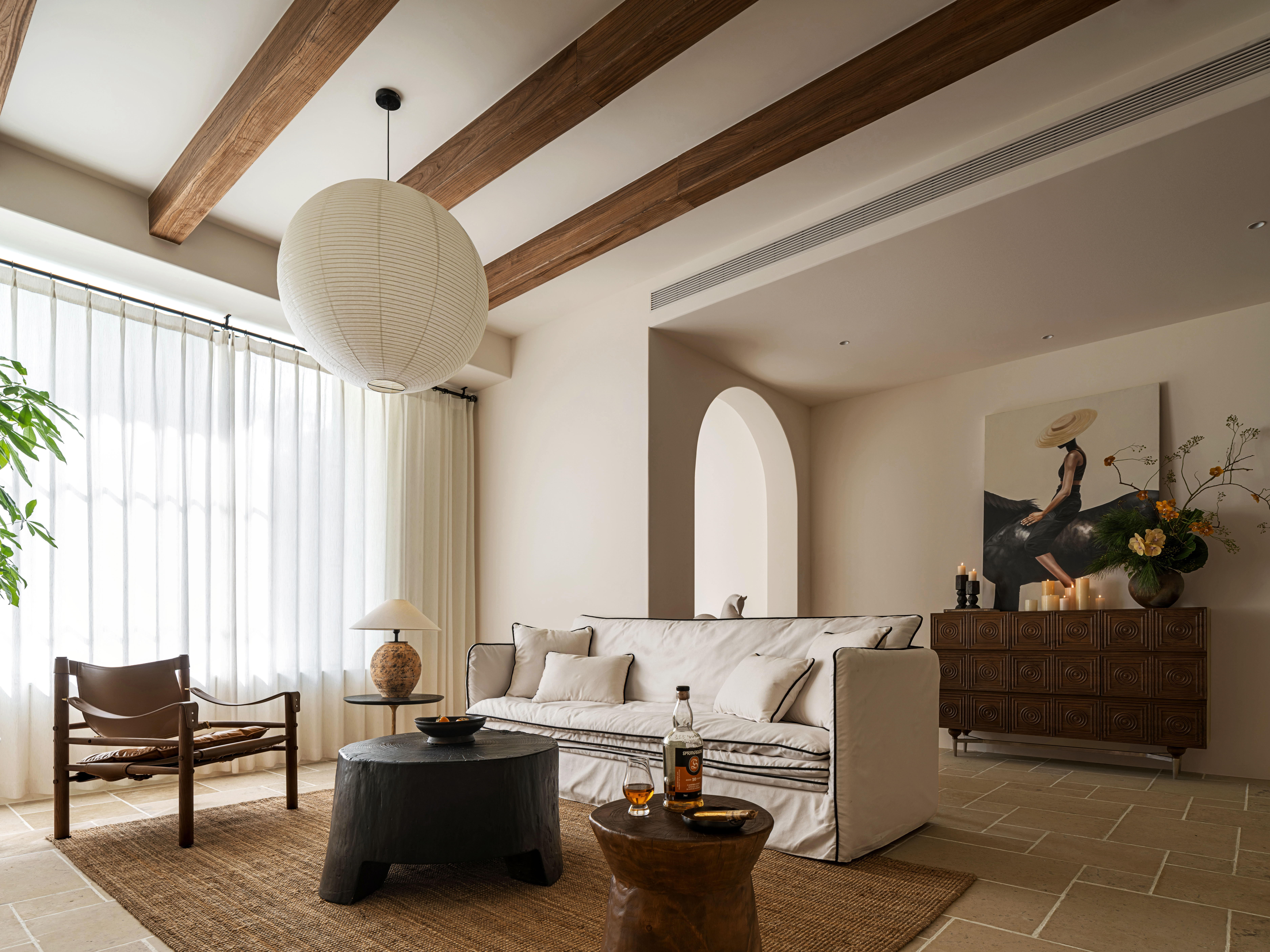 会客厅的木质梁增加了空间的温润质感,明火壁炉则烘托了别墅的度假氛围。
