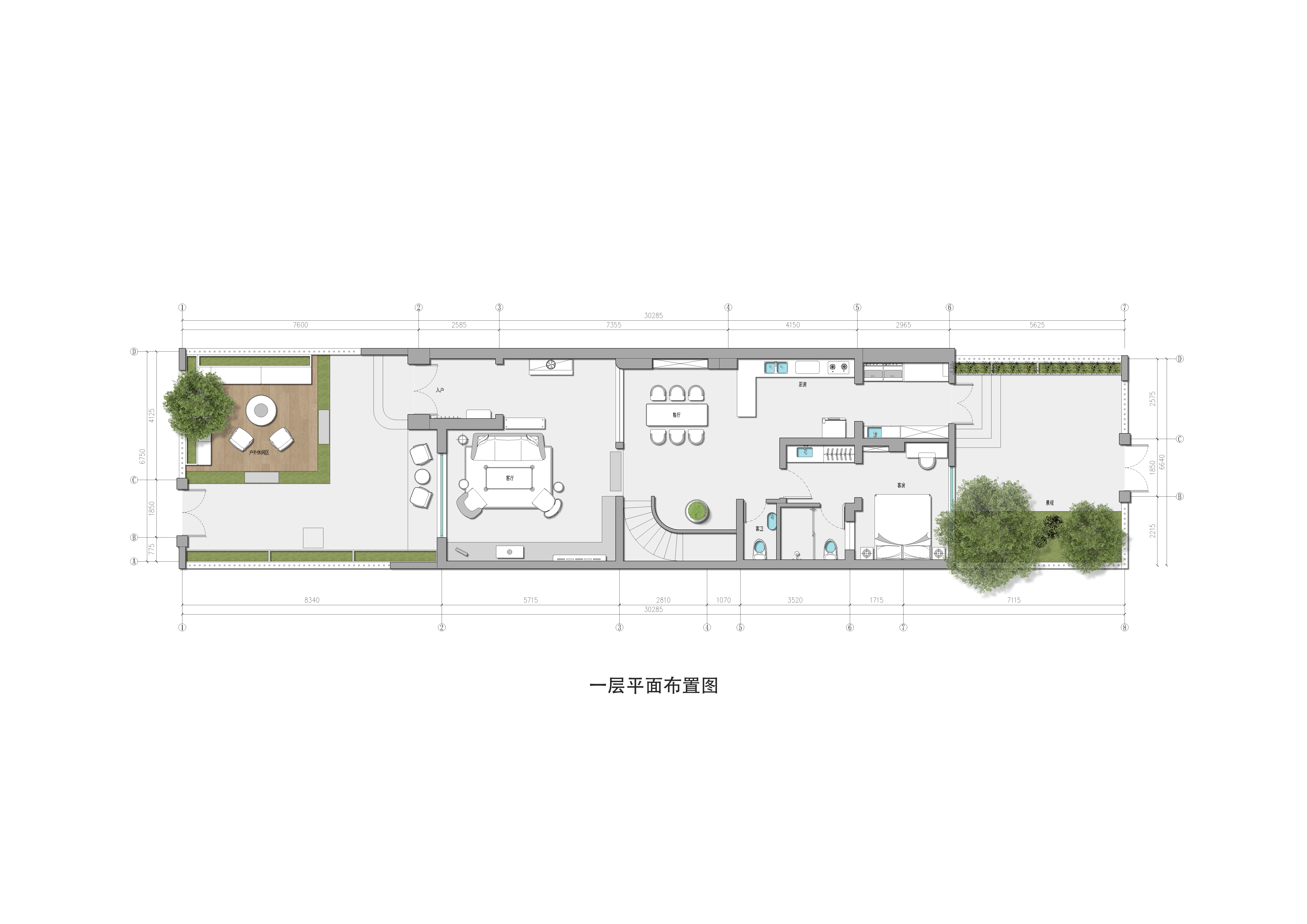 一层平面布置图,前后院是空间休闲的亮点。