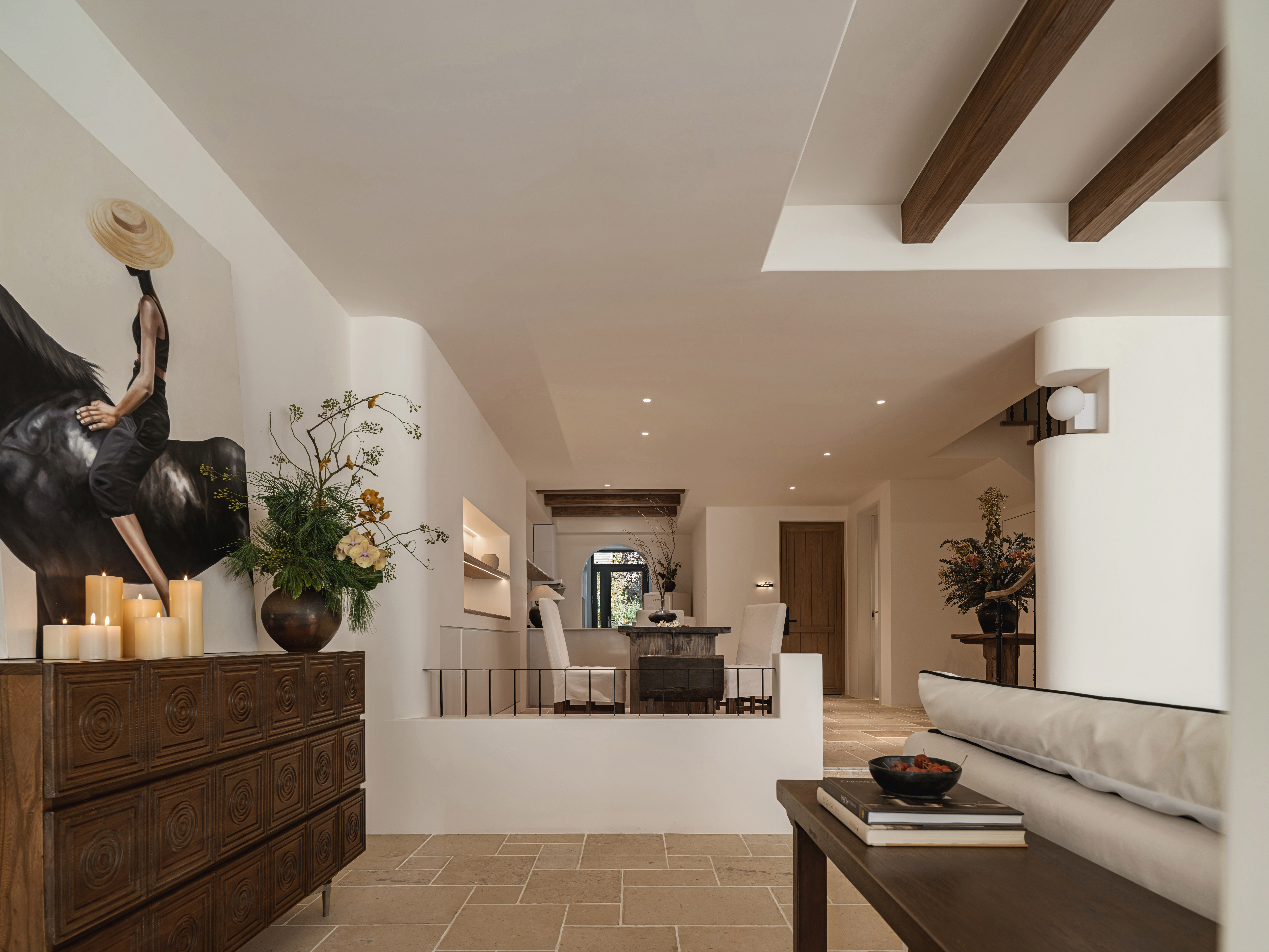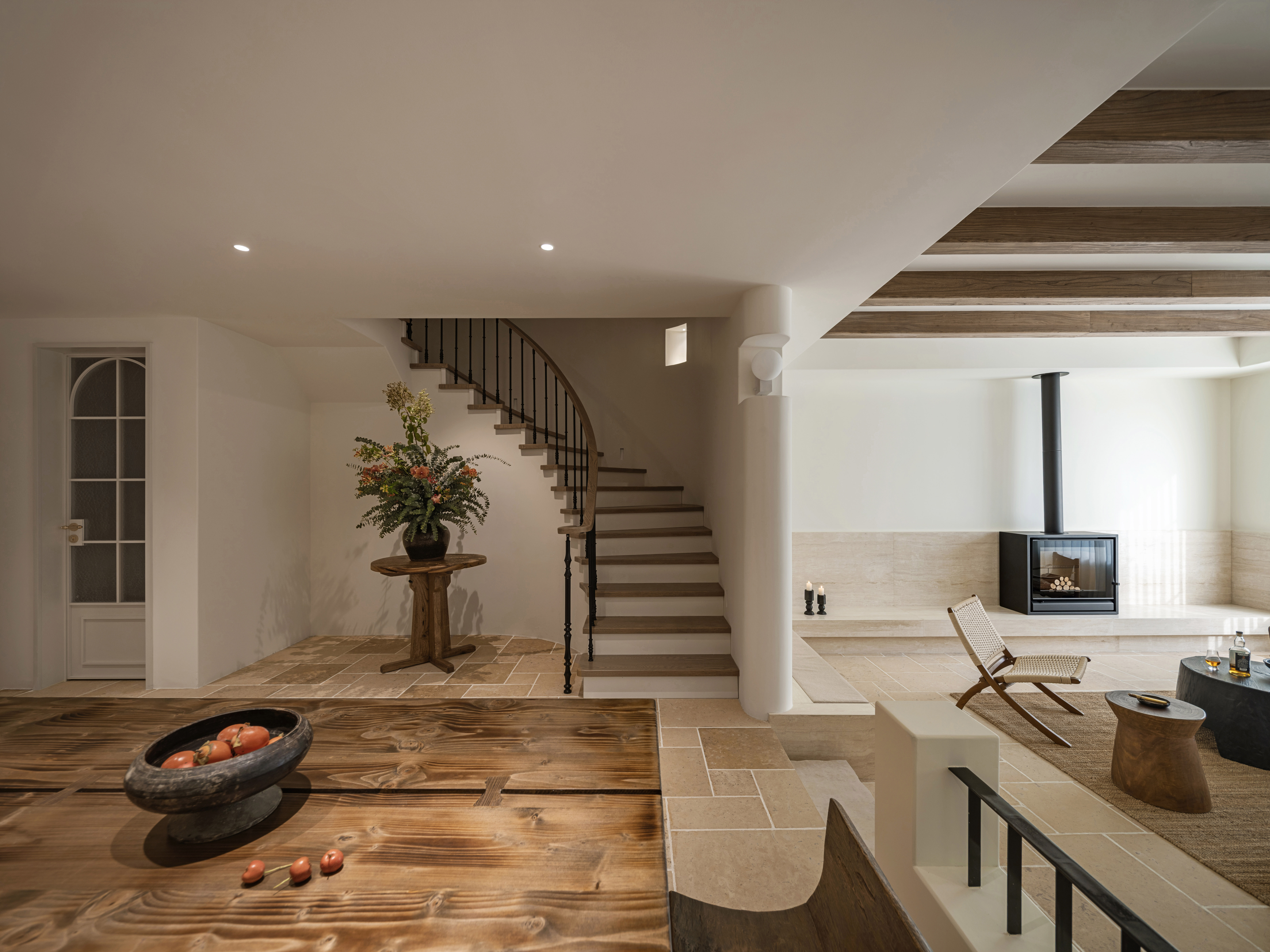 设计选材:因为是度假别墅,所以设计在选材上,主要突出松弛和自然的质感,别墅的地面我们选用了哑光面的莱姆石,这种材质随着时间的变化它的肌理也在变化,是会呼吸的材料。