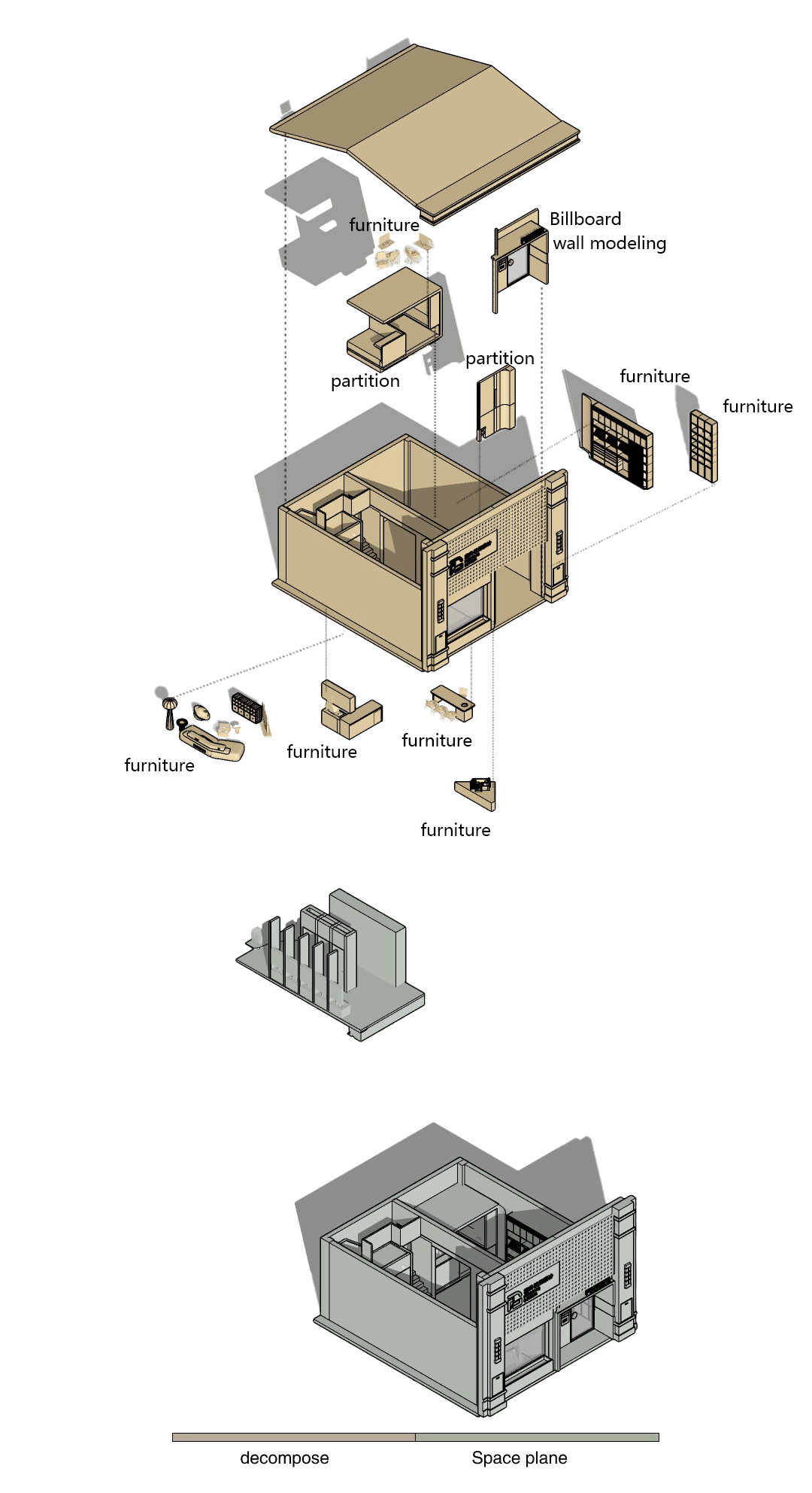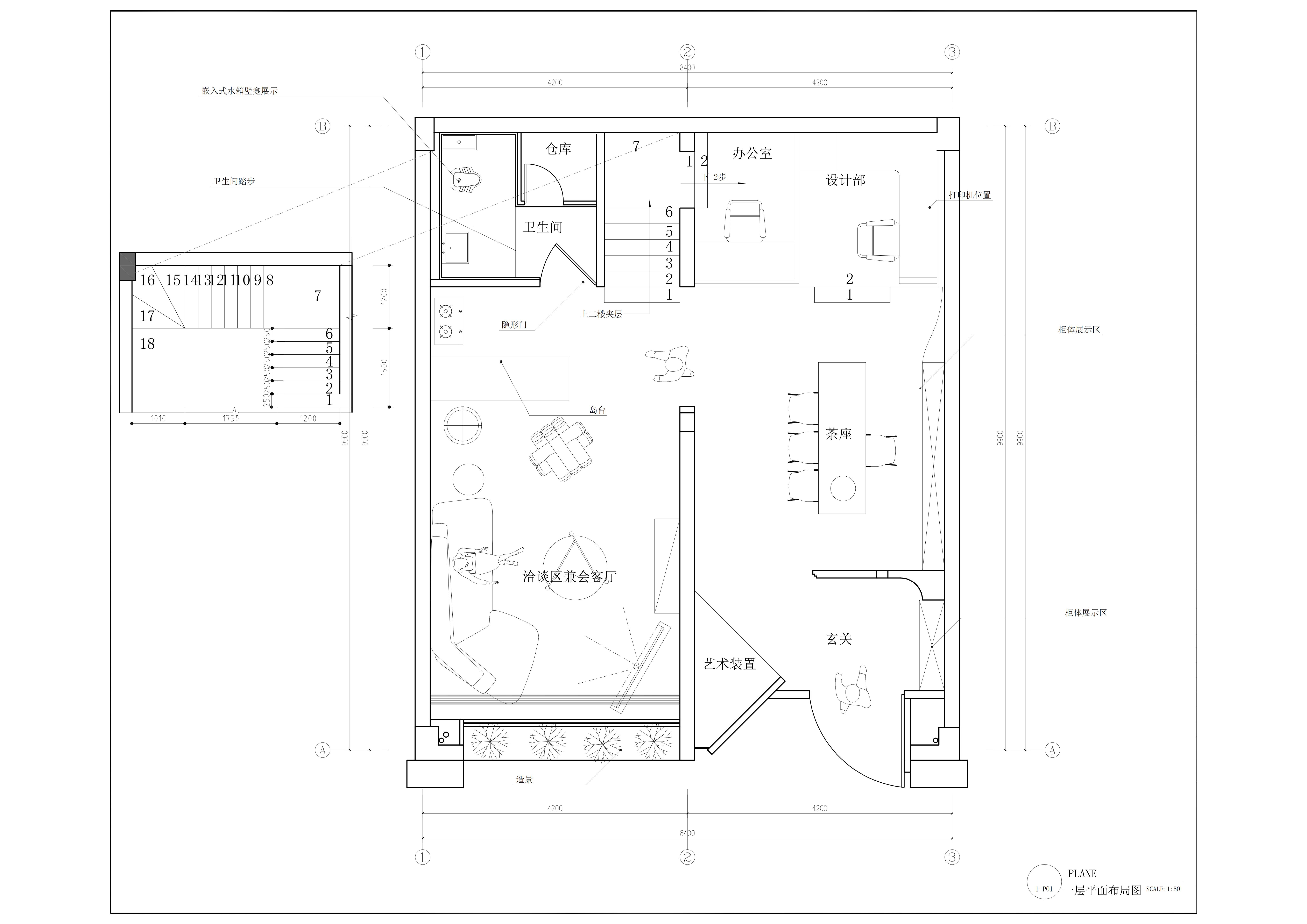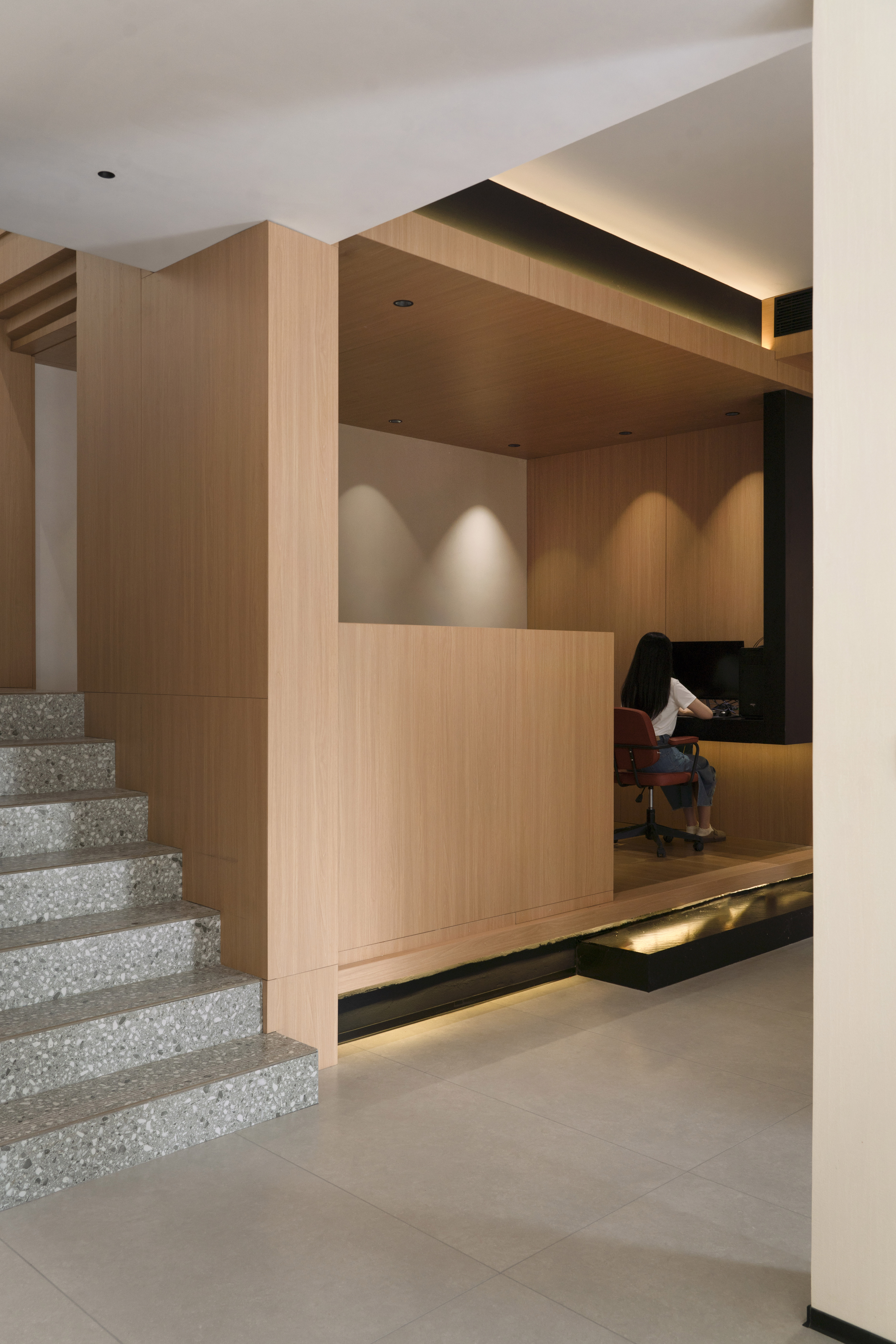 空间布局:打破常规进门方案做斜墙门洞做小让里面的空间若隐若现 进门玄关做 富升的标志性物件F让这个空间玄关透镜的 茶室结合选样柜多功能的结合让空间更合理也做弧形延升到设计部办公区 设计部办公区域做BOX里面错层办公区域 会客厅兼备汇报方案客厅情景间 智能灯光情景间 上二楼区域利用楼梯底部做了卫生间 二楼为产品展示区