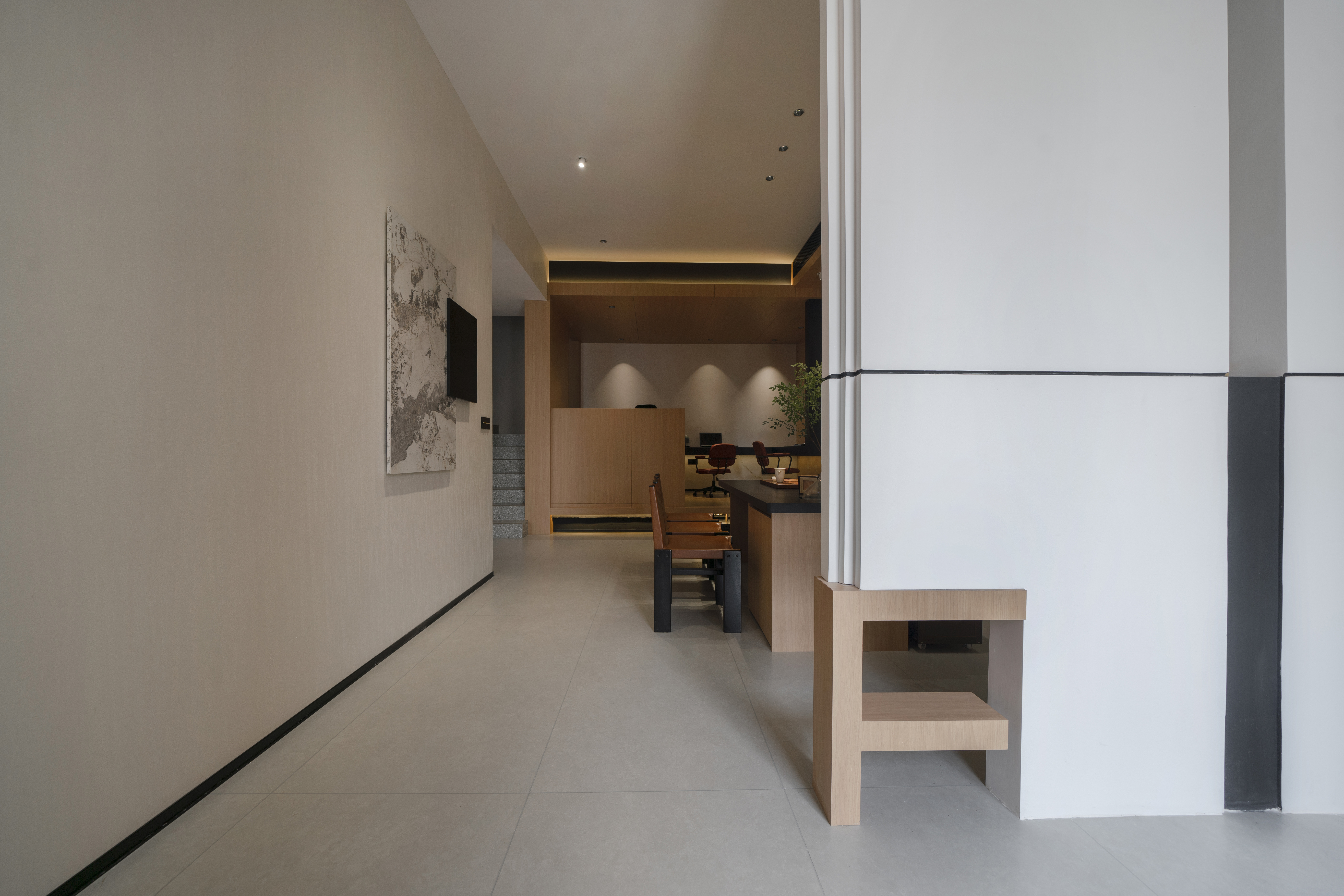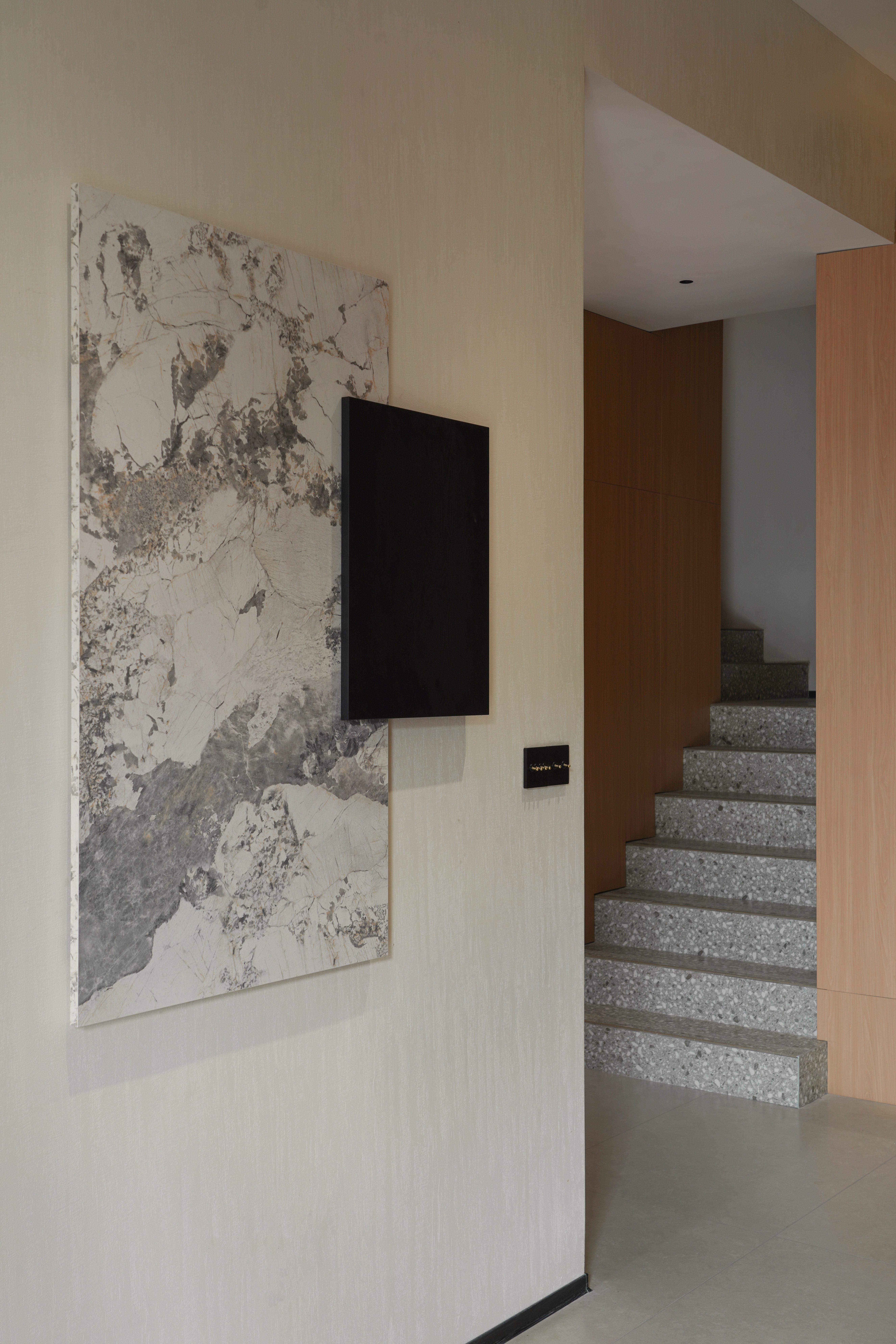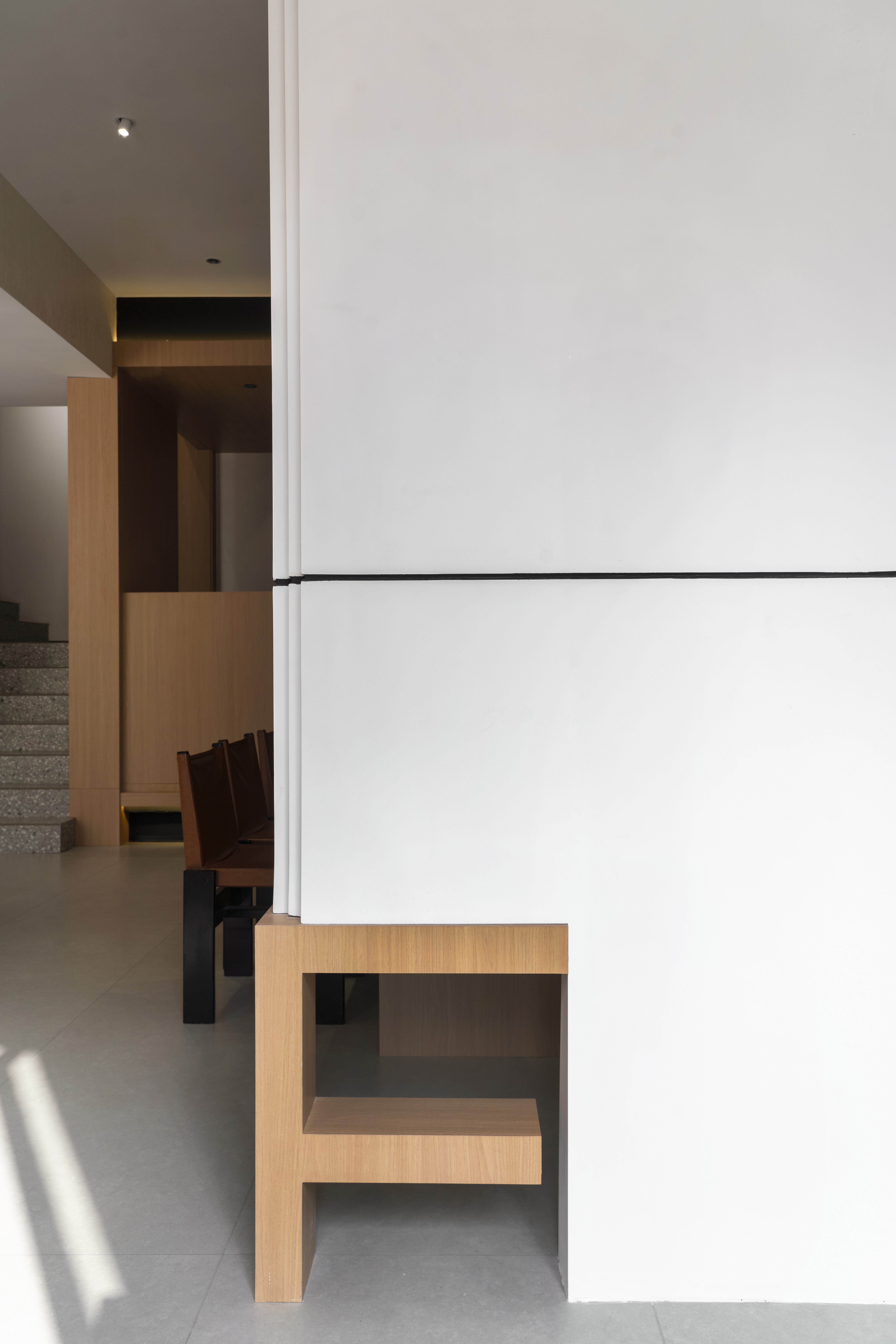 设计选材:材料主要肌理感乳胶漆+墙板来结合的一个空间