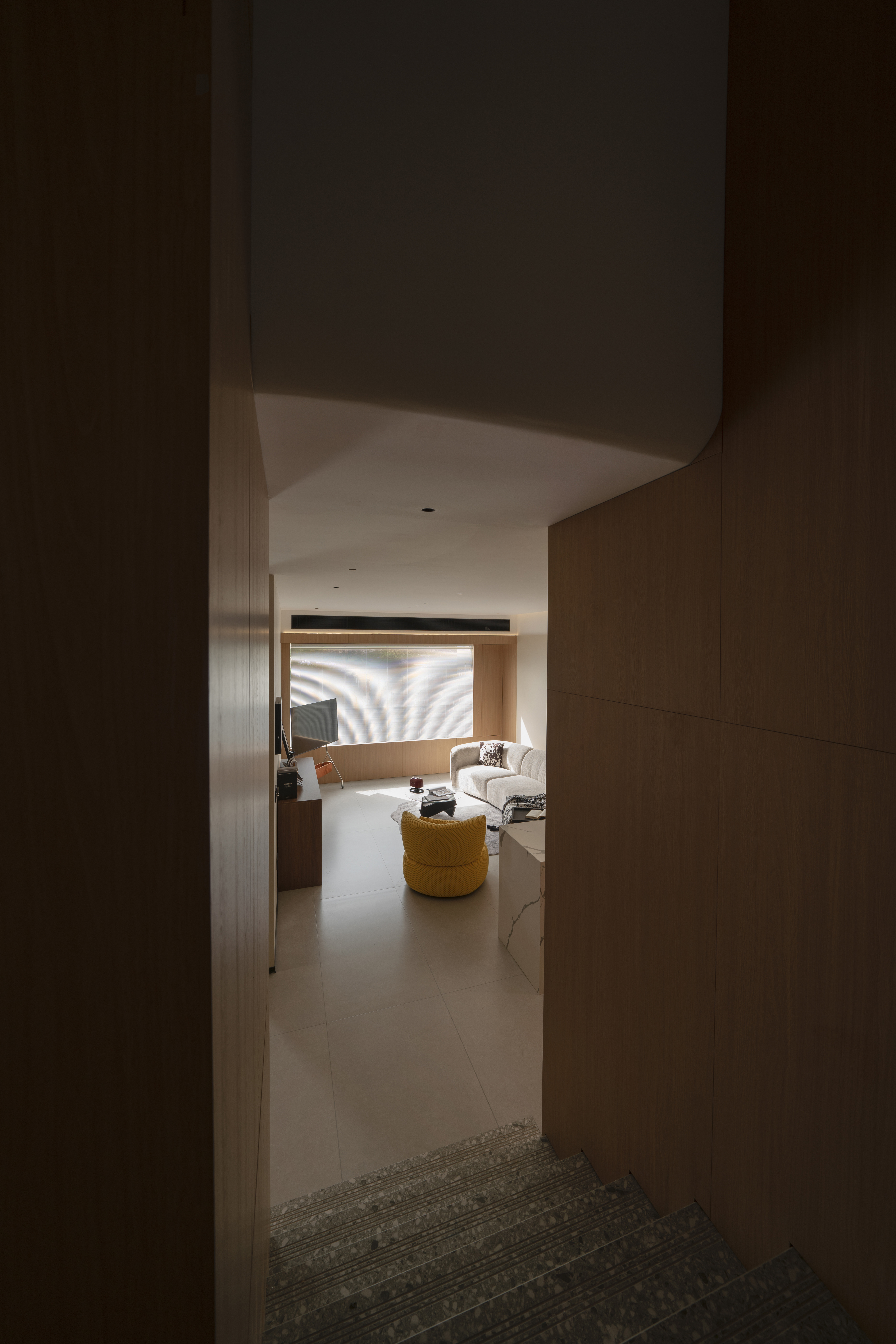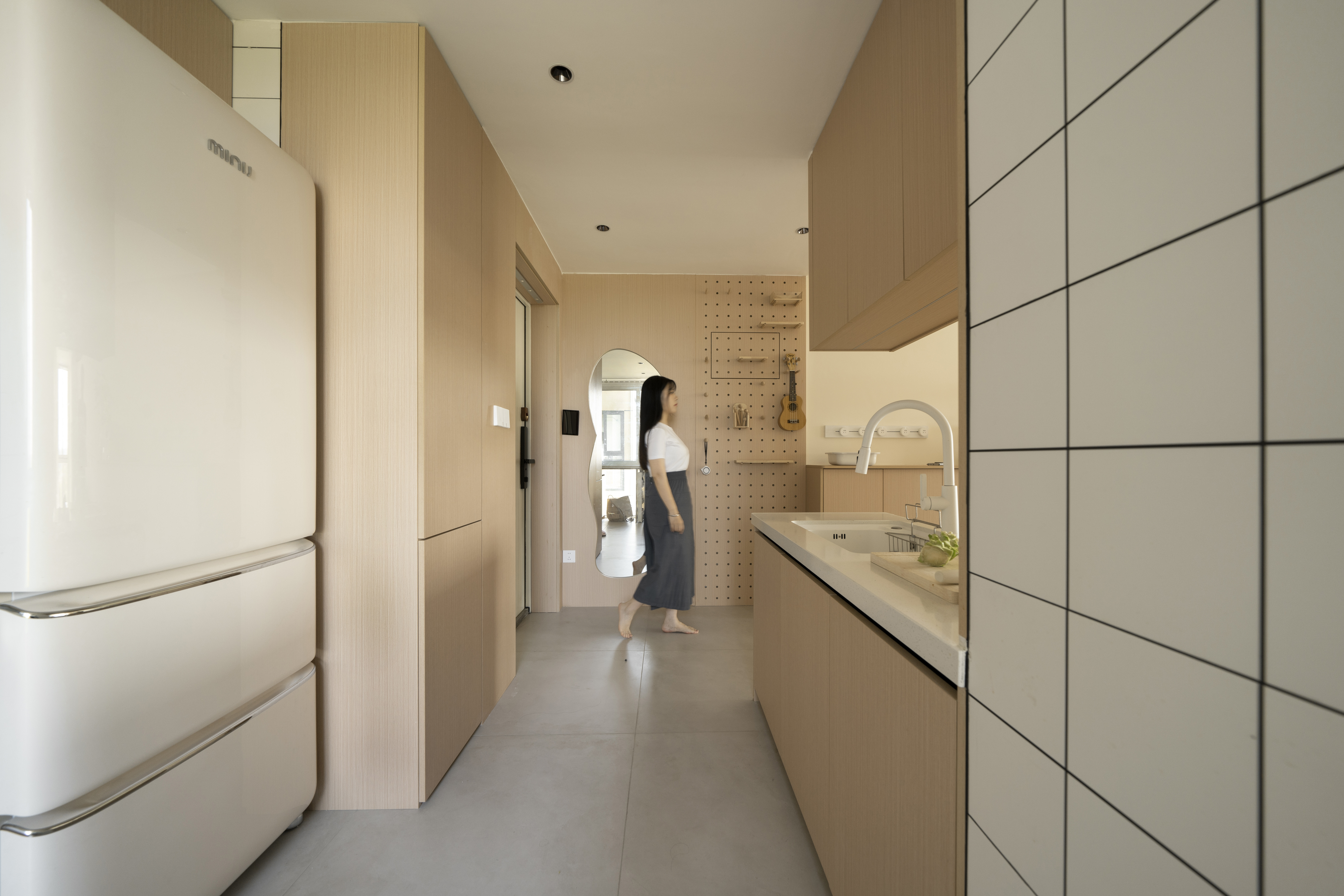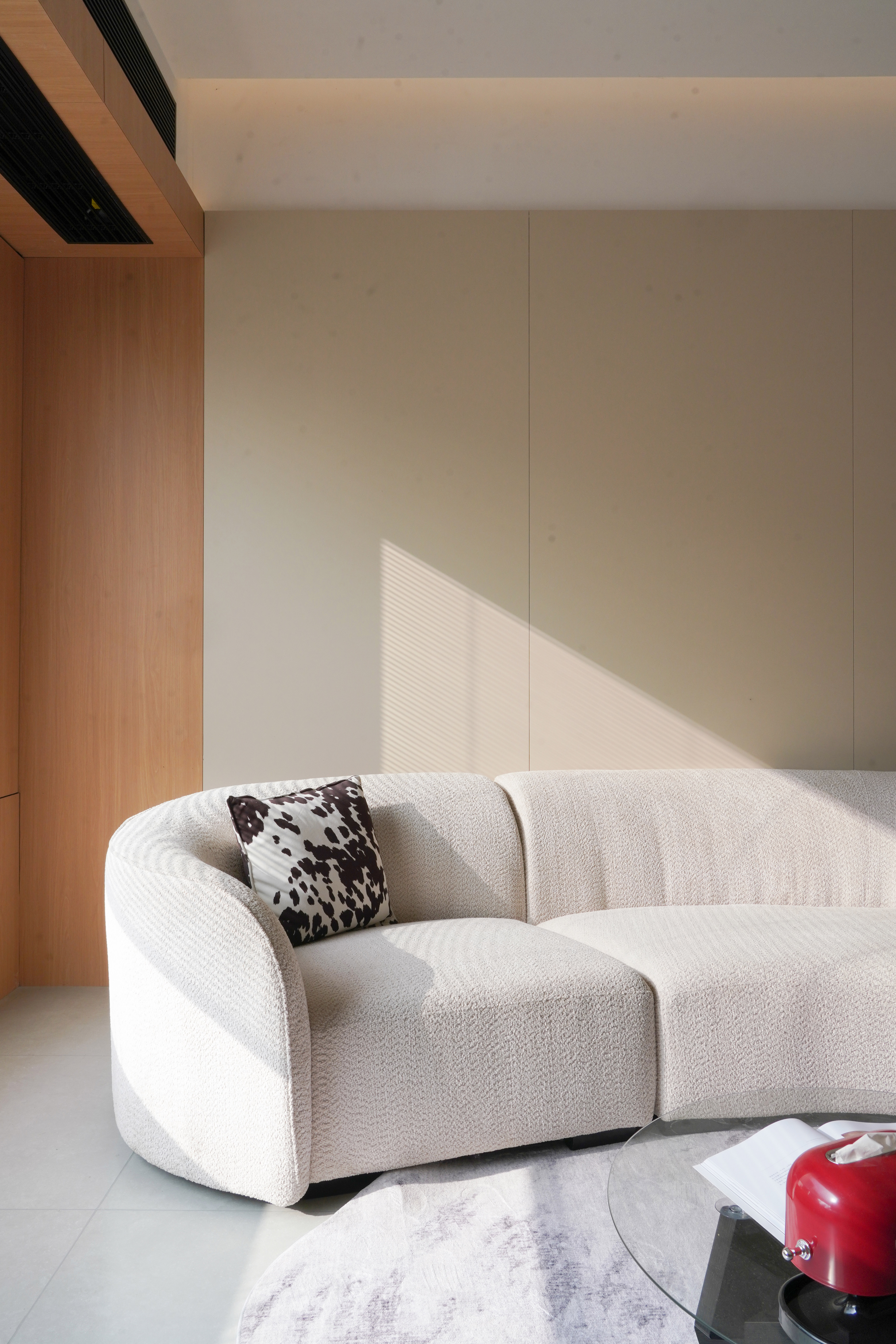 设计选材:材料主要肌理感乳胶漆+墙板来结合的一个空间