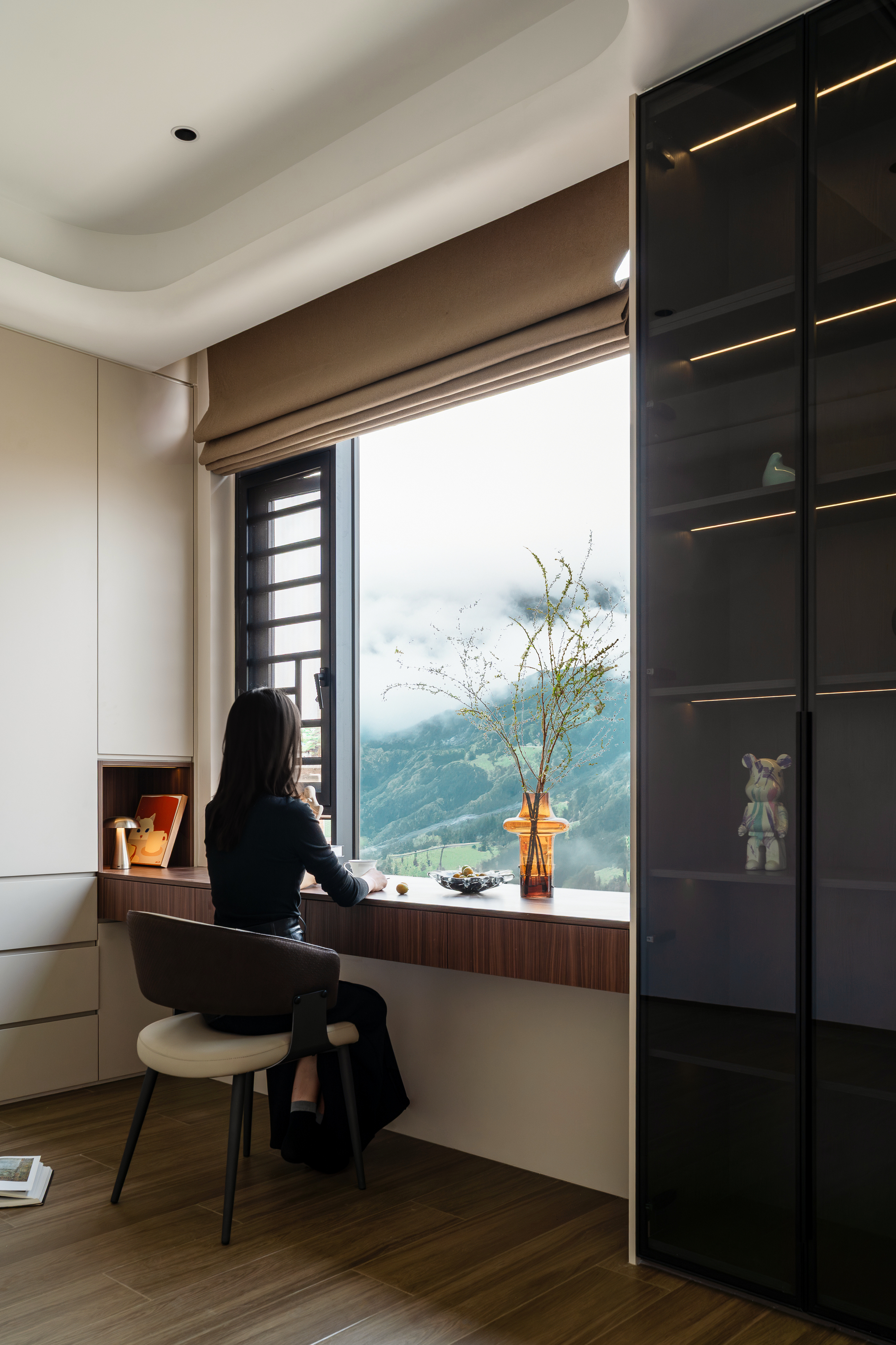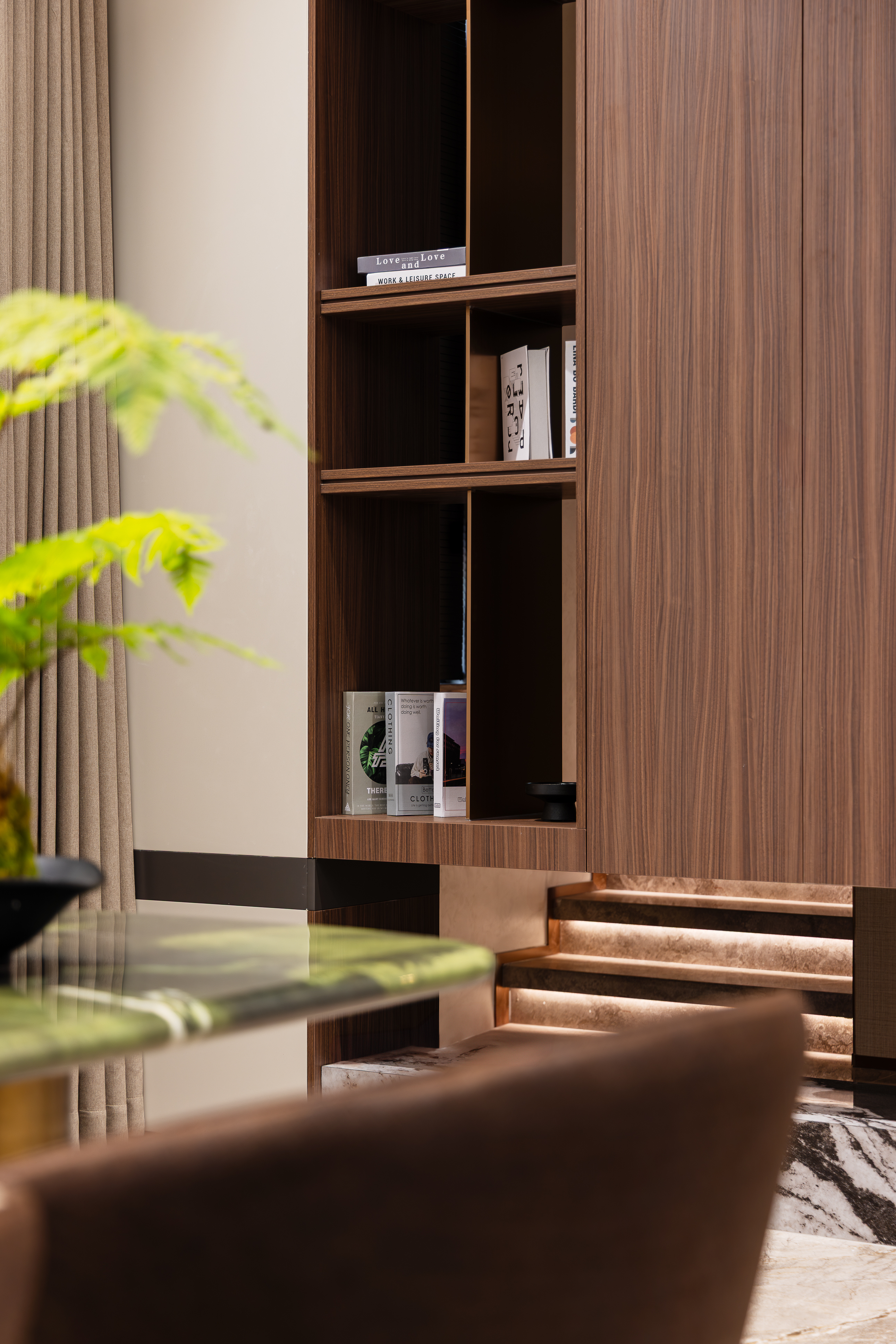 空间意境:1. 材质碰撞的新表达:突破传统轻奢对金属、玻璃的单一运用,将深色木饰面的温润、大理石的冷冽、绒布/皮革软装的柔软进行混搭,如客厅背景墙的白色大理石与胡桃木饰面的拼接,茶区黑色石材圆桌与浅米色布艺座椅的组合,在材质对比中营造层次丰富的轻奢质感,弱化“冷奢”的距离感。