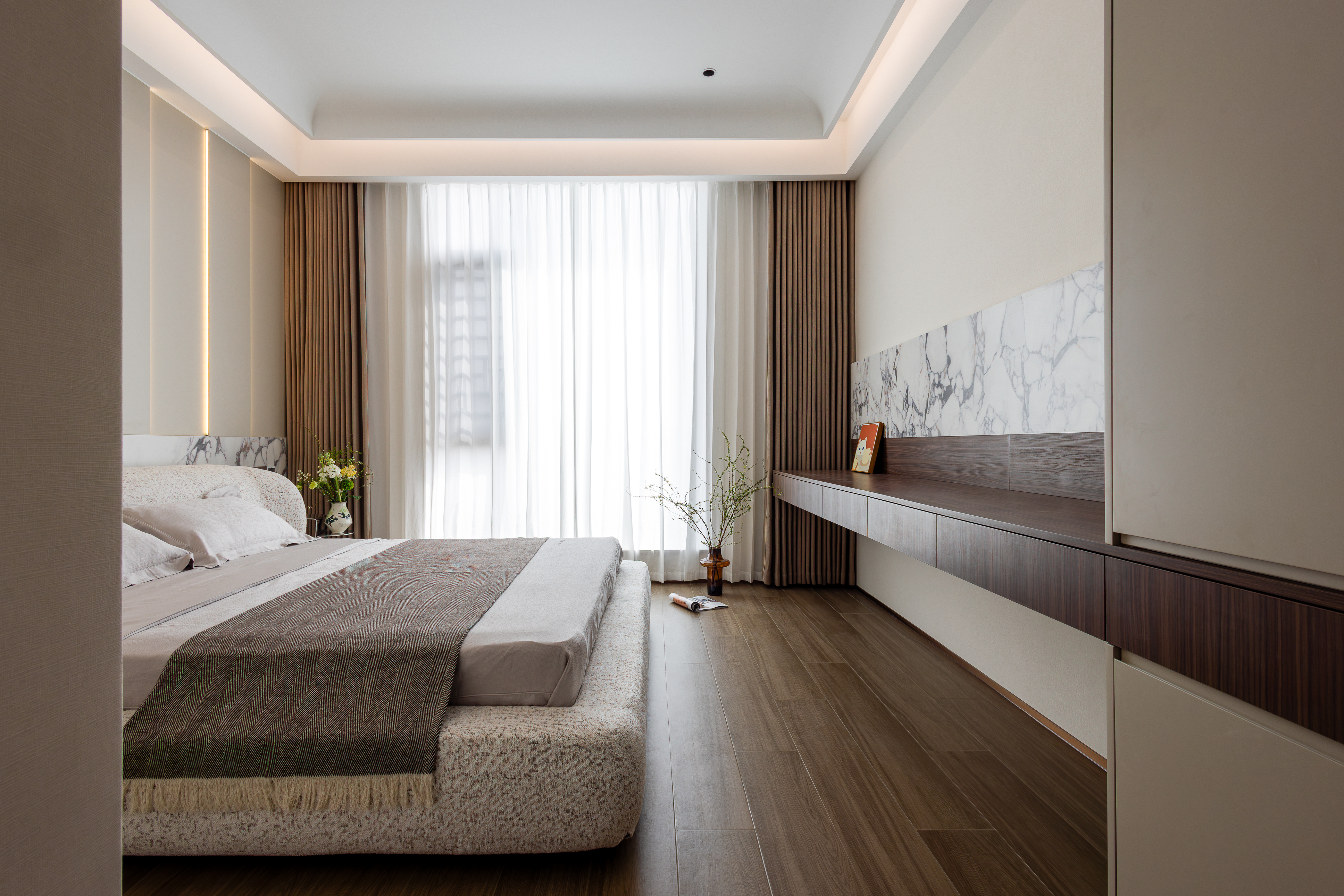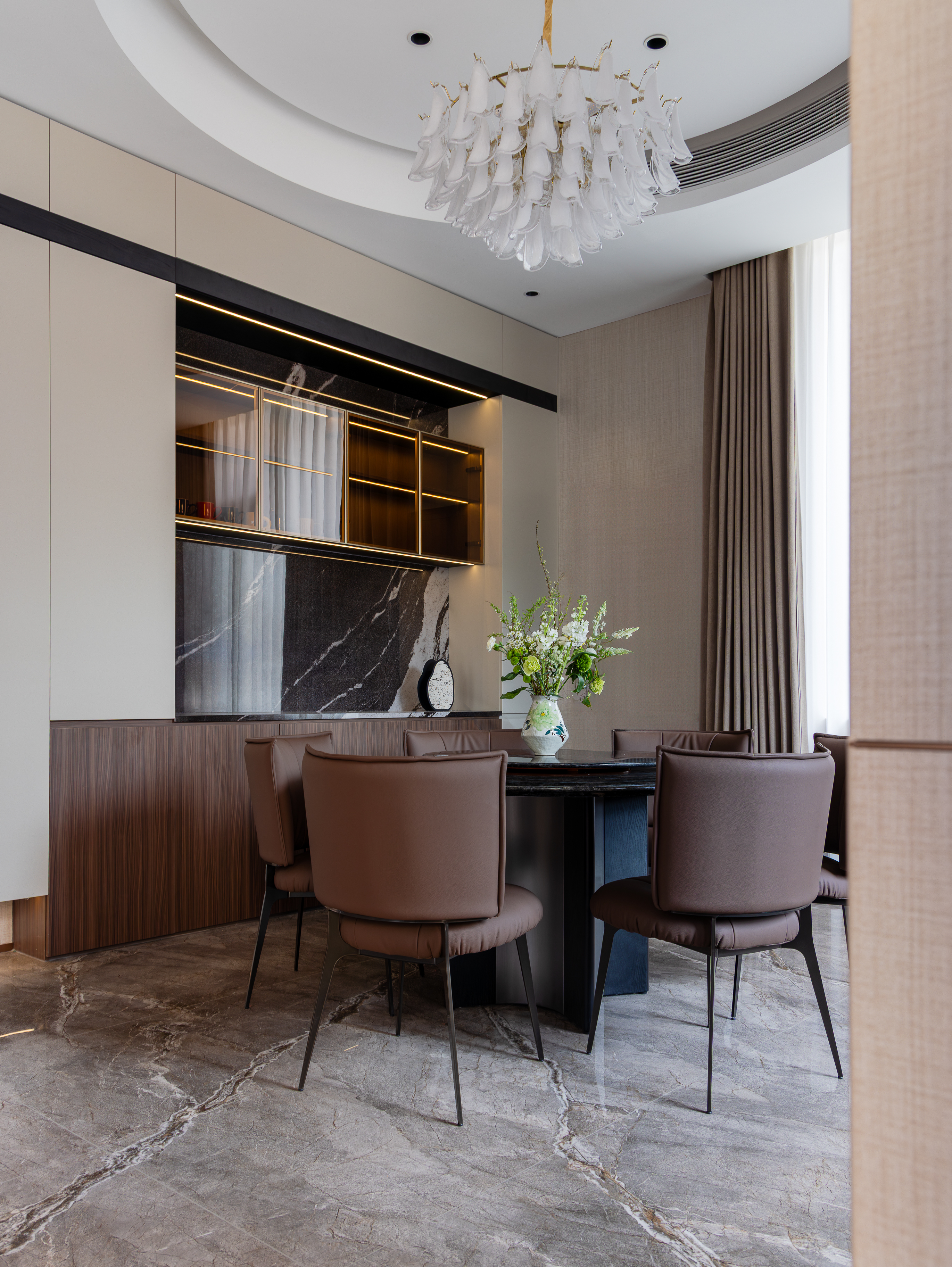 用户体验:“从设计图到实景落地,几乎没有偏差,甚至实景的质感比效果图还要惊艳。大理石和木饰面的搭配高级又不冰冷,光影设计让家里每个时段都有不同的美感,每天回家都觉得是一种享受。而且收纳空间规划得特别合理,家里始终整整齐齐,真正实现了颜值和功能的双赢。”