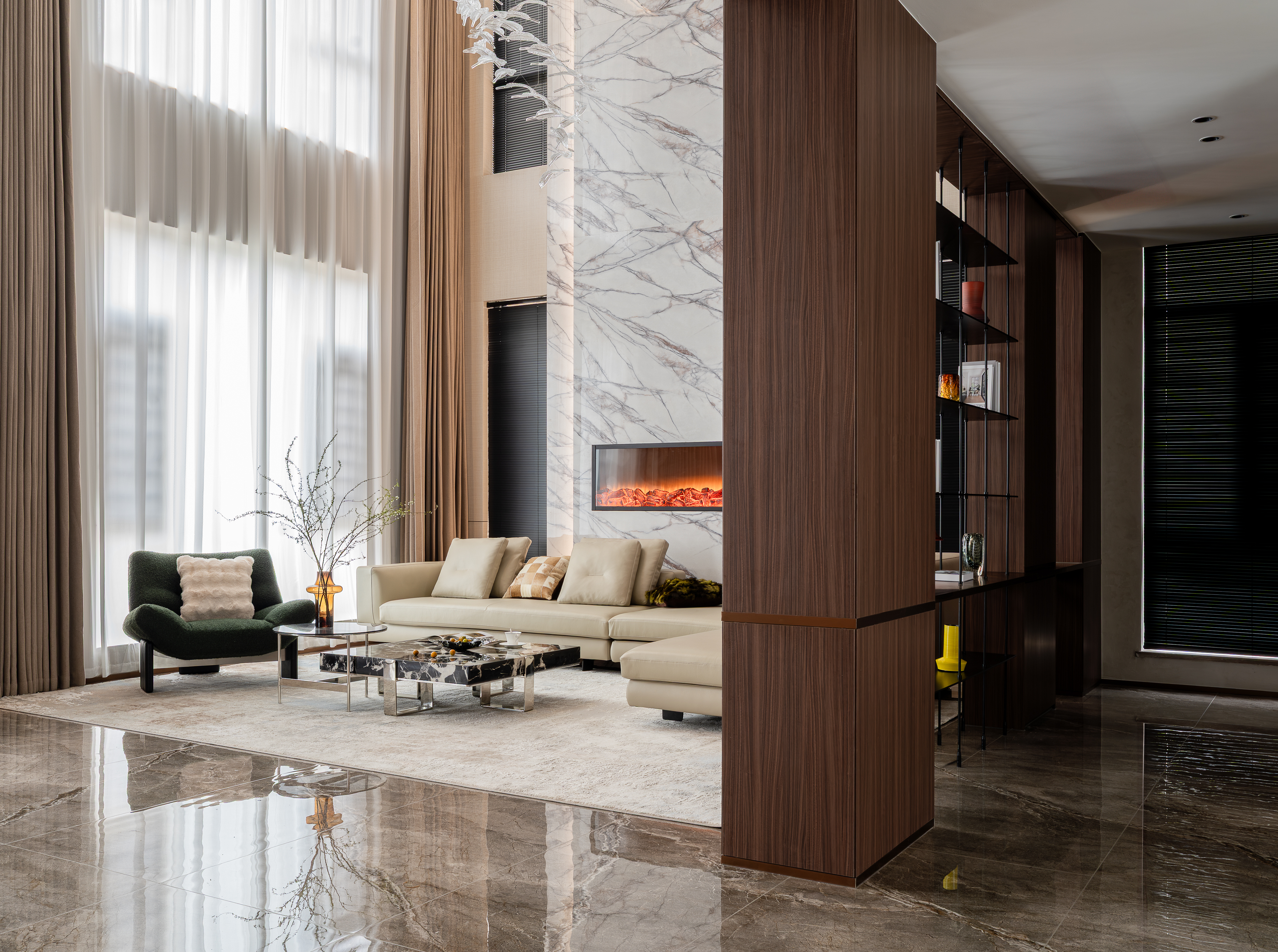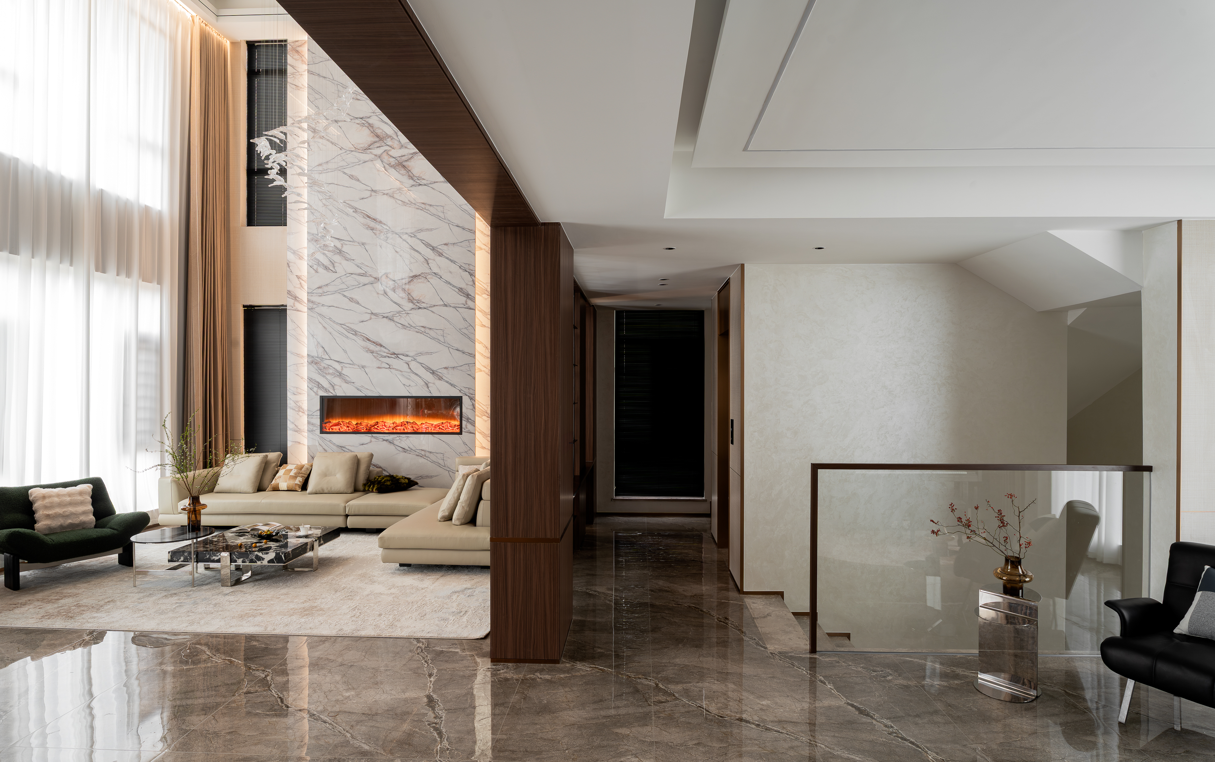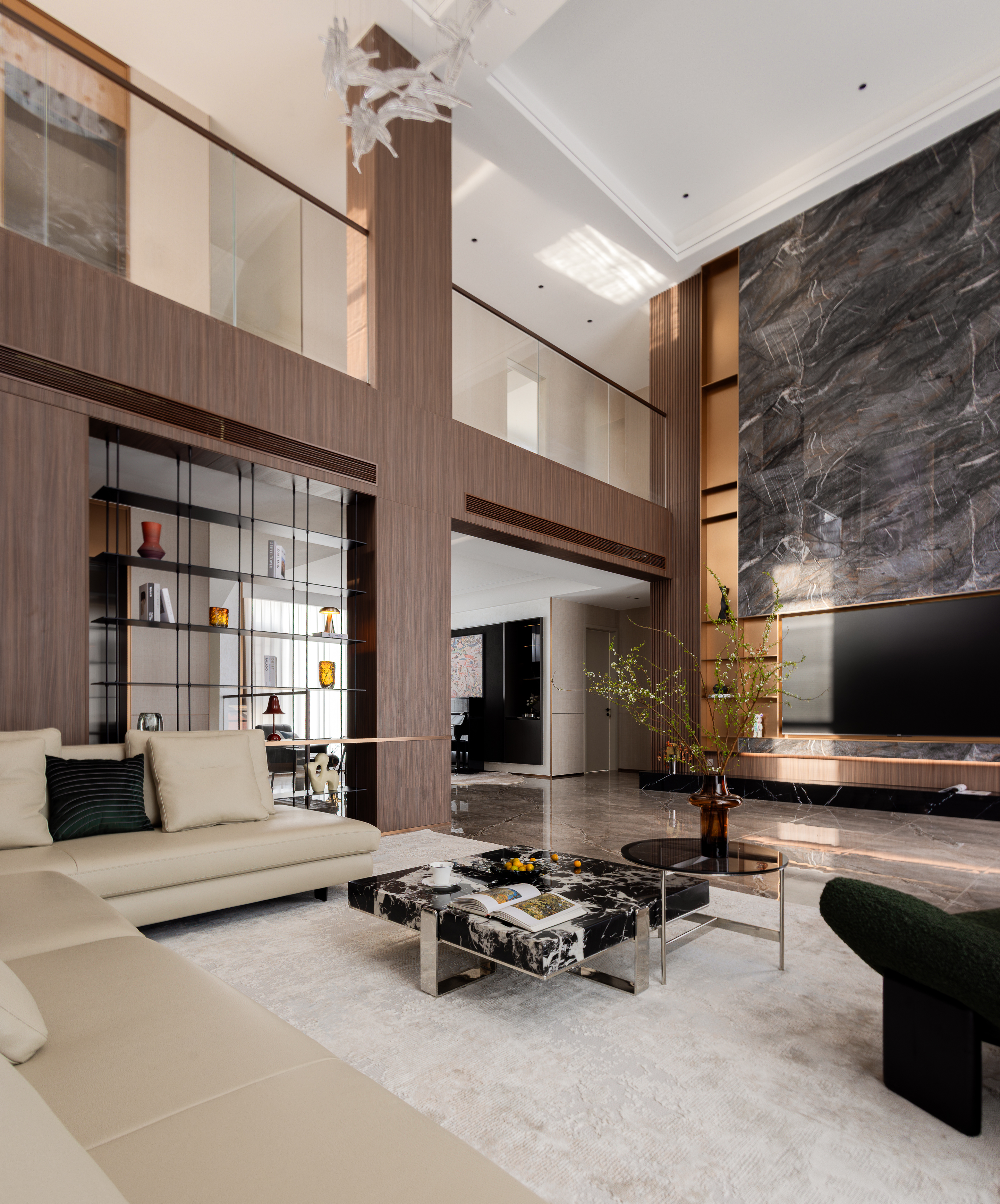 空间布局:空间功能的分层规划:整体空间以“社交+私享”为核心逻辑,将挑高客厅作为核心社交区,搭配休闲茶区、正式餐厅形成多元互动场景;利用挑高结构打造双层空间的视觉联动,同时通过木饰面柜体、大理石隔断等元素划分功能区,既保证空间的通透感,又实现功能的独立与私密。卧室又是独立的区域,实现动静分离。