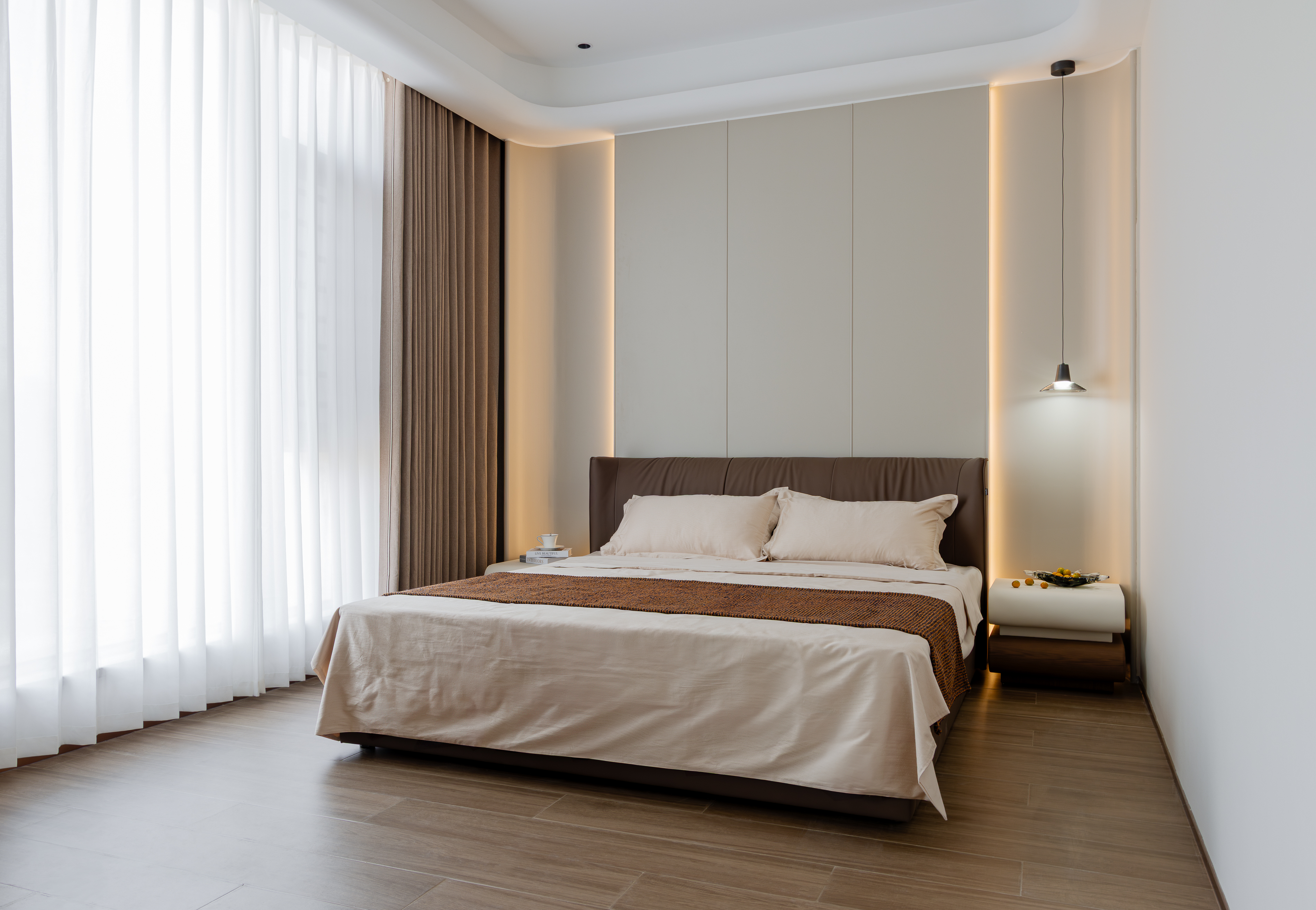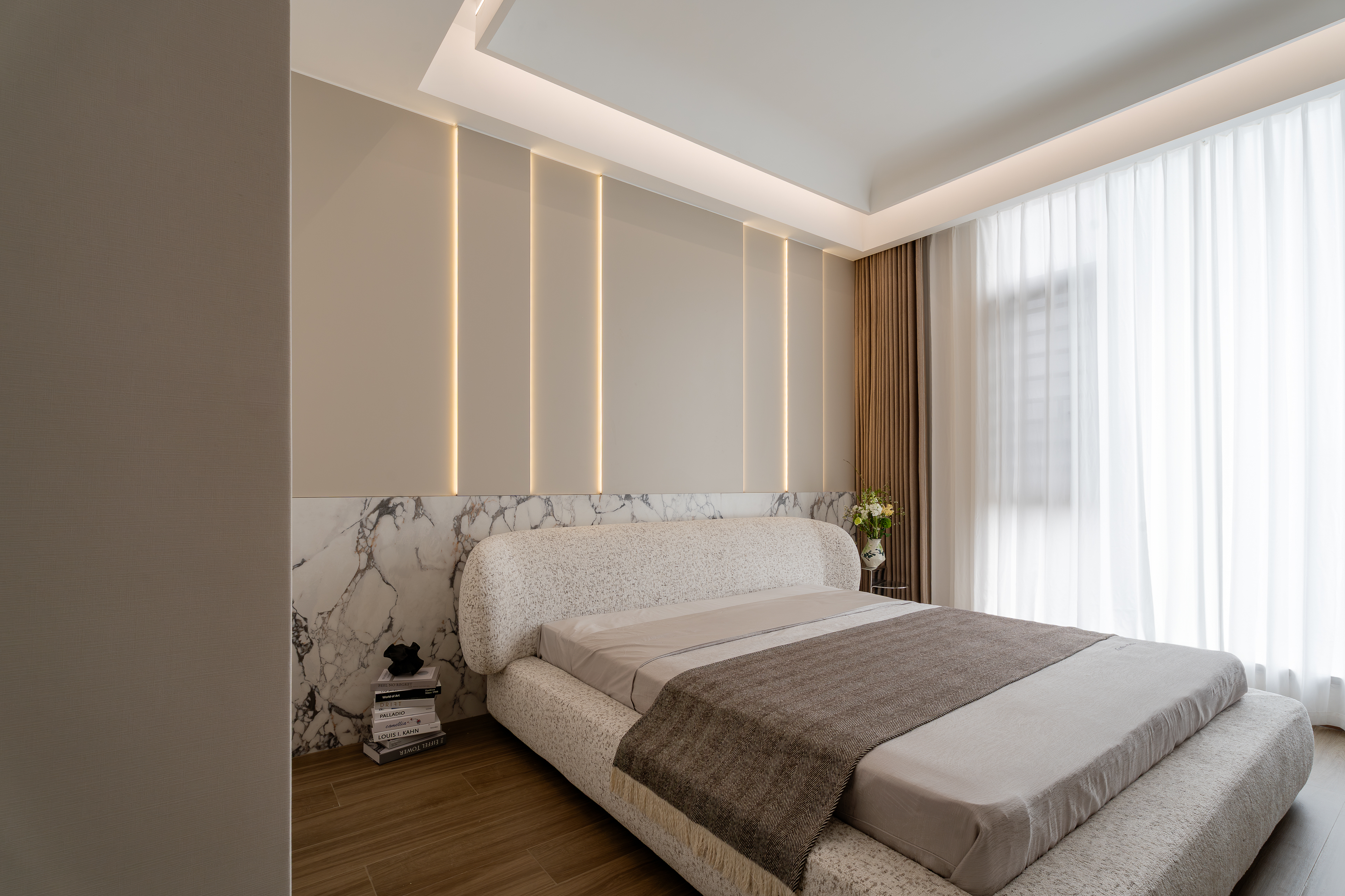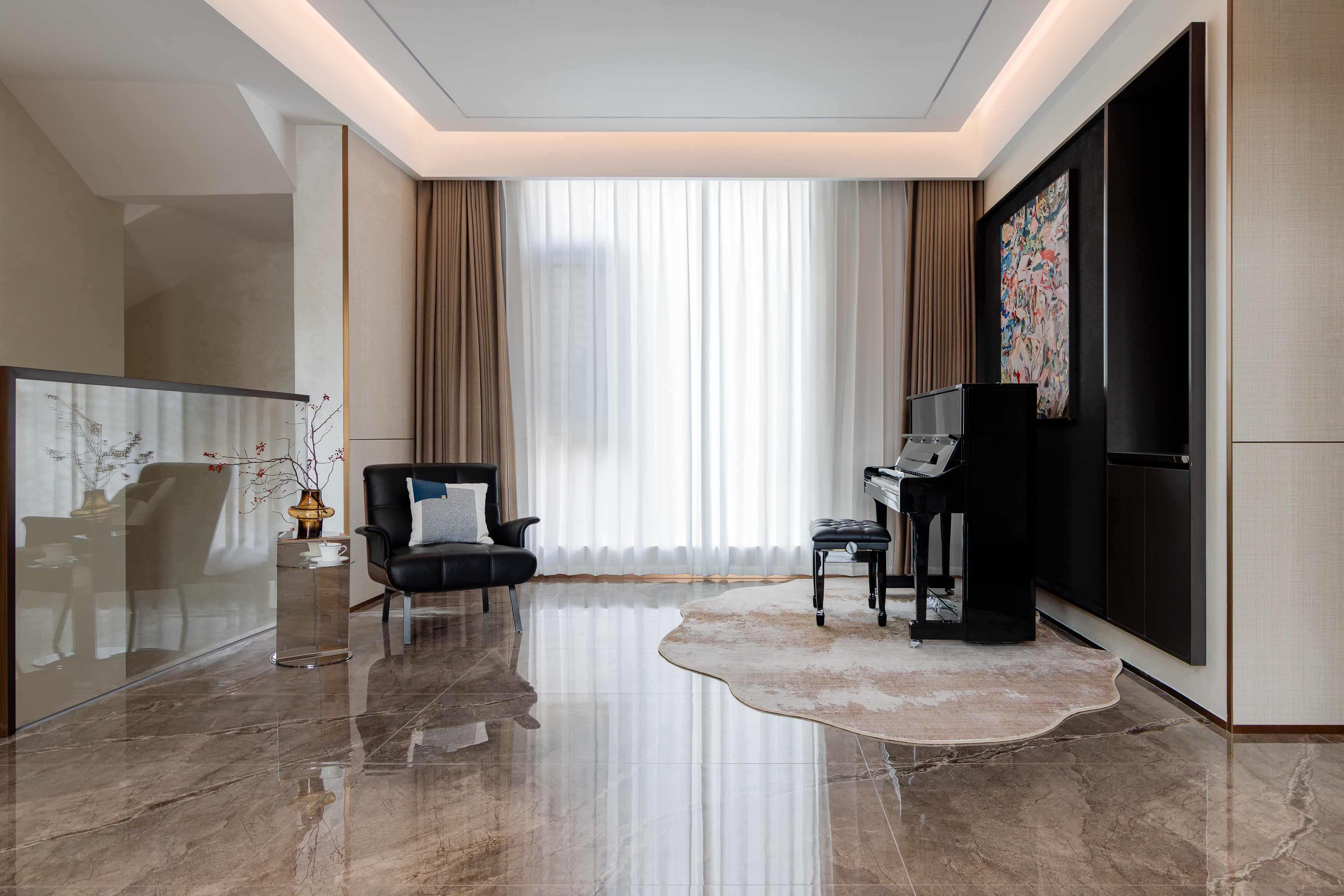 空间布局:空间功能的分层规划:整体空间以“社交+私享”为核心逻辑,将挑高客厅作为核心社交区,搭配休闲茶区、正式餐厅形成多元互动场景;利用挑高结构打造双层空间的视觉联动,同时通过木饰面柜体、大理石隔断等元素划分功能区,既保证空间的通透感,又实现功能的独立与私密。卧室又是独立的区域,实现动静分离。