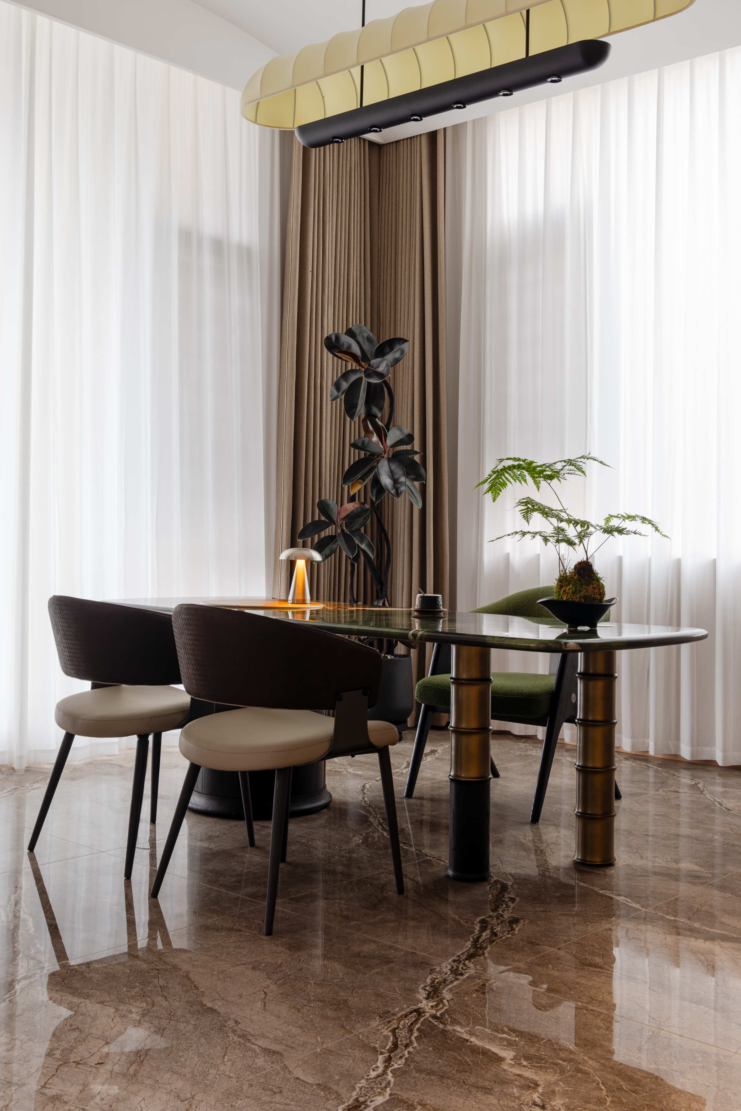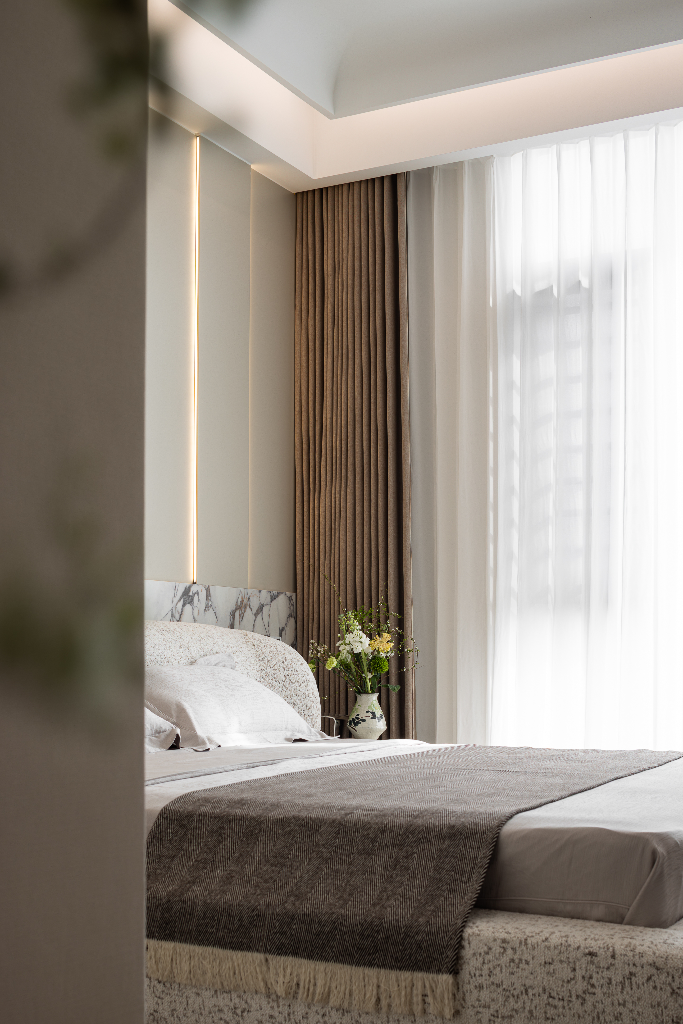 3. 传统轻奢的自然化融合:在轻奢风格中植入自然元素,通过大型造型绿植、花艺摆件软化硬质材质的冷硬感,同时以大理石的纹理、木饰面的自然肌理呼应自然主题,打破轻奢风格“过度装饰”的弊端,实现“轻奢华、新自然”的风格升级。 -