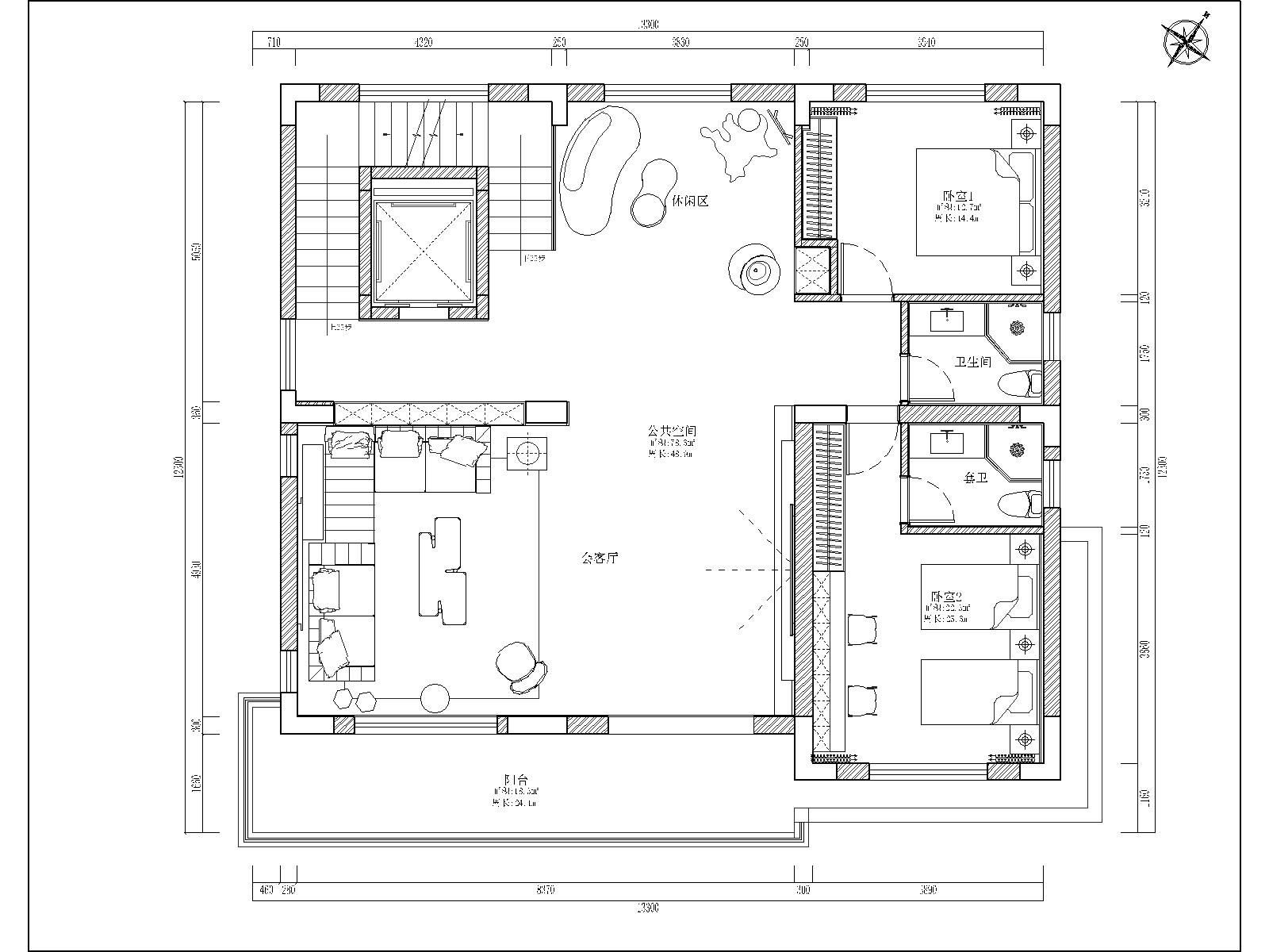 二层:家庭休闲互动层 1. 功能定位:聚焦家庭日常休闲与轻社交,是家人日常活动的核心区域。 2. 空间规划: ◦ 核心打造会客厅,搭配露台拓展户外休闲空间,形成室内外联动的休闲场景,满足家庭聚会、观影等多元需求; ◦ 休闲区,增设趣味软装与休闲设施,成为家人放松、亲子互动的灵活空间; ◦ 东侧规划两间卧室与双卫,临近公共区域且动线便捷,兼顾居住便利性与隐私性。 3. 设计巧思:通过动静结合的布局,将休闲娱乐区与居住区分隔,既保证家庭互动的开放性,又为居住空间保留安静的环境。