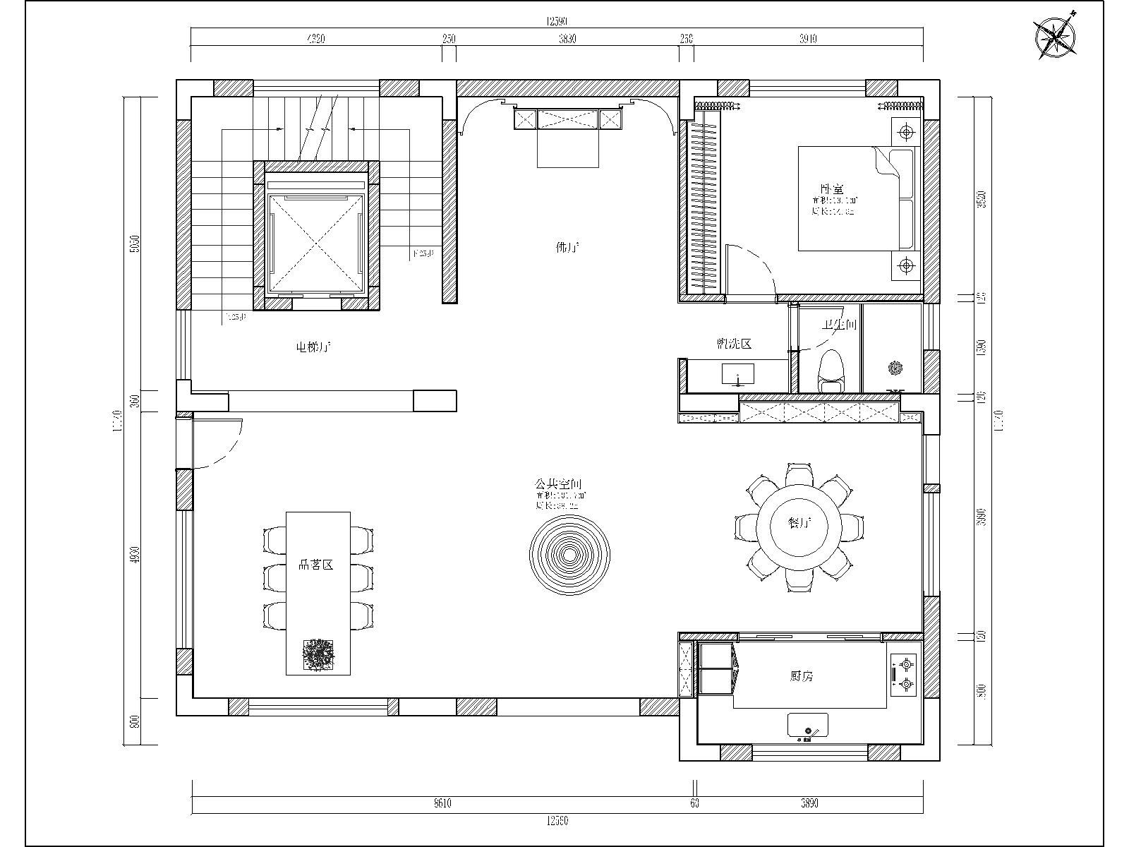 一层:社交迎宾核心层 1. 功能定位:作为入户与公共社交的首要层级,承担迎宾、宴请、品茗等核心社交功能。 2. 空间规划: ◦ 入户设电梯厅与玄关过渡,形成仪式感入户动线,同时保障动线的便捷性; ◦ 核心区域划分品茗区与餐厅,品茗区打造静谧的休闲交流空间,餐厅配置圆桌满足多人宴请需求,二者通过公共空间连缀,既独立又互通; ◦ 西侧规划佛厅,营造静谧的精神休憩区域,东侧设置厨房与备餐区,实现餐厨动线的高效衔接,兼顾实用性与礼仪性。