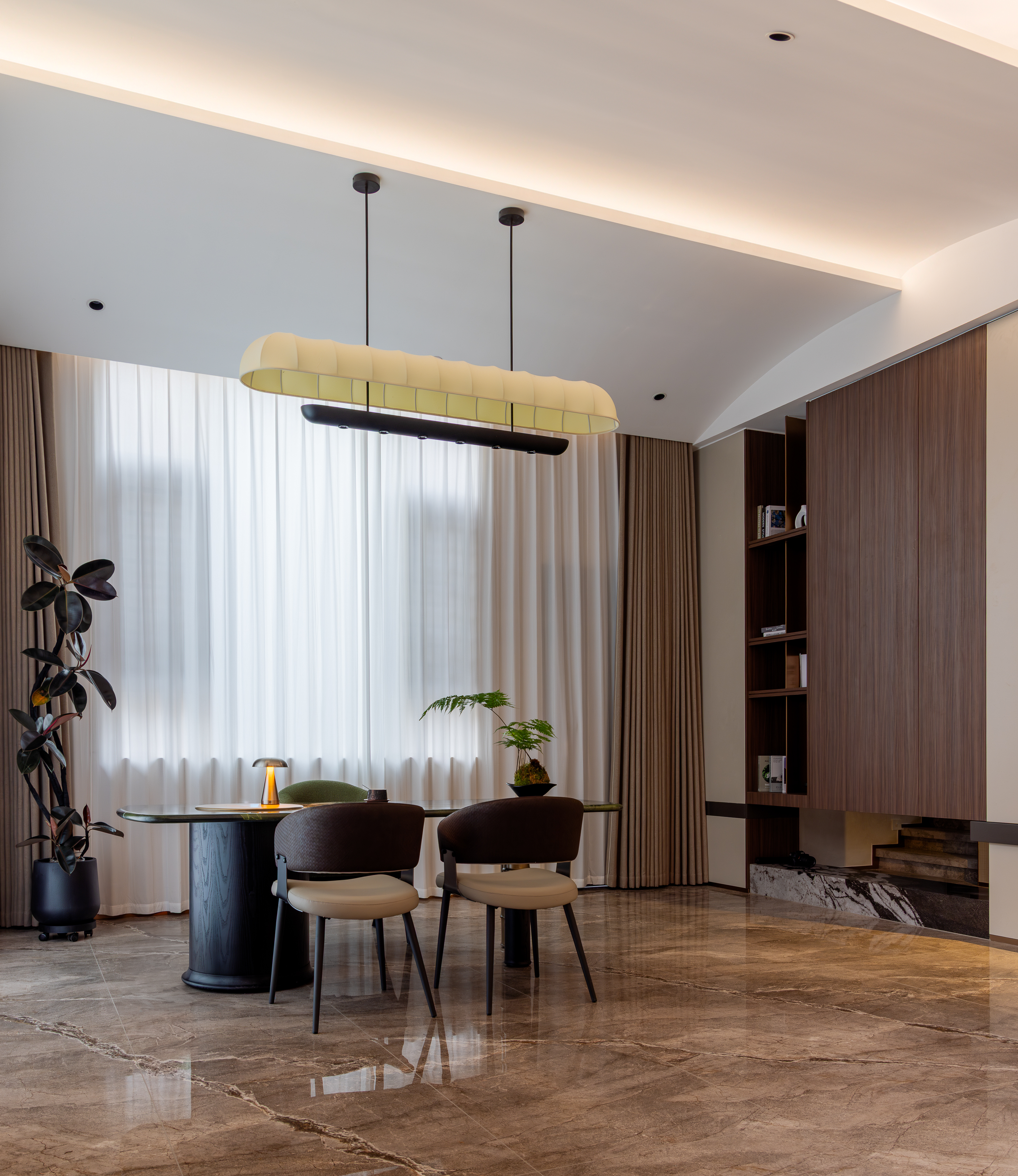 2. 光影设计的场景化营造:摒弃传统主灯的单一照明模式,采用“无主灯+艺术吊灯+氛围灯带”的复合光影系统。挑高客厅的水晶艺术吊灯成为视觉焦点,茶区的长条造型吊灯适配空间尺度,墙面暗藏的线性灯带则勾勒出空间轮廓,不同区域的光影设计与场景功能结合,让光影成为塑造空间情绪的核心元素。