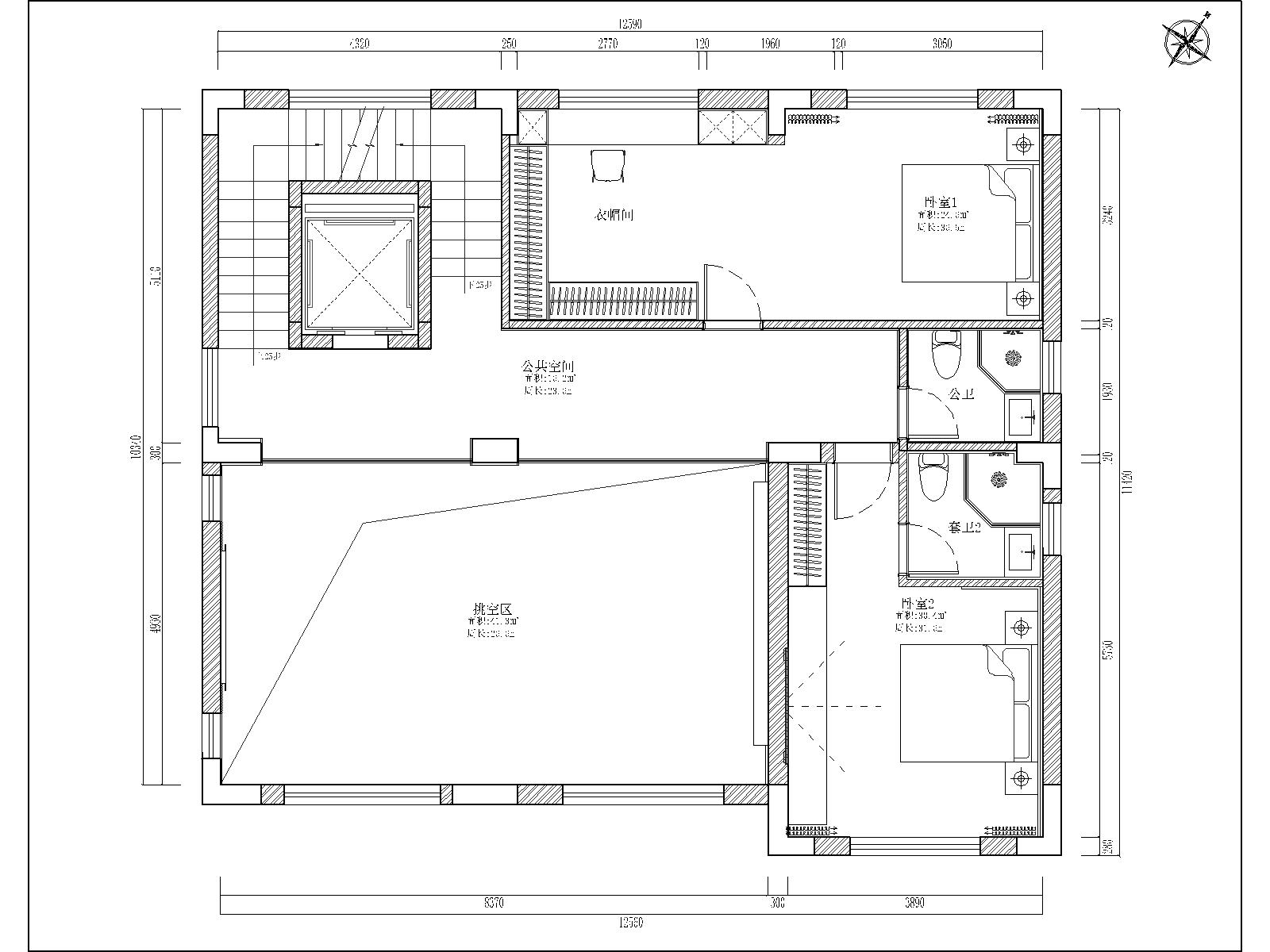 三层:私密居住与挑空美学层 1. 功能定位:以主卧套间为核心的私密居住层,同时通过挑空设计强化空间的视觉纵深感。 2. 空间规划: ◦ 核心打造挑空区,与下层空间形成视觉联动,成为别墅空间的美学亮点,提升整体空间的通透感与艺术感; ◦ 东侧规划双卧室套间,均配备独立卫浴,其中一间卧室旁增设衣帽间,满足主人的收纳与居住私密需求; ◦ 入户区域设置衣帽间,优化三层的收纳功能,电梯厅与过道形成流畅的居住动线,保障空间的私密性。