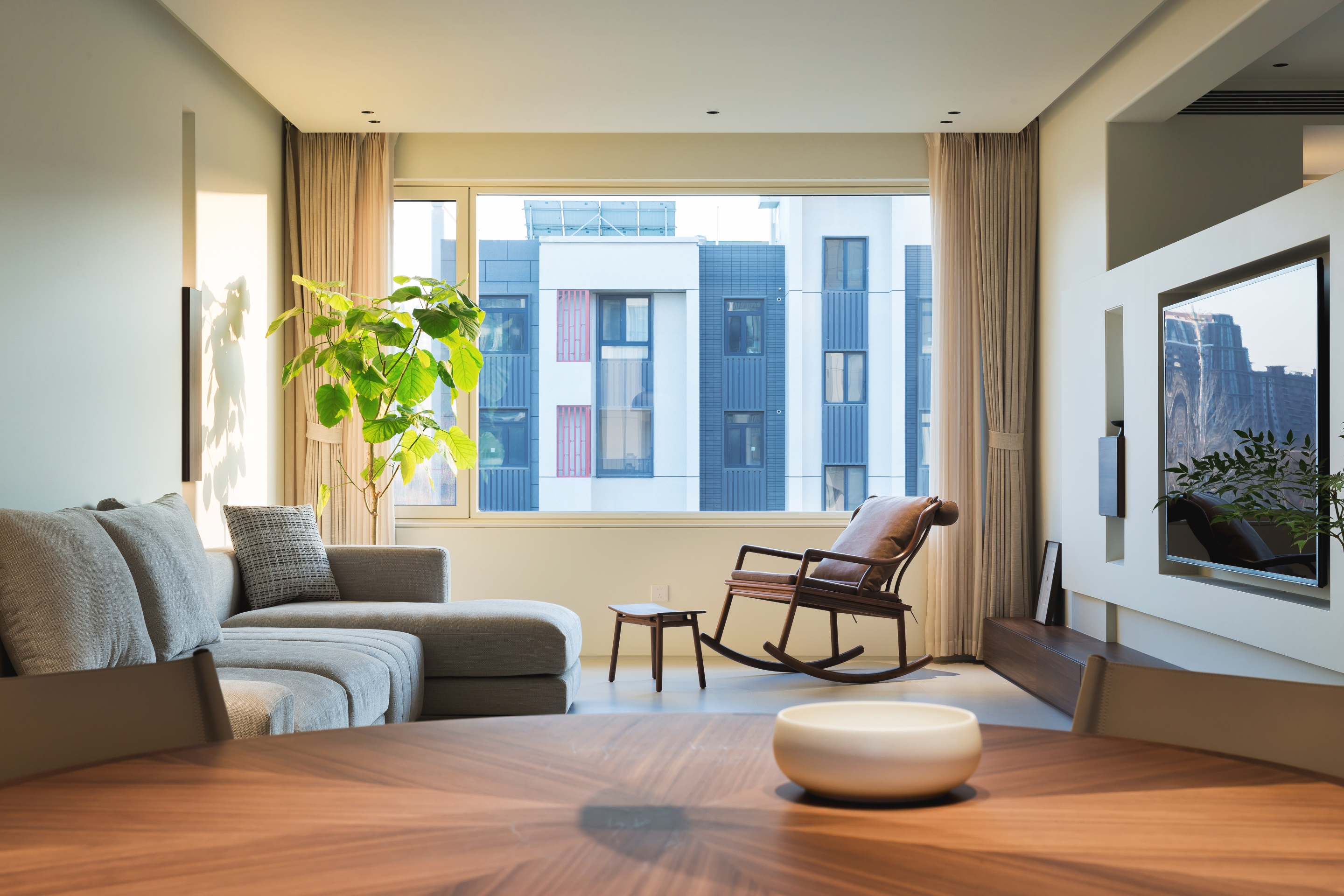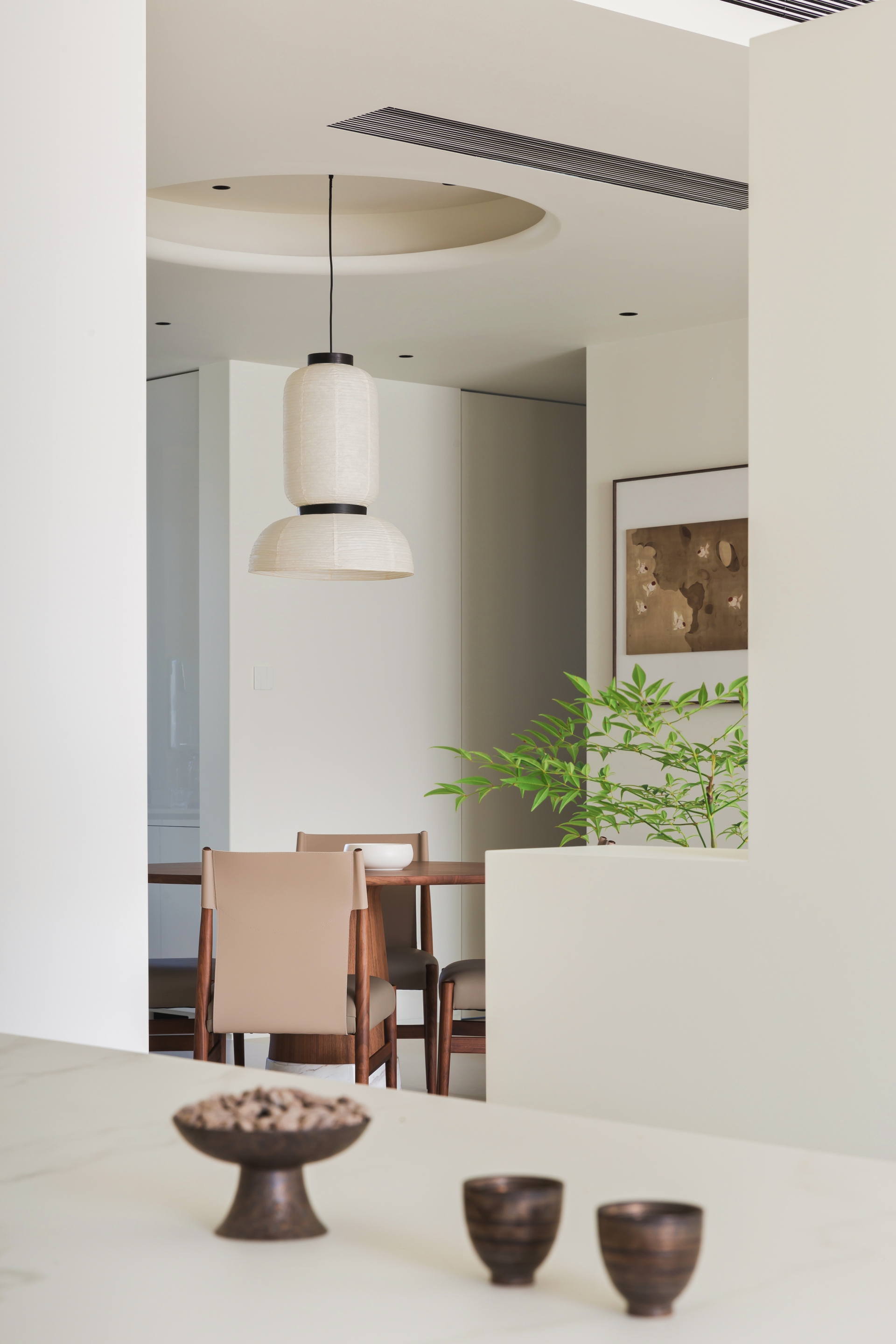 空间布局:遵循“隔而不断,引景入室”的东方布局哲学。运用移门、窗洞、月洞门等元素,形成框景,让空间既有序列感,又保持呼吸感和探索的趣味。