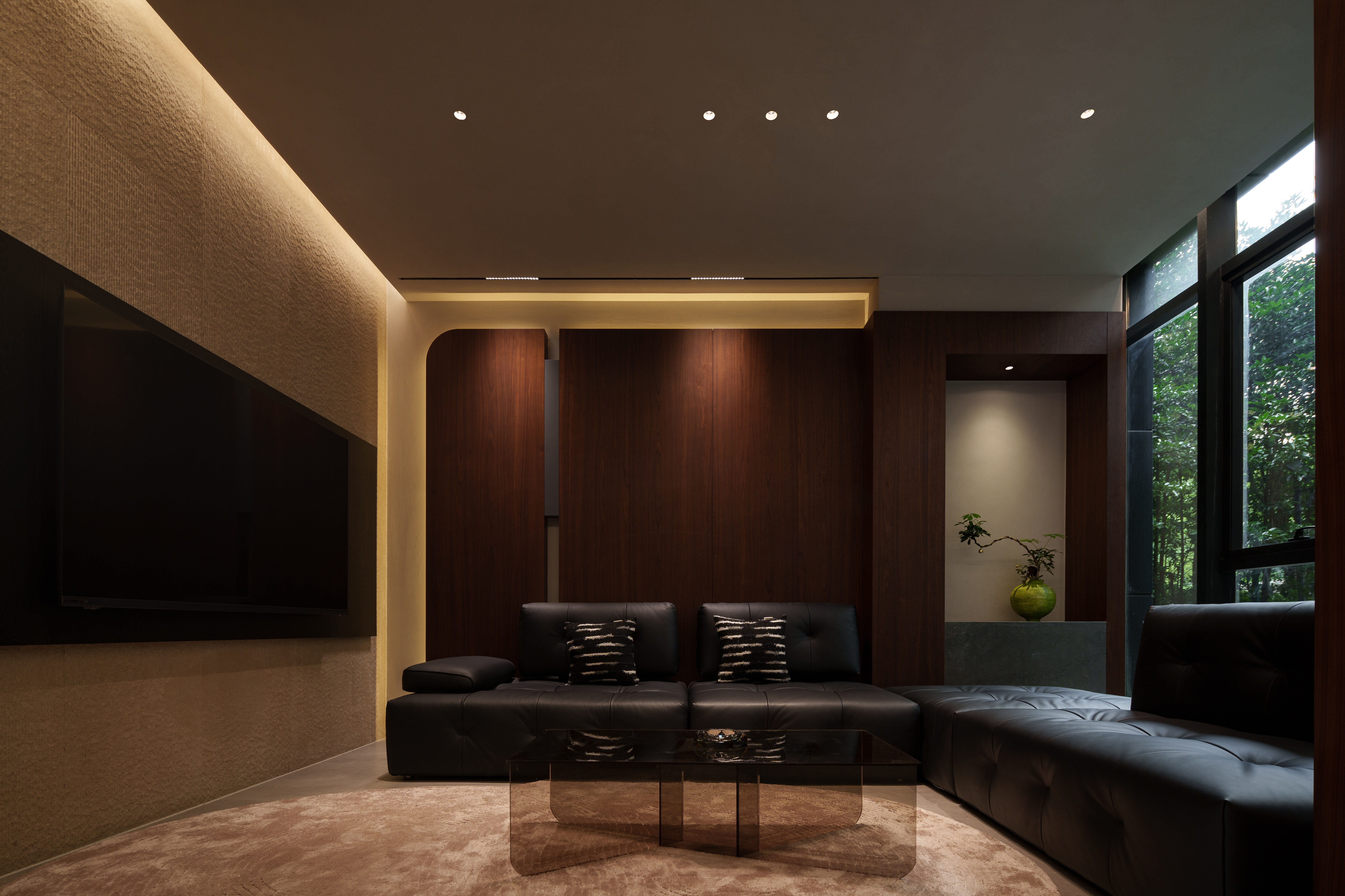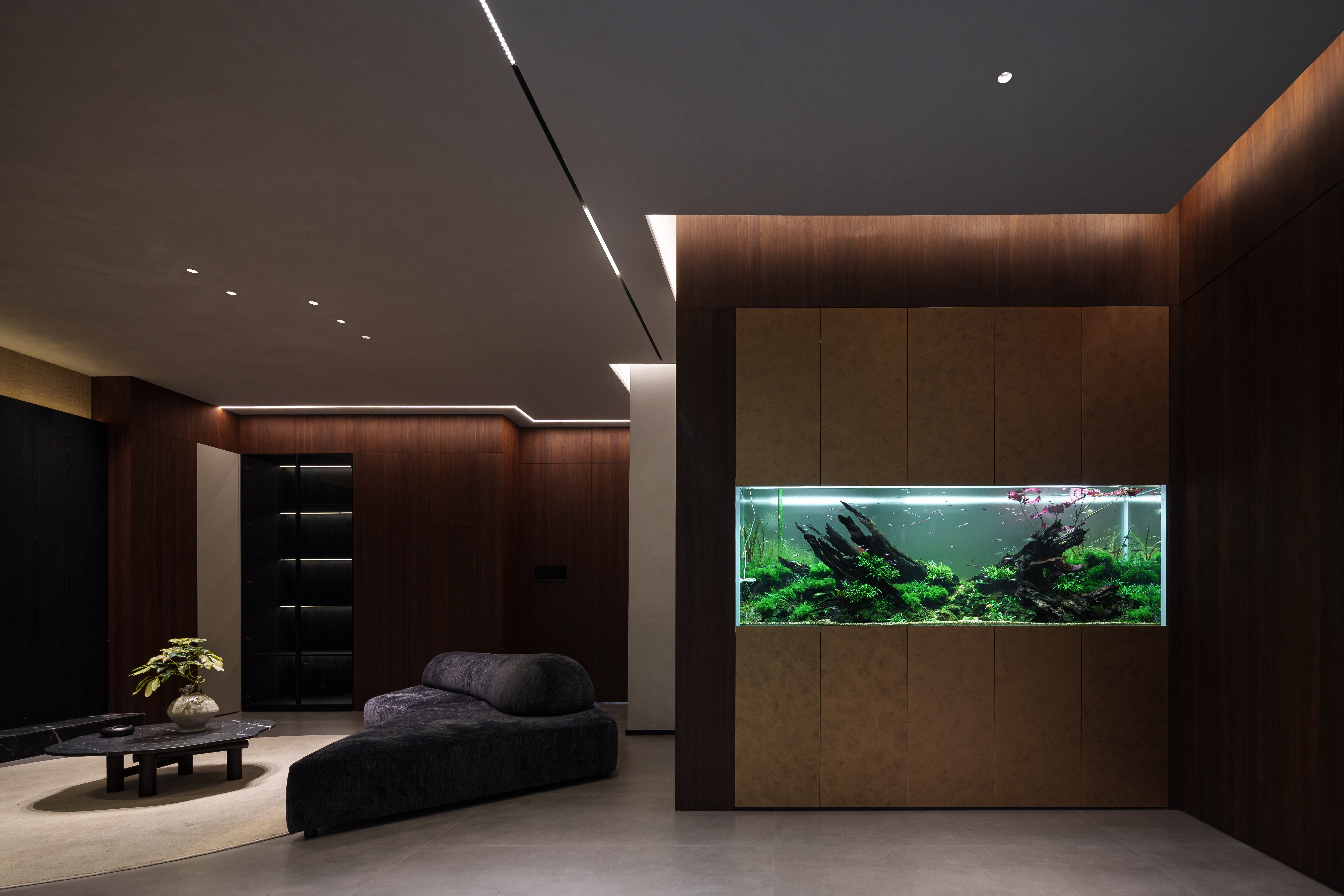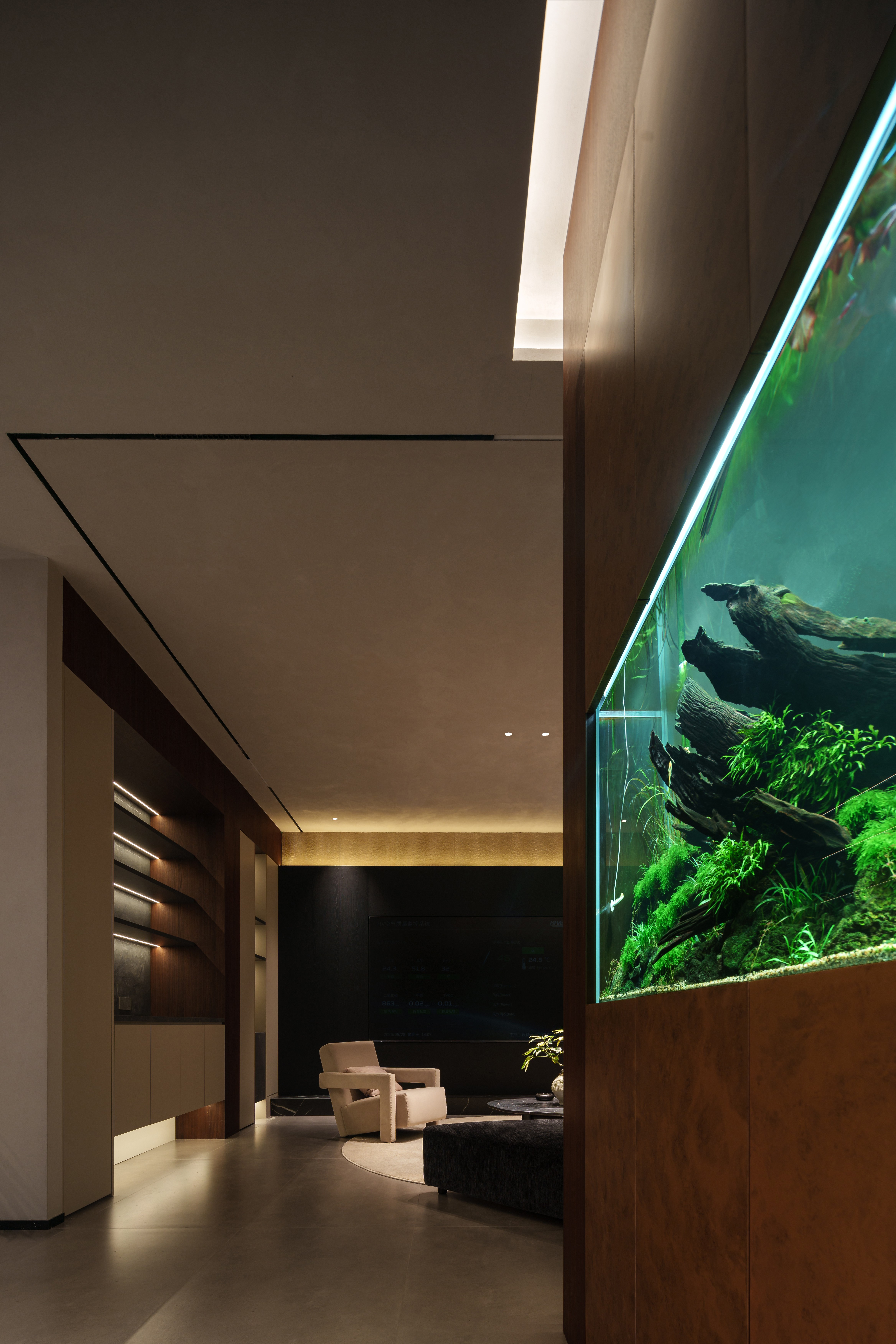 - 光之潮汐 :定制照明系统模拟深海光鲷群动态,可调节光点“咬碎”冰冷感,在素净墙面投射含氧的律动。