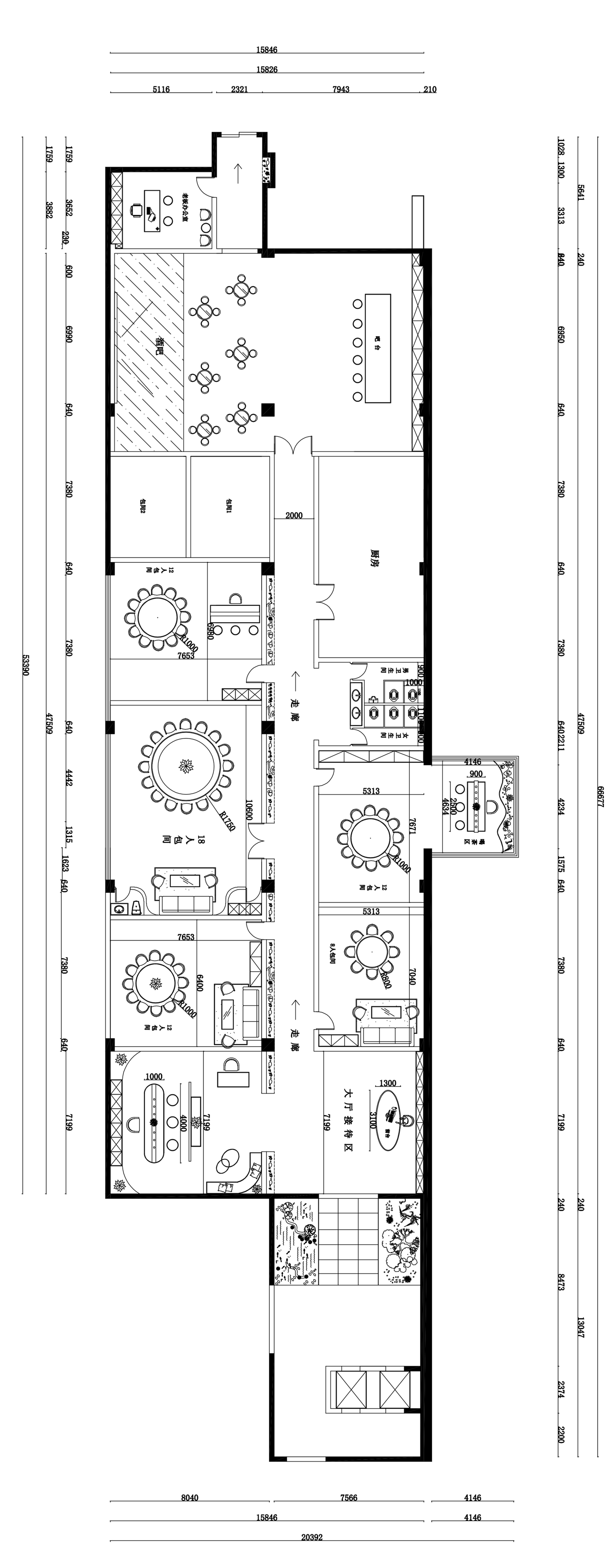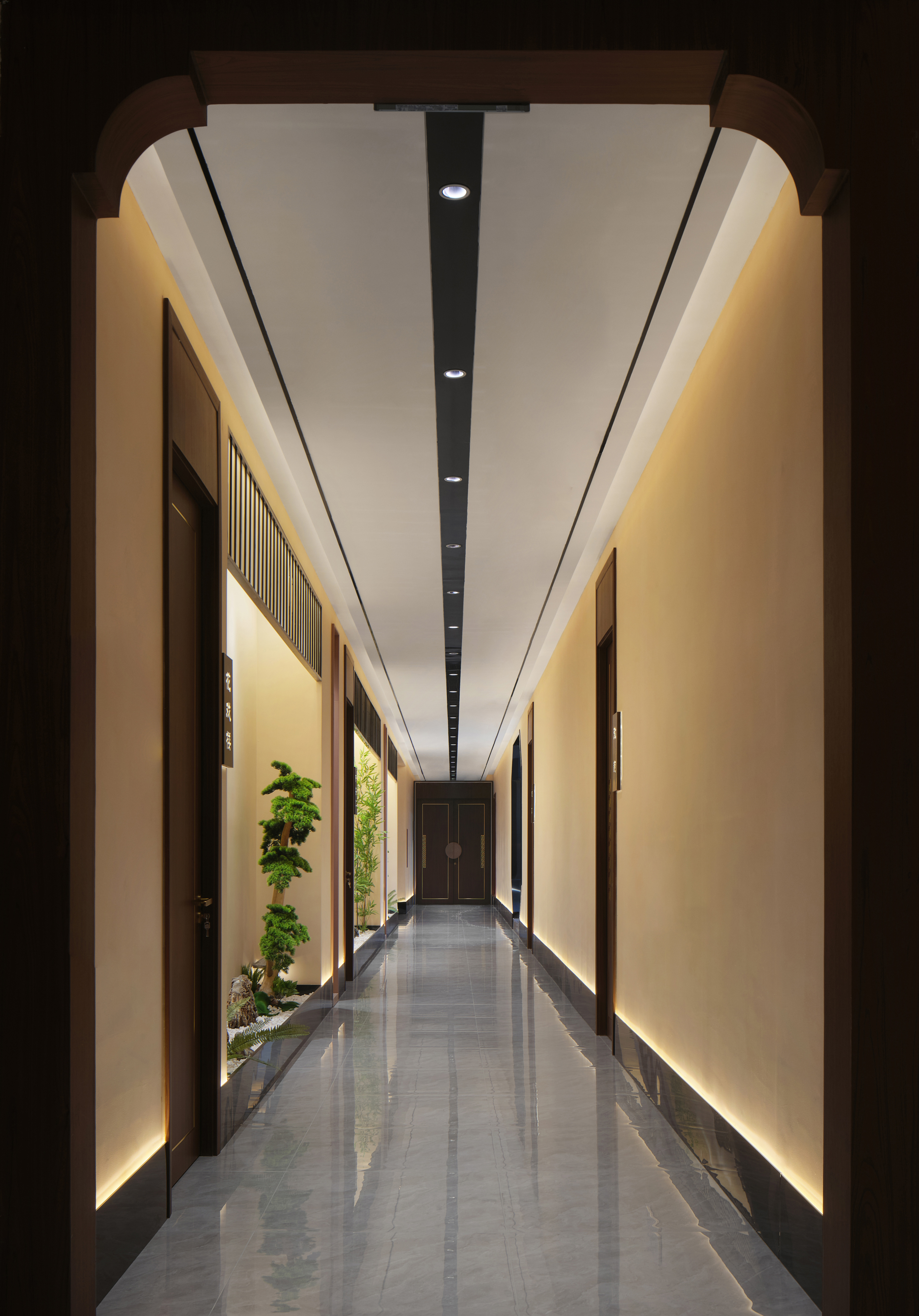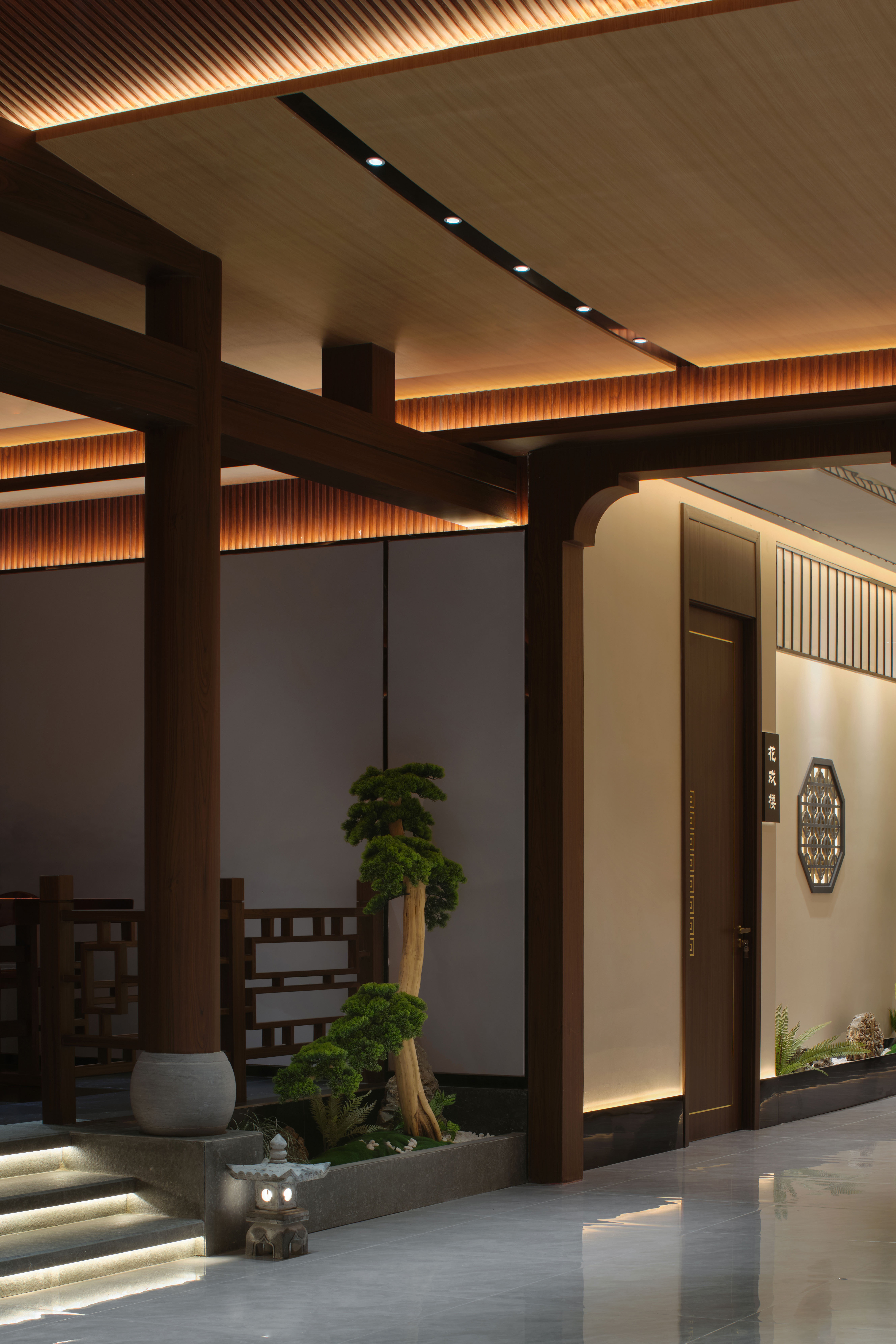 中心走廊纵向延展,两侧对称分布餐饮包间,秩序中透出东方礼序之美。