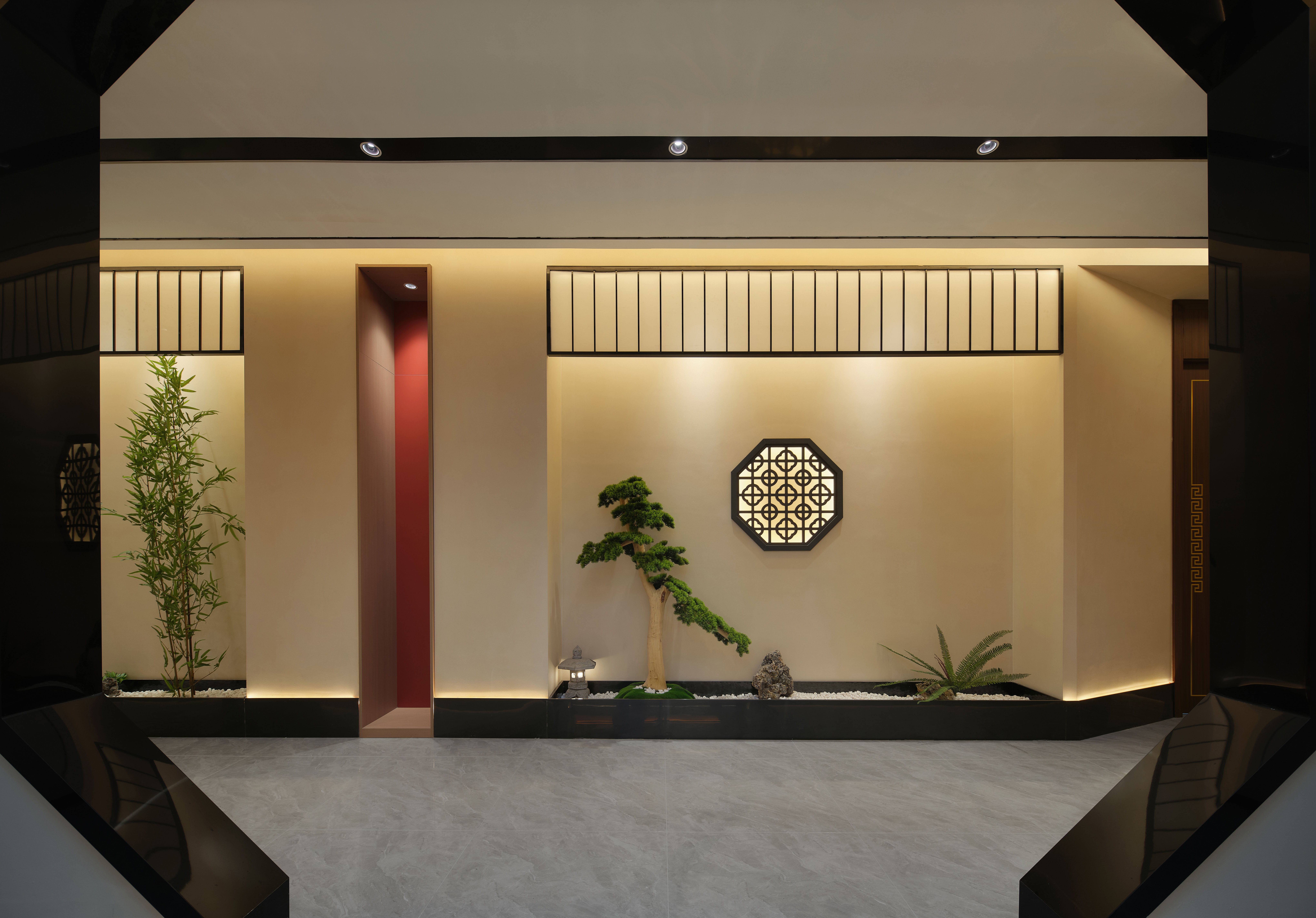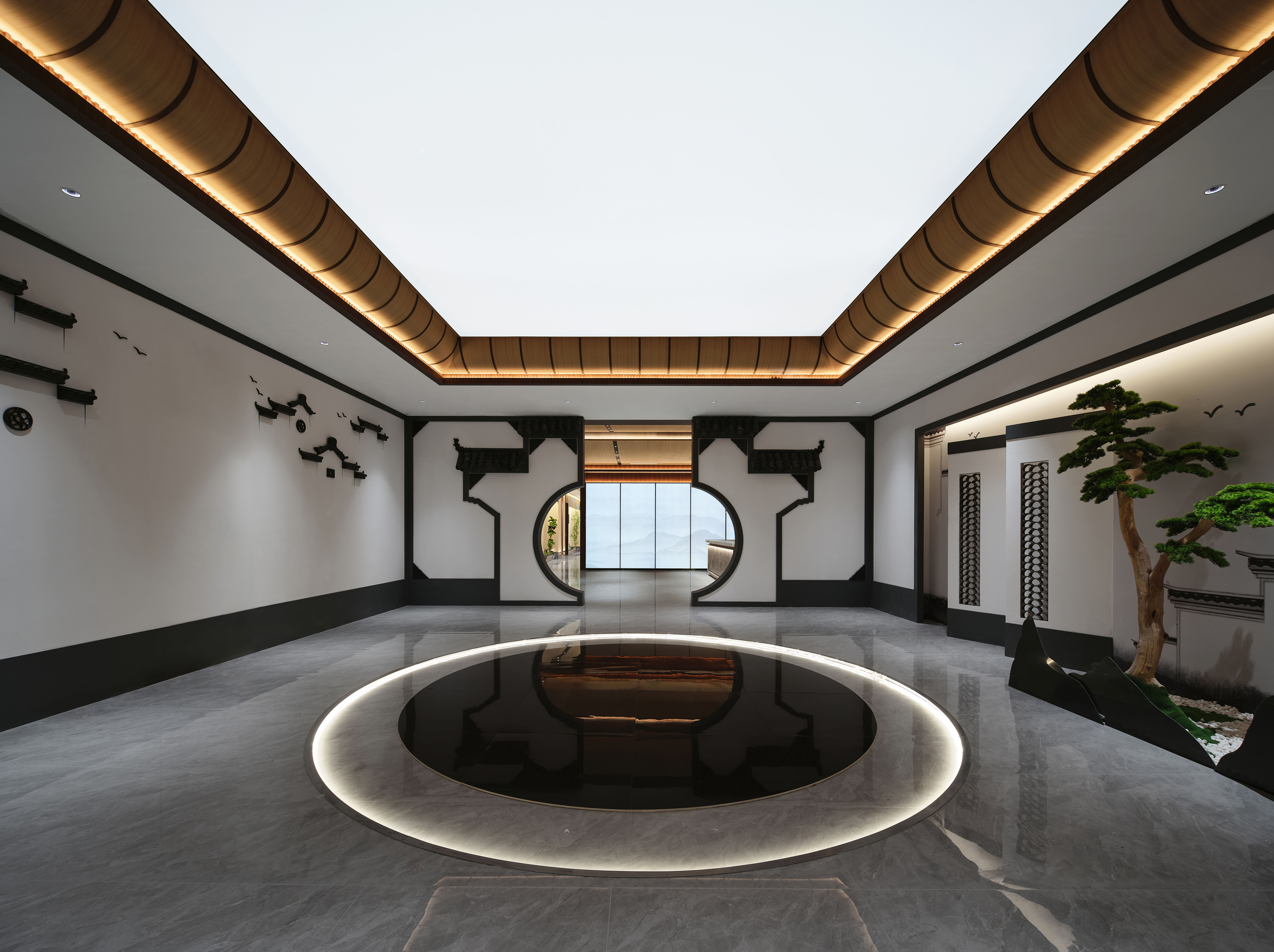 空间布局:入口大厅,以徽派设计手法重构开阔格局。地面静水池映照上方顶面,软膜天花模拟自然天光,水影天光交融,形成第一重视觉震撼。