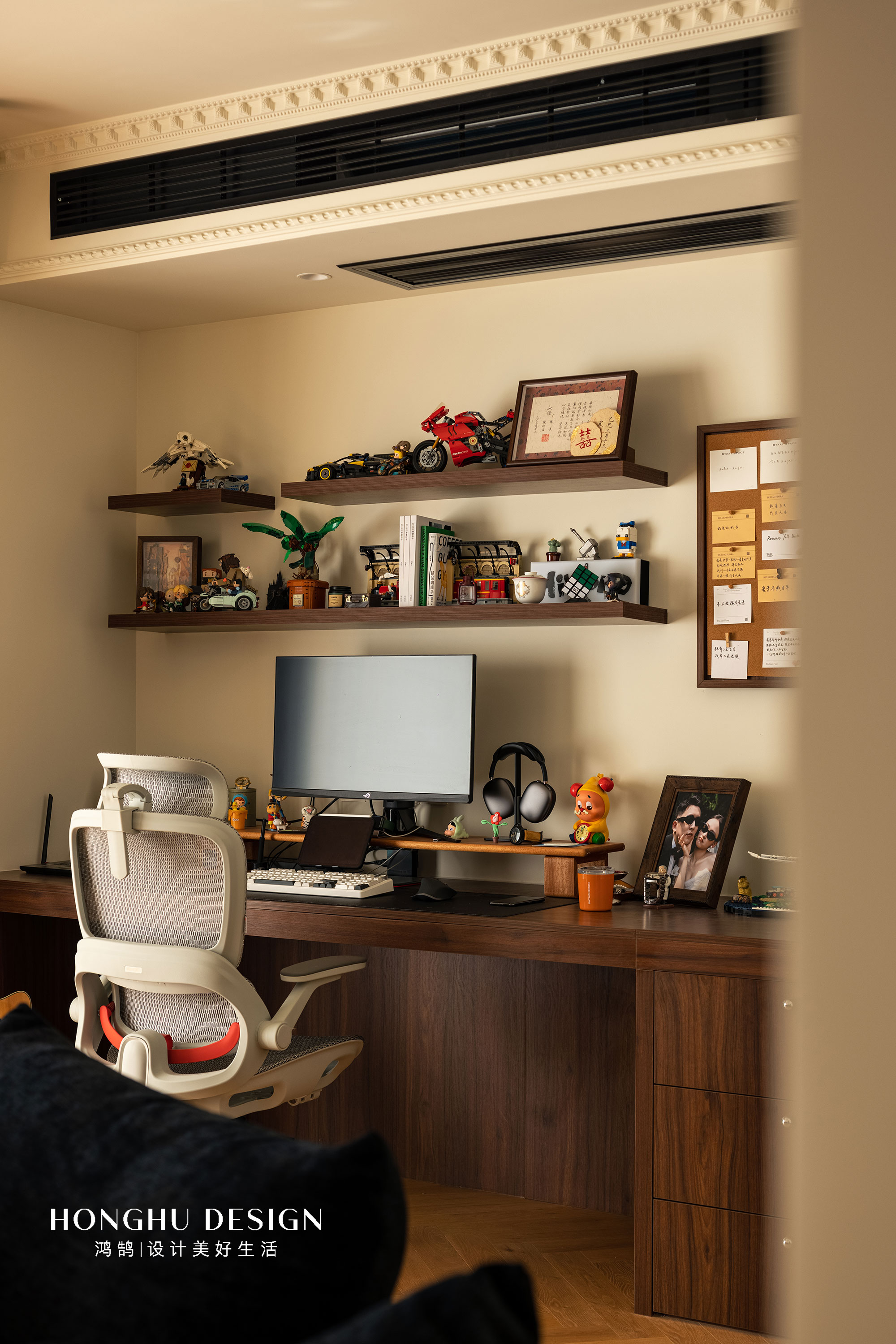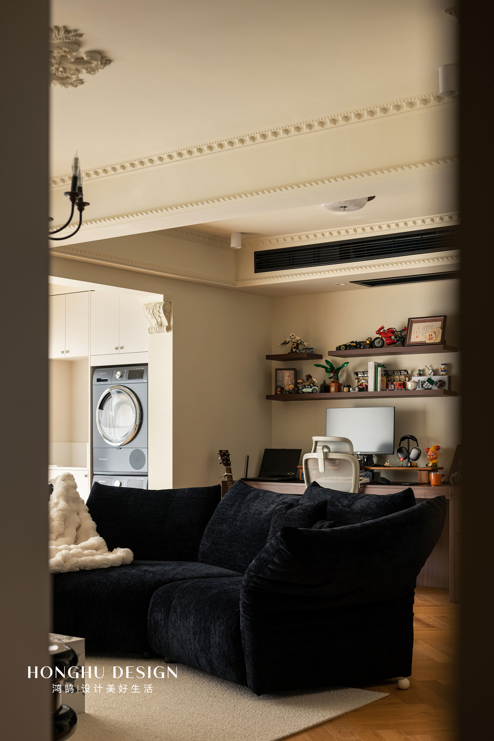开放格的设计与盲盒置物架尺寸吻合,这也是设计师在设计之前已经规划好,使得它更能与空间匹配。 黑色出风口与整体空间形成了呼应,保持了书房的理性感,且与空间的色彩有了一个层次。