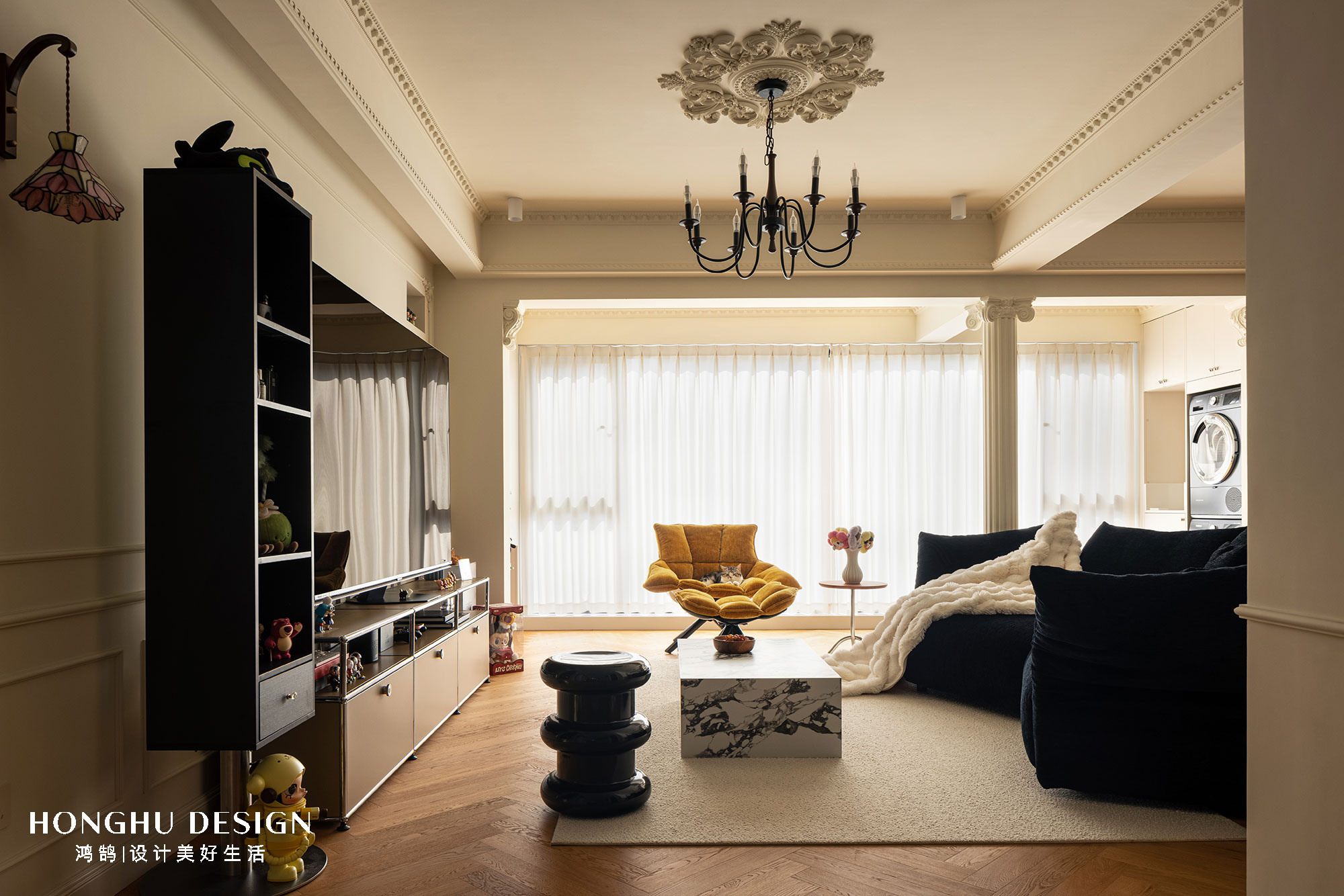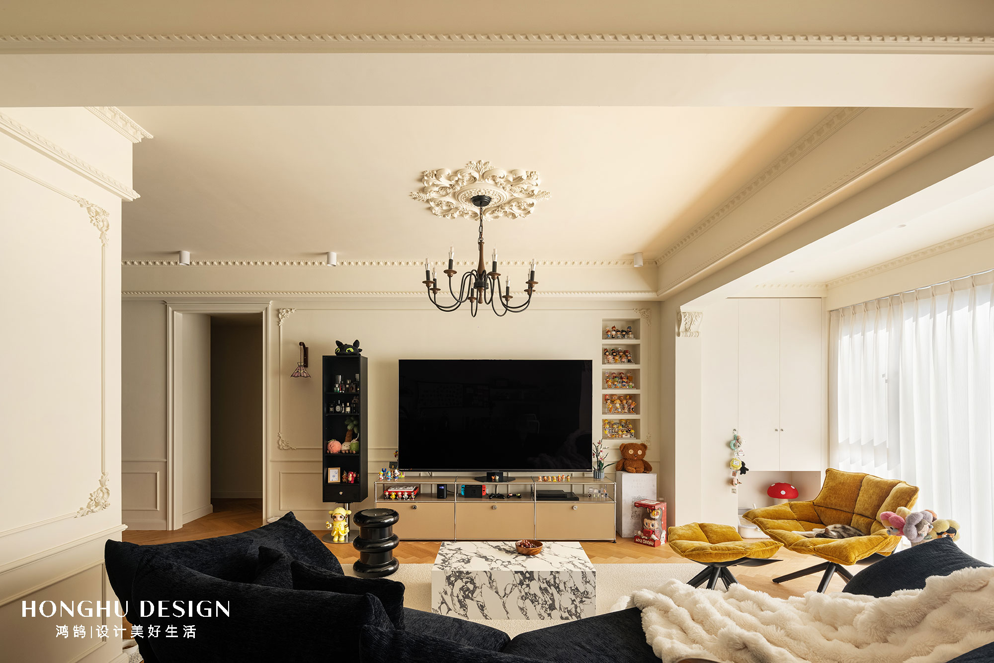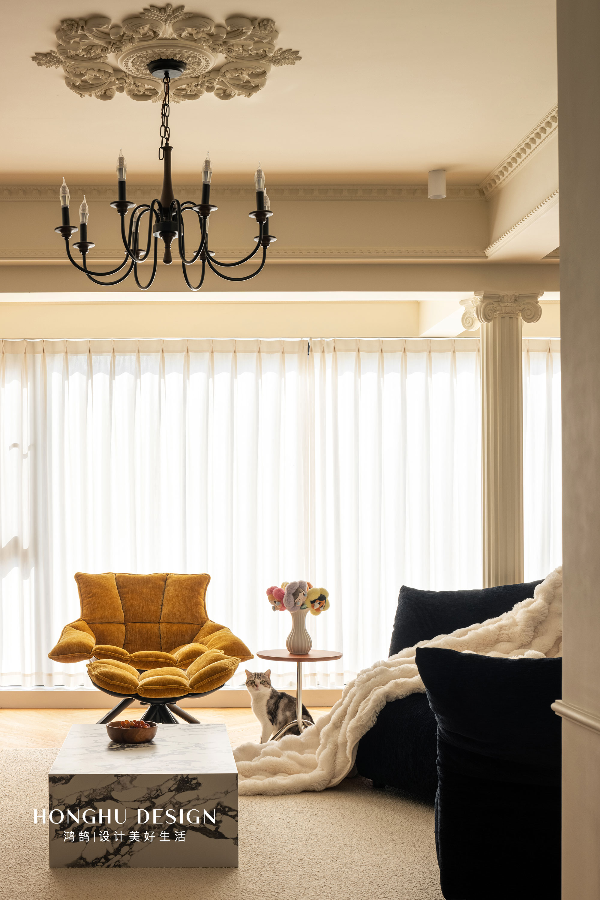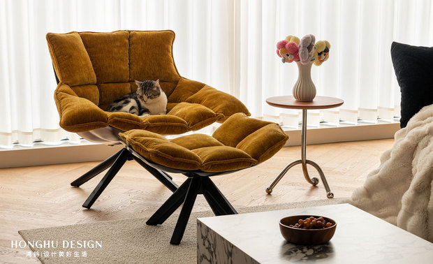 深蓝花瓣沙发+奶白毛绒毯,以材质对比平衡厚重感;明黄色稻壳椅跳出高饱和亮色,消解法式的“距离感”;宝格丽大理石茶几、金属支架小边几,用现代材质提升精致度;墙面壁龛+盲盒手办,让收藏成为空间的“个性注脚”;慵懒卧在椅上的小猫,更让优雅空间晕染出生活烟火气。