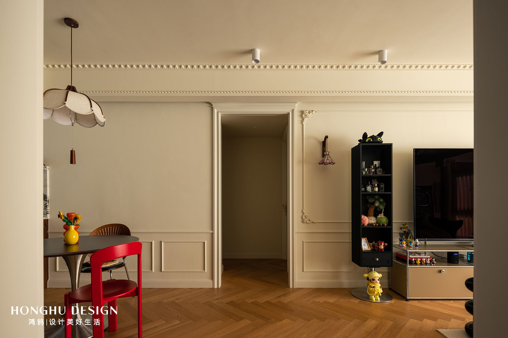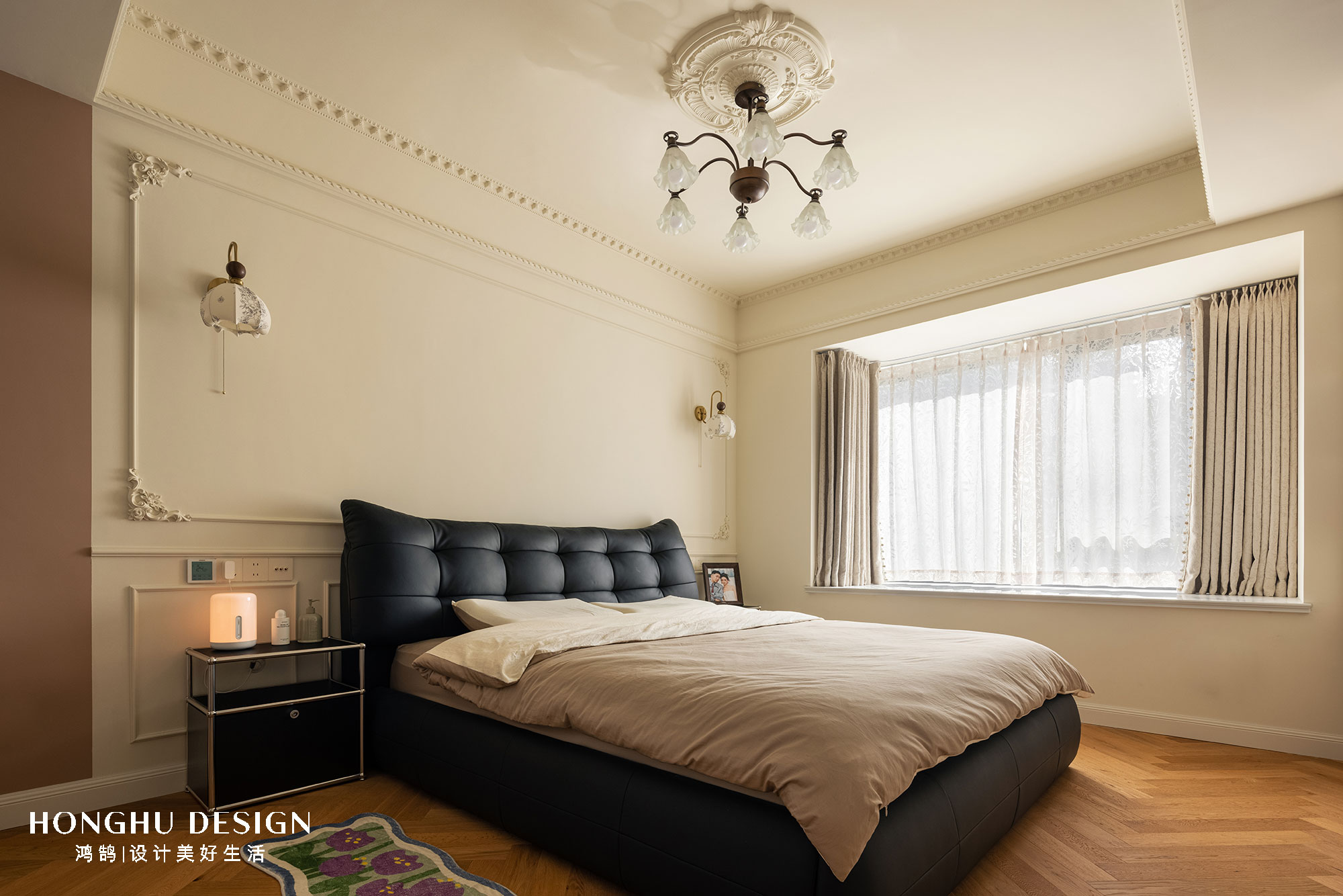 项目定位:奶油色墙面,墙面线条,石膏角花,搭配雕花灯盘与复古吊灯,延续法式优雅;人字拼木地板铺陈温暖底色。