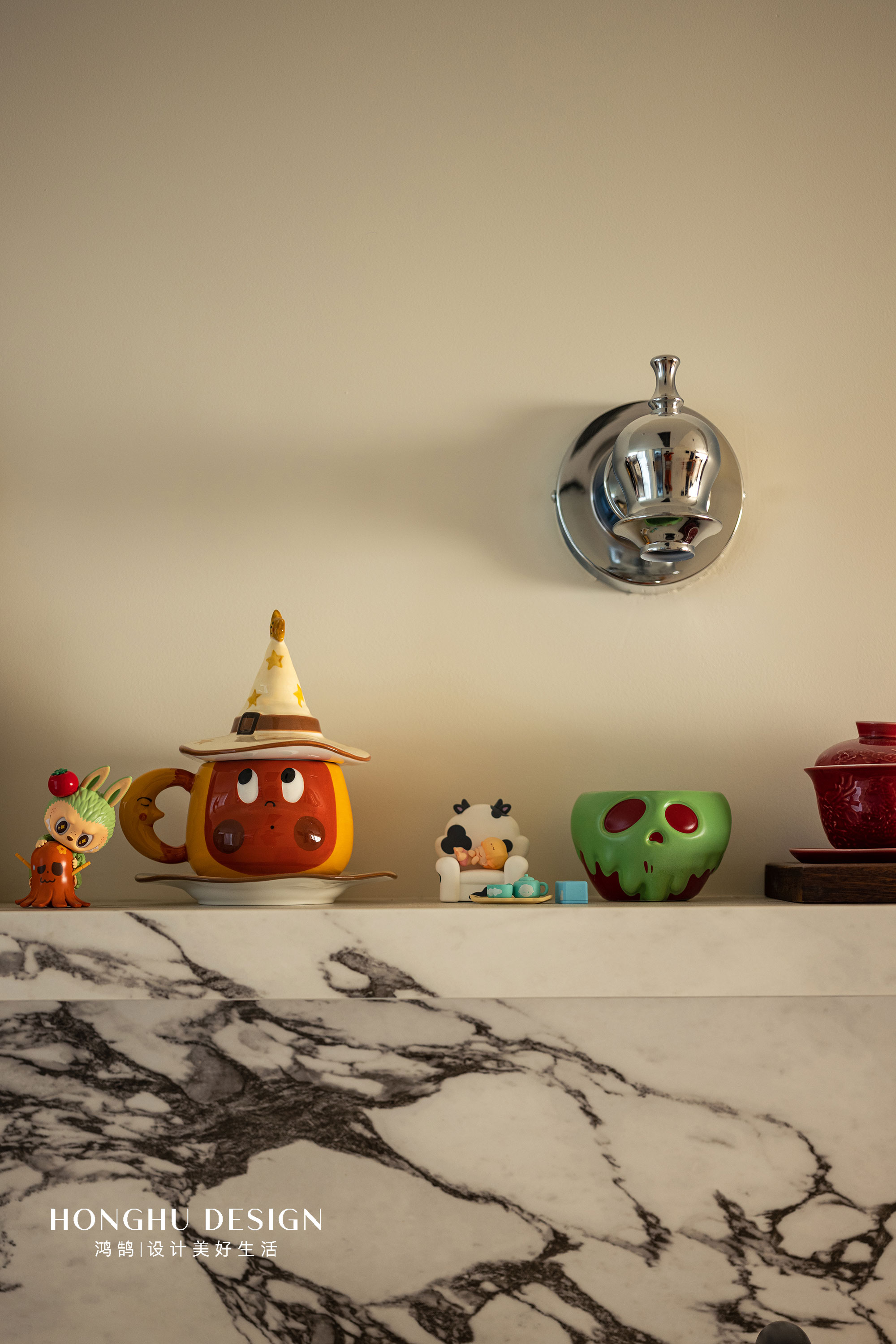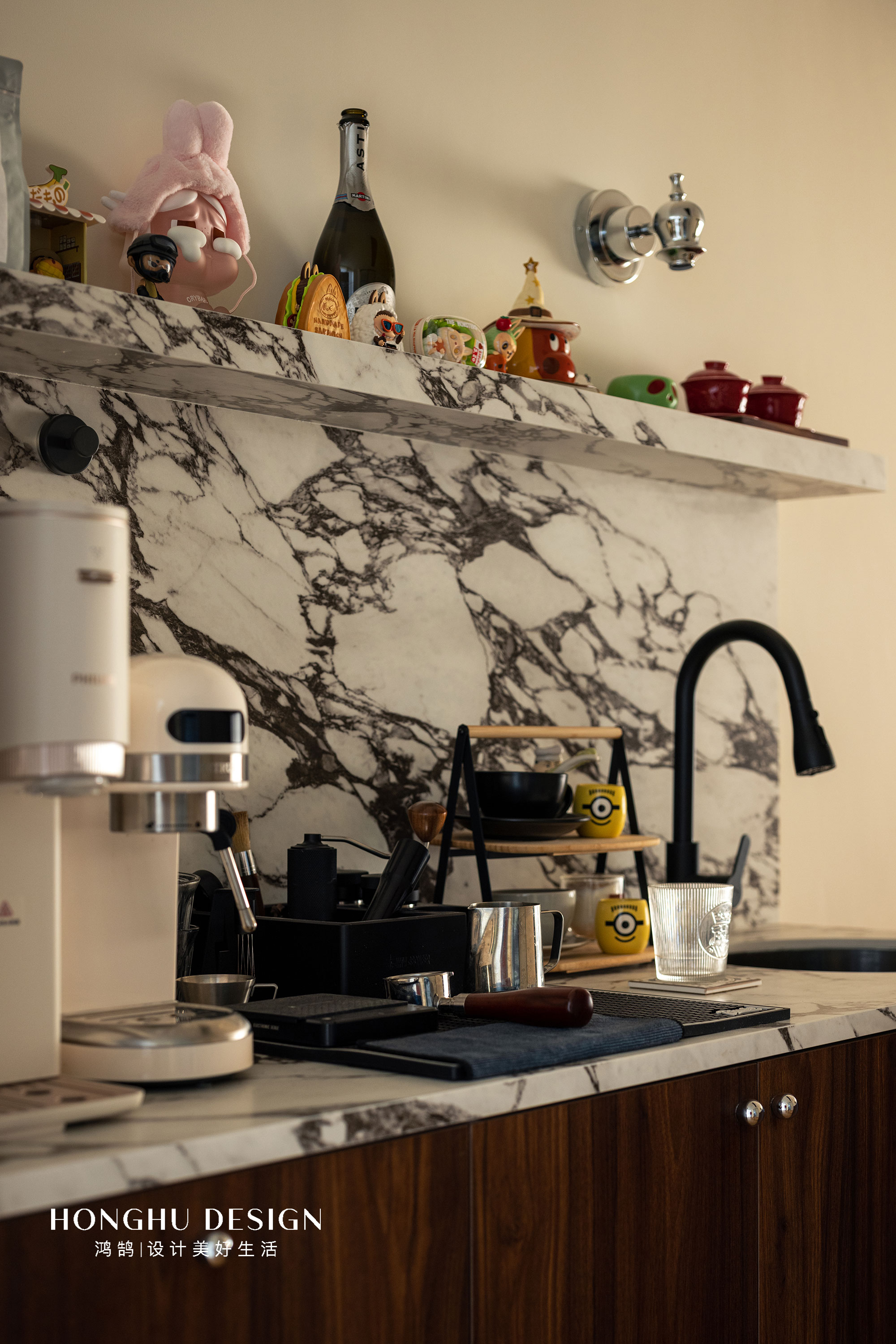 设计师本身喜欢调酒,咖啡,于是在餐厅空间,选择了一个水吧台+餐桌的结合。照顾到兴趣和日常使用两种需求。 宝格丽大理石台面以及层板,用石材肌理提升质感。咖啡机,主题杯具、摆件,让实用的水吧区带着可爱的生活气息;水龙头、木质柜体,以材质对比丰富层次。