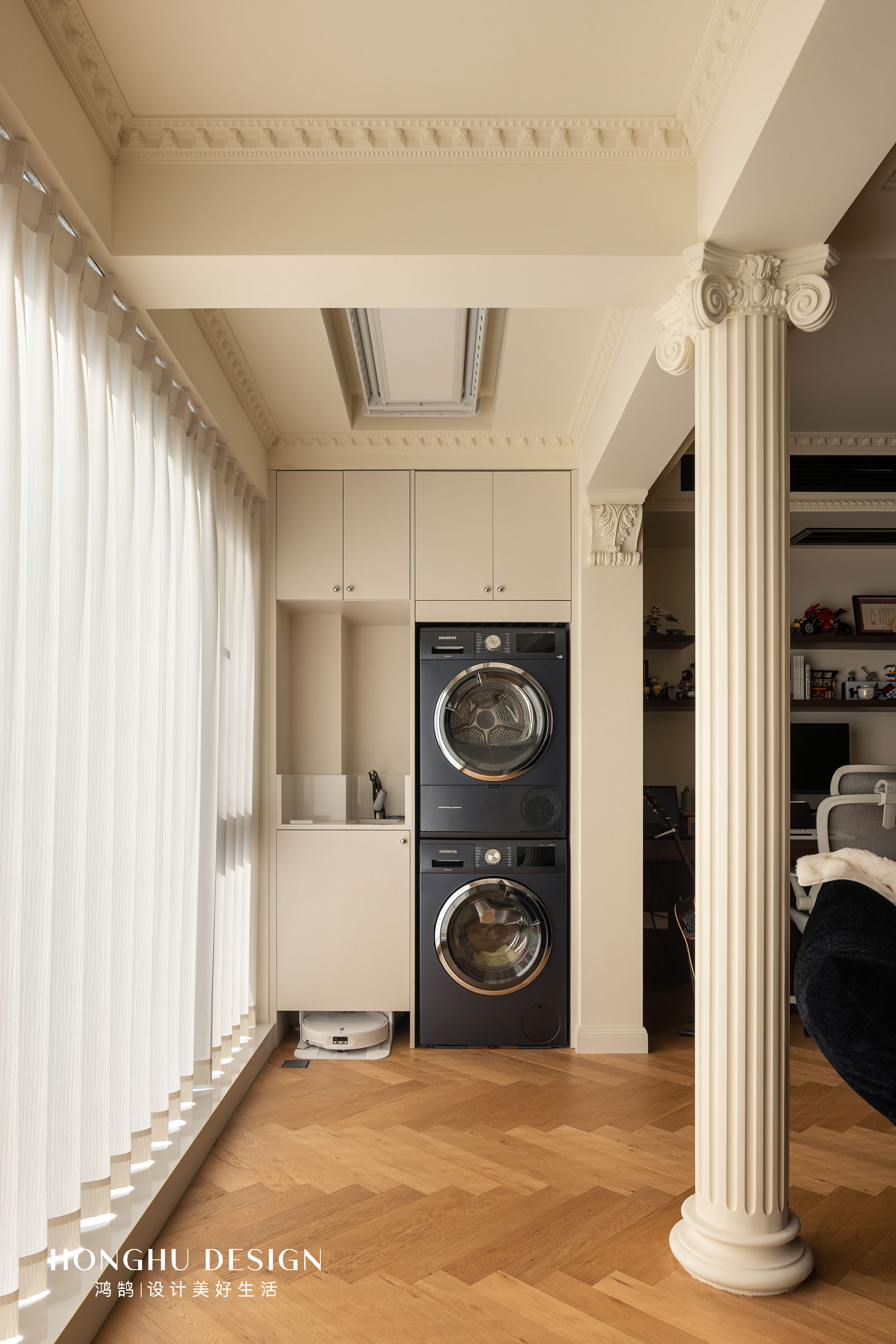 阳台的立柱不仅仅在造型上面给家里增加了层次,同时弱化了柱子的存在,并且做了空间的区分。即使在顶面的功能上,设计师也做了一定的考量,将晾晒衣架隐藏在靠近洗衣机的一边,一方面减少晾晒的面积可以给客厅更多的整齐感,同时也能满足日常的晾晒需求。