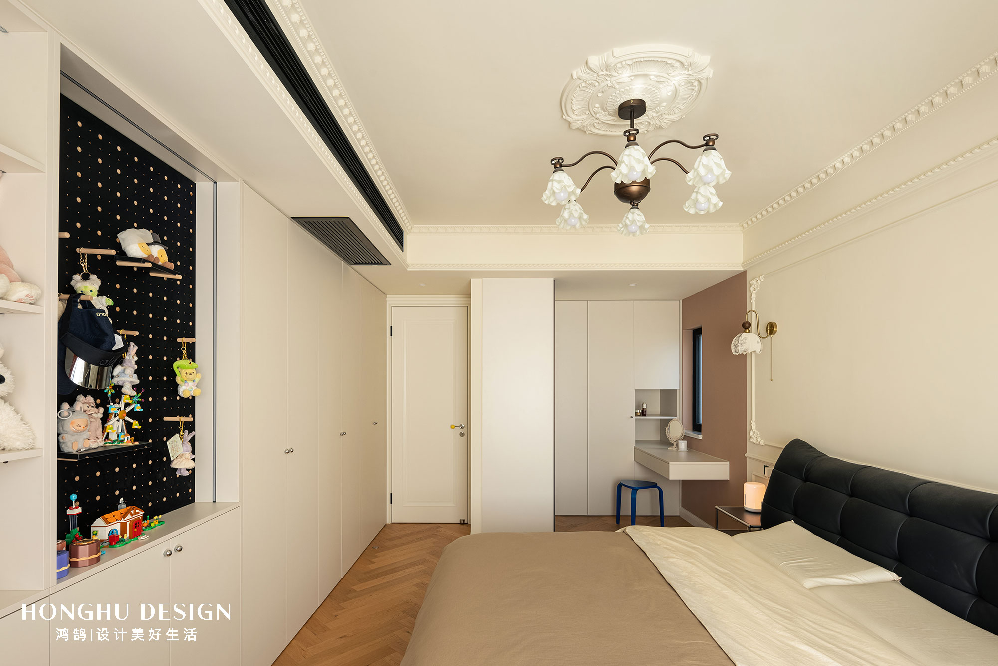 延续客餐厅的法式元素,线条与角花组合搭配顶面灯盘,打造法式风的精致感,背景墙面用低饱和度粉色分色,让素净的墙面有了亮点。 床尾整排衣柜搭配洞洞板以及开放置物区,实现收纳与展示的结合,打通原始卫生间作为衣帽间,增加收纳量。黑色皮质软包床搭配浅色床品,搭配金属框架床头柜以及复古造型壁灯,平衡空间的复古感与现代感。