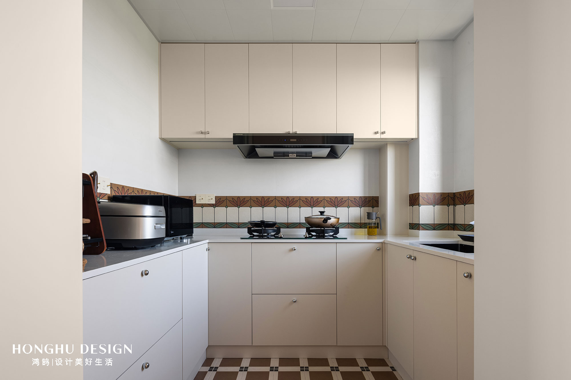 奶油色橱柜+复古花纹墙砖,延续法式的温柔复古,U型台面最大化利用操作空间。