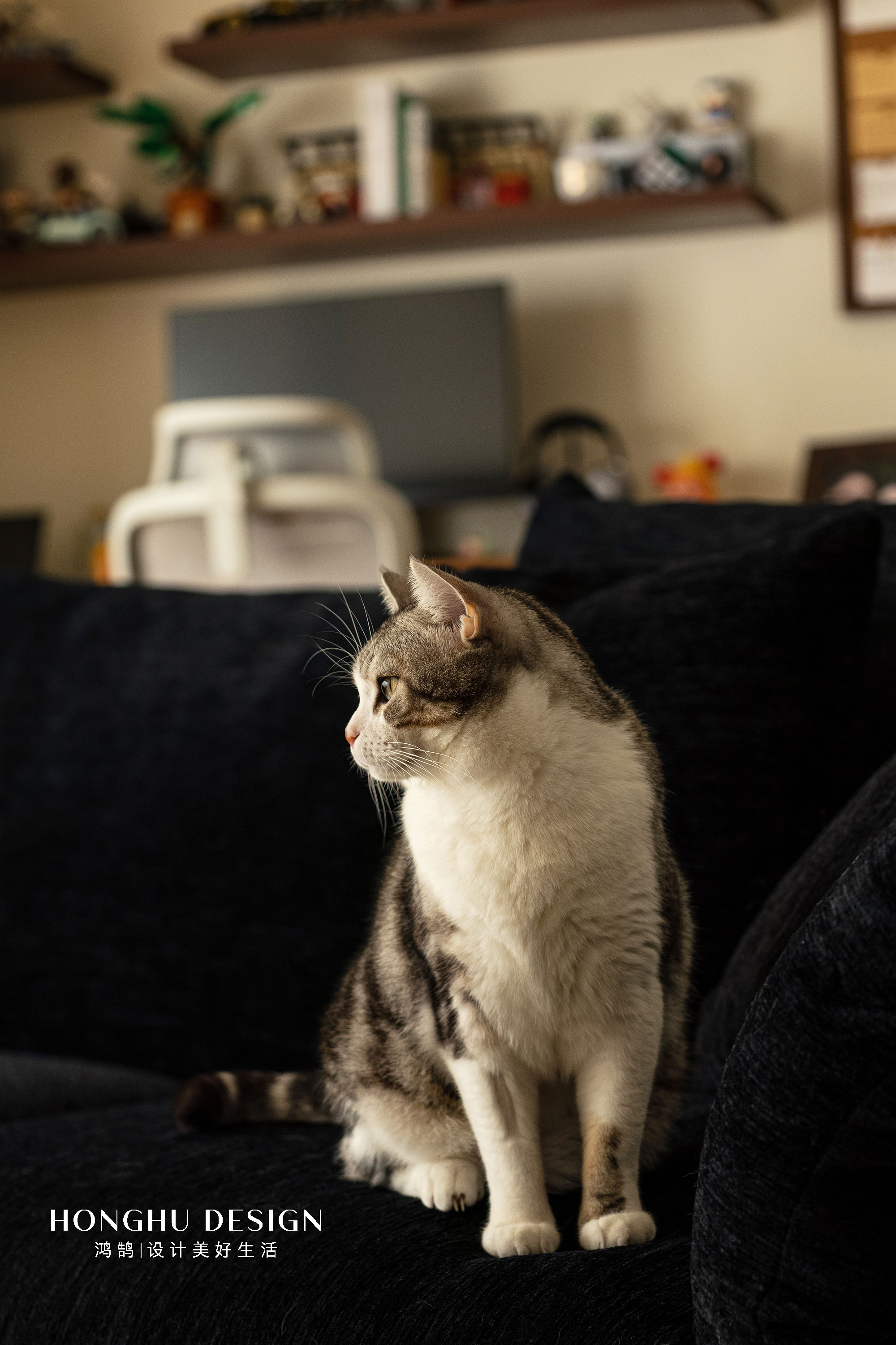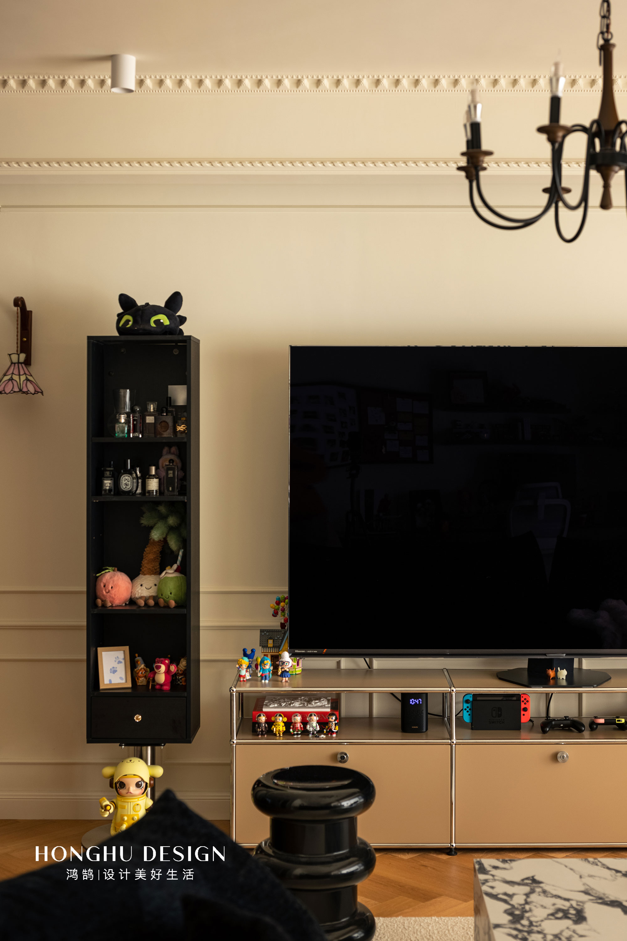 空间布局:深蓝花瓣沙发+奶白毛绒毯,以材质对比平衡厚重感;明黄色稻壳椅跳出高饱和亮色,消解法式的“距离感”;宝格丽大理石茶几、金属支架小边几,用现代材质提升精致度;墙面壁龛+盲盒手办,让收藏成为空间的“个性注脚”;慵懒卧在椅上的小猫,更让优雅空间晕染出生活烟火气。